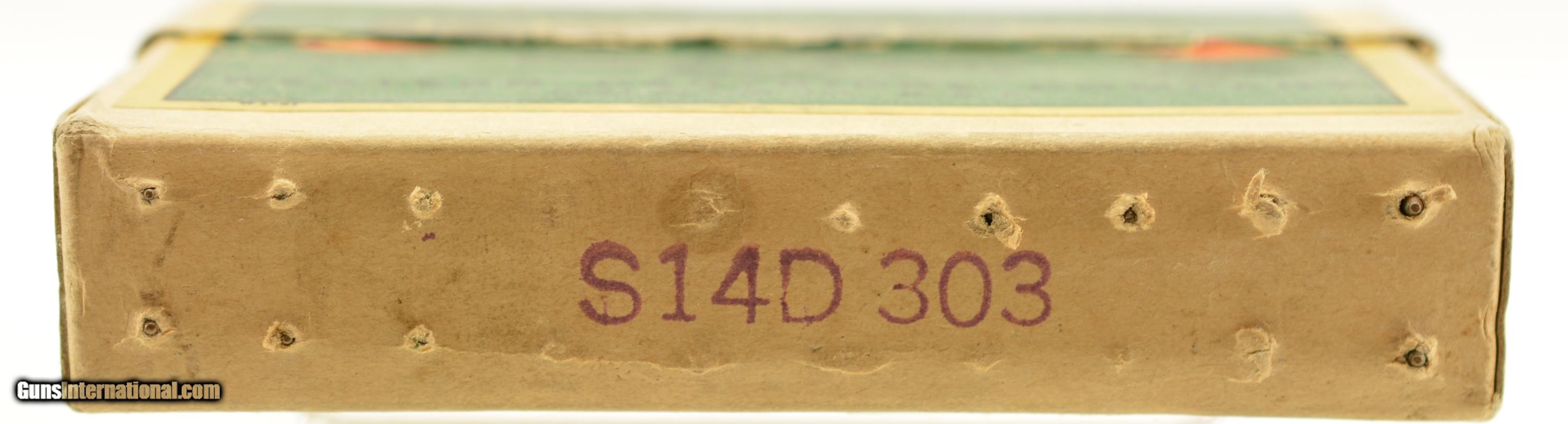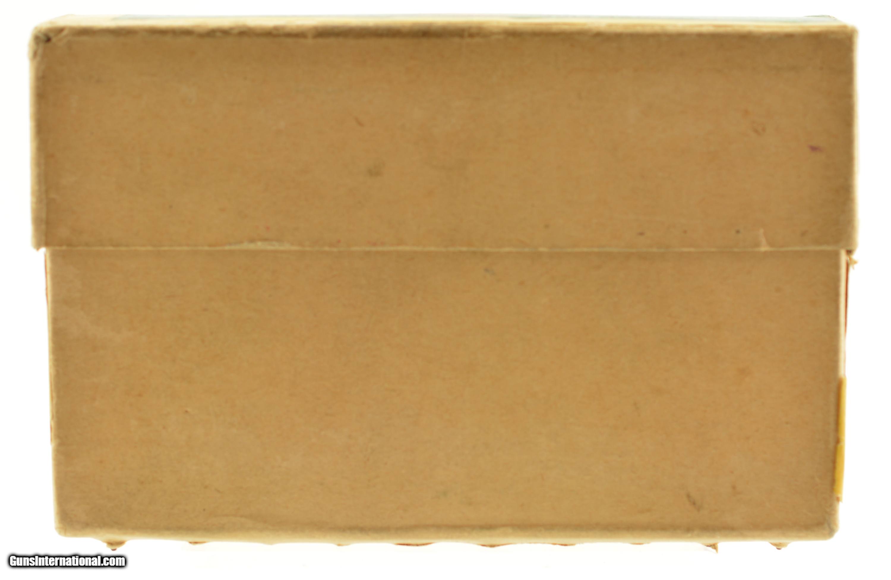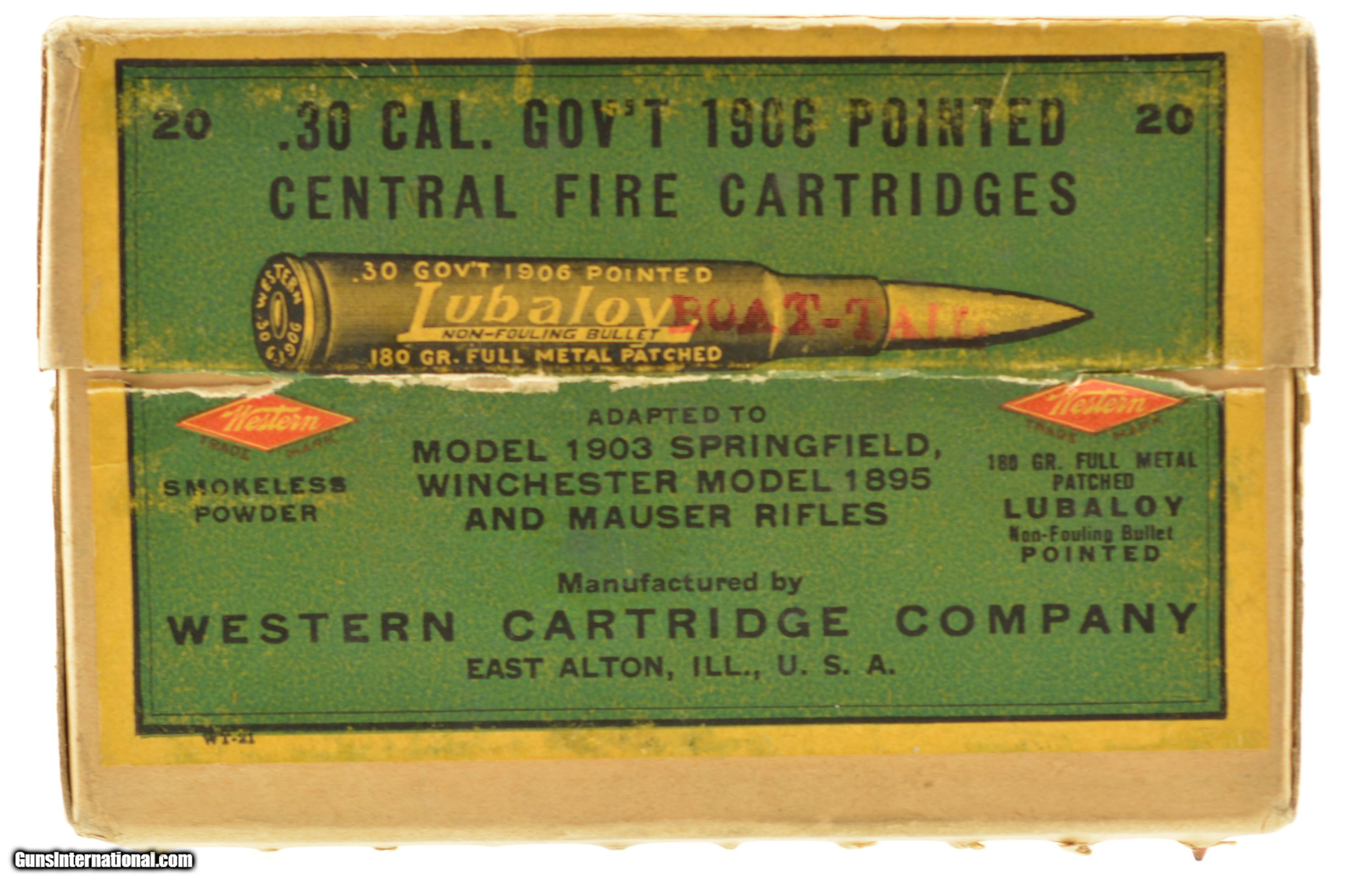Description: This is a full box, 20 original rounds, of .30 Government 1906 ammunition with 180 grain Lubaloy Boat-Tail full metal patched bullets. The two piece green and yellow label with red diamond Western logos has excellent primary and side labels with crisp graphics and bright color showing a detailed cartridge cut with Lubaloy logo and red overprint "BOAT-TAIL" type. The buff box is solid with tiny holes on the bottom where the pointed tips are peaking through. The cartridges are in excellent condition. SOLD |