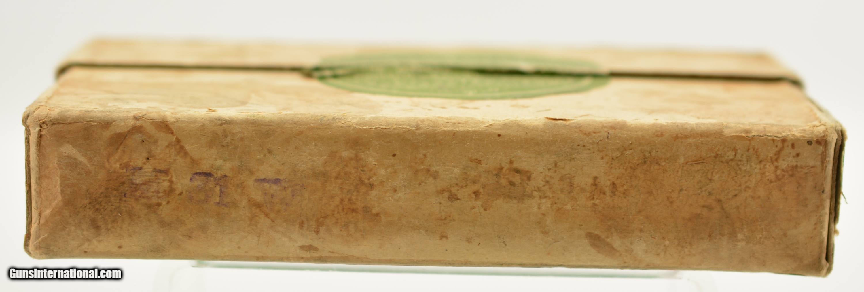 Description: This is a full and sealed box of .40-72 black powder ammunition manufactured by Reminton UMC with 330 grain lead bullets. The green and red labels are intact with some flaking having bright colors and a very nice cartridge cut featuring a call out for the Winchester model 1895 rifle. The rear guarantee label remains intact and is keeping the box sealed. The two piece buff box is mostly solid with some very slight seam separation on the top rear edge, light edge and corner wear along with some age soiling and staining. An excellent teens or early 1920's box. SOLD |