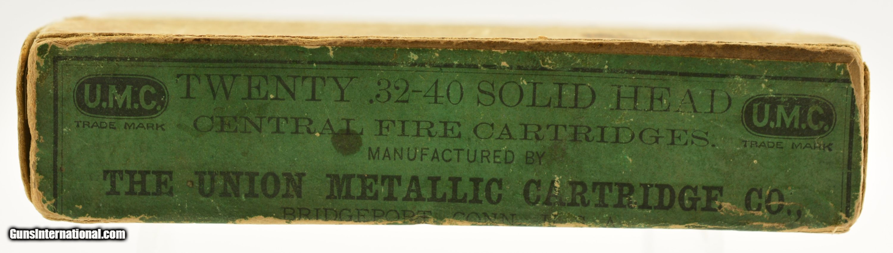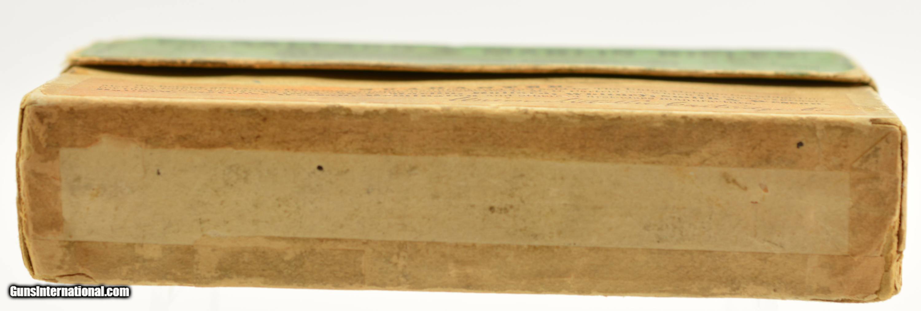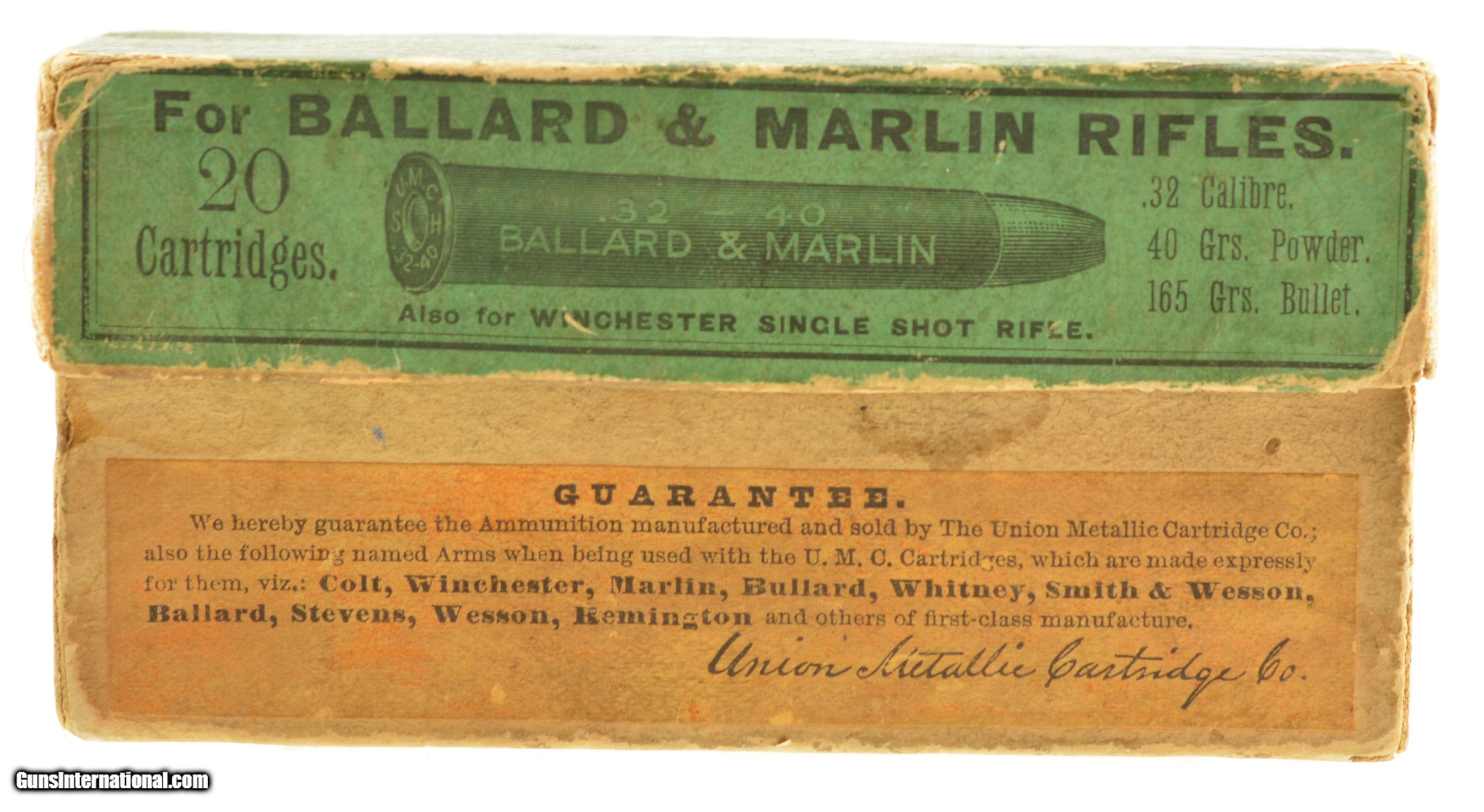 Description: This is a full box, 20 original rounds, of .32-40 Ballard & Marlin black powder ammunition manufactured by the Union Metallic Cartridge Company with 165 grain lead bullets. Believed to date circa 1889-1893 the two piece green primary label box has a very very nice cartridge cut with call out for Ballard & Marlin rifles along with the Winchester single shot rifle so pre-dating the Model 1894 Winchester. The scarce box show internal tape repairs to the seam split edges which have minor cardboard loss along with some flaking of the label. The cartridges are in excellent, bright condition with one showing age darkening. A very nice example of this early UMC box. SOLD |