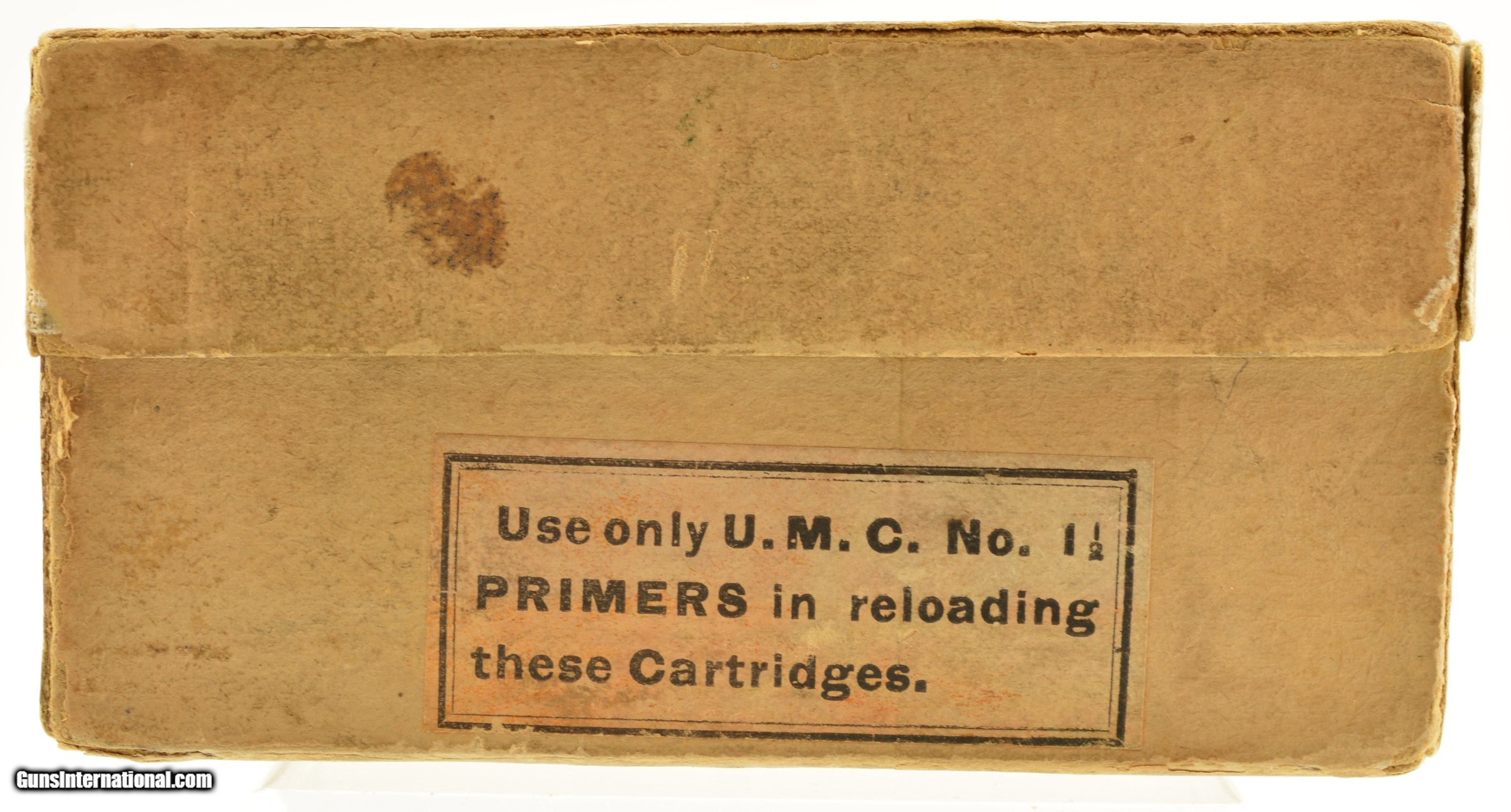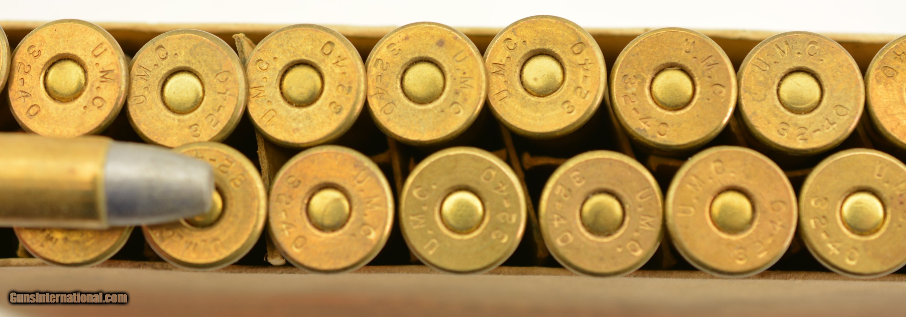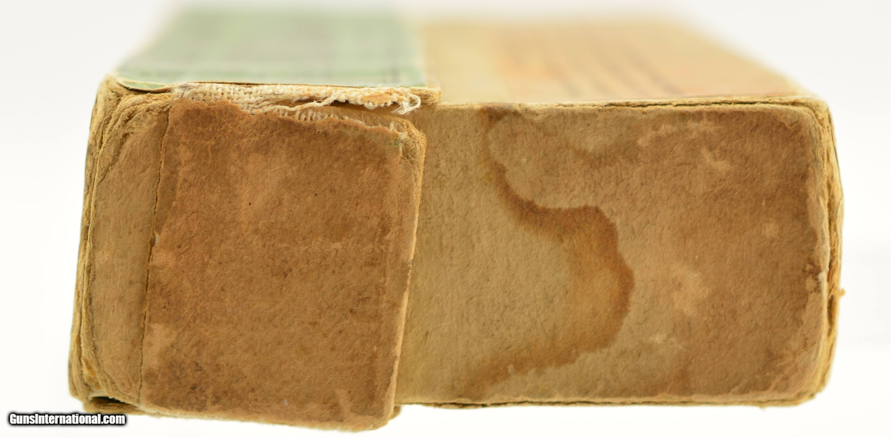 Description: This is a full box, 20 original rounds, of .32-40 Ballard & Marlin black powder ammunition manufactured by the Union Metallic Cartridge Company with 165 grain lead bullets. Believed to date circa 1889-1893 the two piece green primary label box has a very very nice cartridge cut with call out for Ballard & Marlin rifles along with the Winchester single shot rifle so pre-dating the Model 1894 Winchester. The scarce box show internal tape repairs to the seam split edges which have minor cardboard loss along with some flaking of the label. The cartridges are in excellent, bright condition with one showing age darkening. A very nice example of this early UMC box. SOLD |