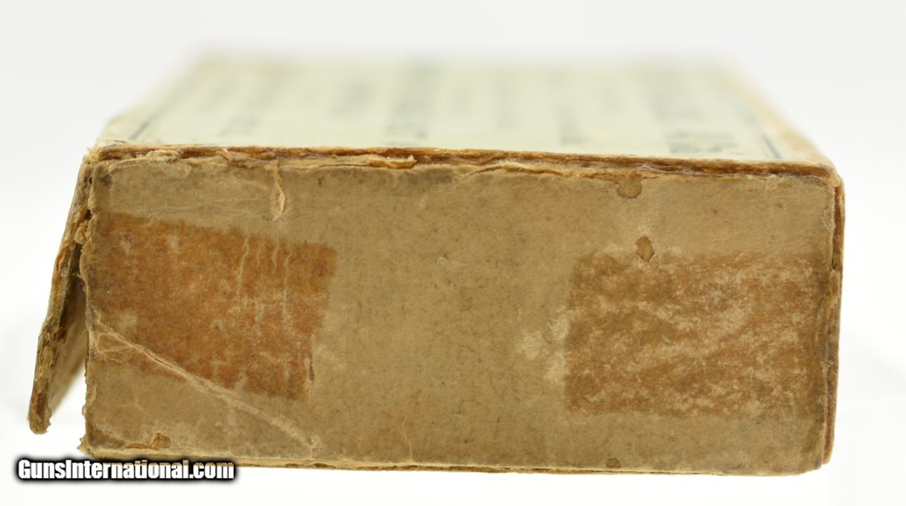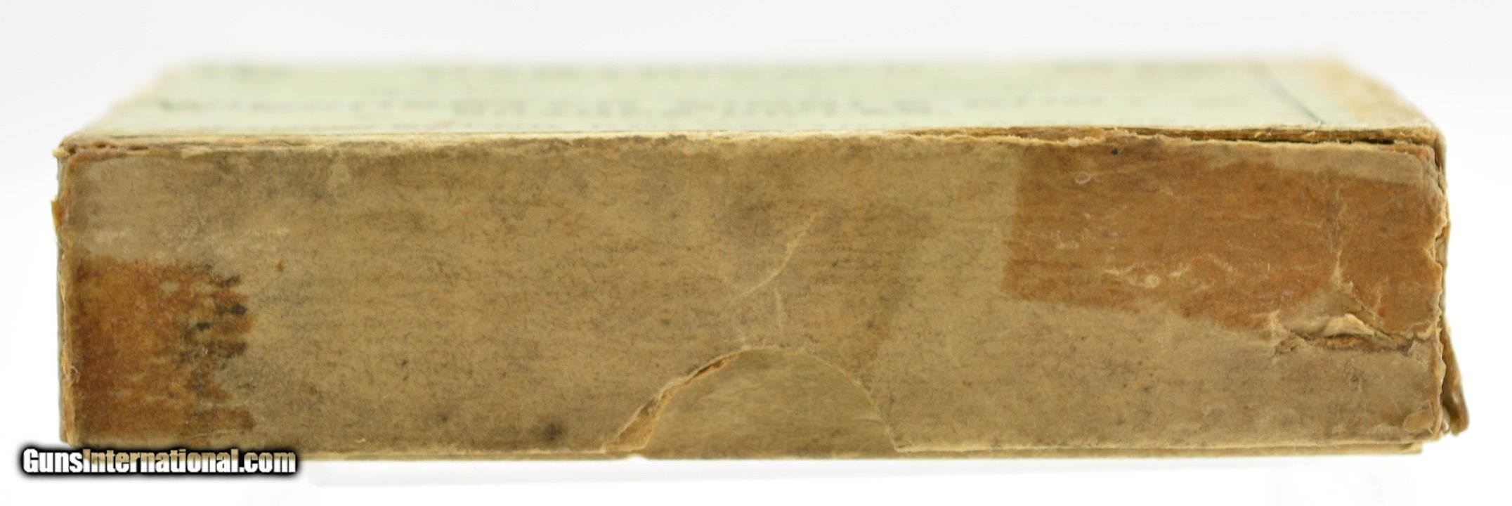 Description: This is a full box, 10 original rounds, of .40-90 SS (Single Shot) 3 ¼" black powder ammunition for Winchester 1885 and Sharps Rifles with 370 grain Patched bullets. The green primary and wrap around side label is intact with some staining and mild age soiling having call outs for Winchester Single Shot and Sharps rifles. The two piece buff box has professional repairs to several of the inside top corners with splits on the others and tape residue on the outside edges. The cartridges are in excellent condition with the original paper wrap on the ends of the cartridges to protect the paper patched bullets. A seldom-seen box with the rarer large Winchester rifle call out as identified by Giles & Shuey in One Hundred Years of Winchester Cartridge Boxes, 1856-1956 p105. SOLD |
