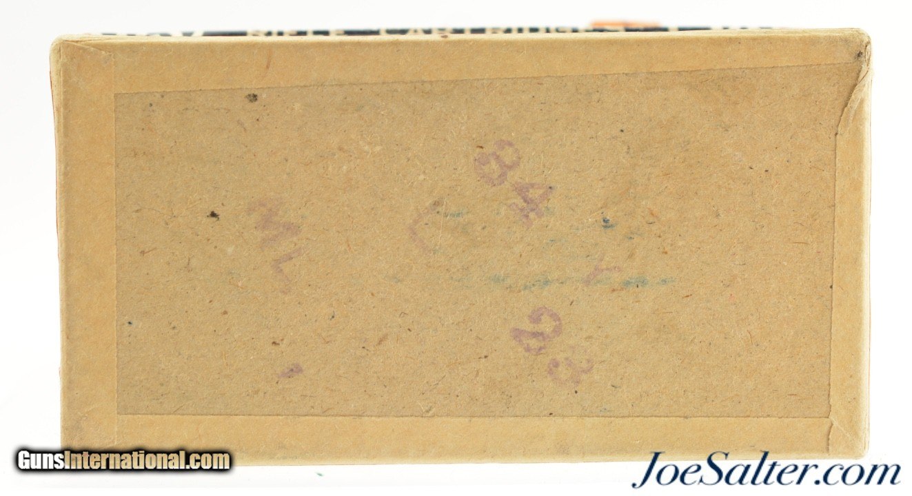 Description: This is a full and sealed box, 50 original rounds, of .38 S&W Special ammunition manufactured by the United States Cartridge Company. The two piece orange, blue and white box has the early Lowell, Mass address and remains in excellent condition with crisp graphics. A great box to display with your early Smith & Wesson or Colt revolver. Price: $125.00 Contact Seller |
