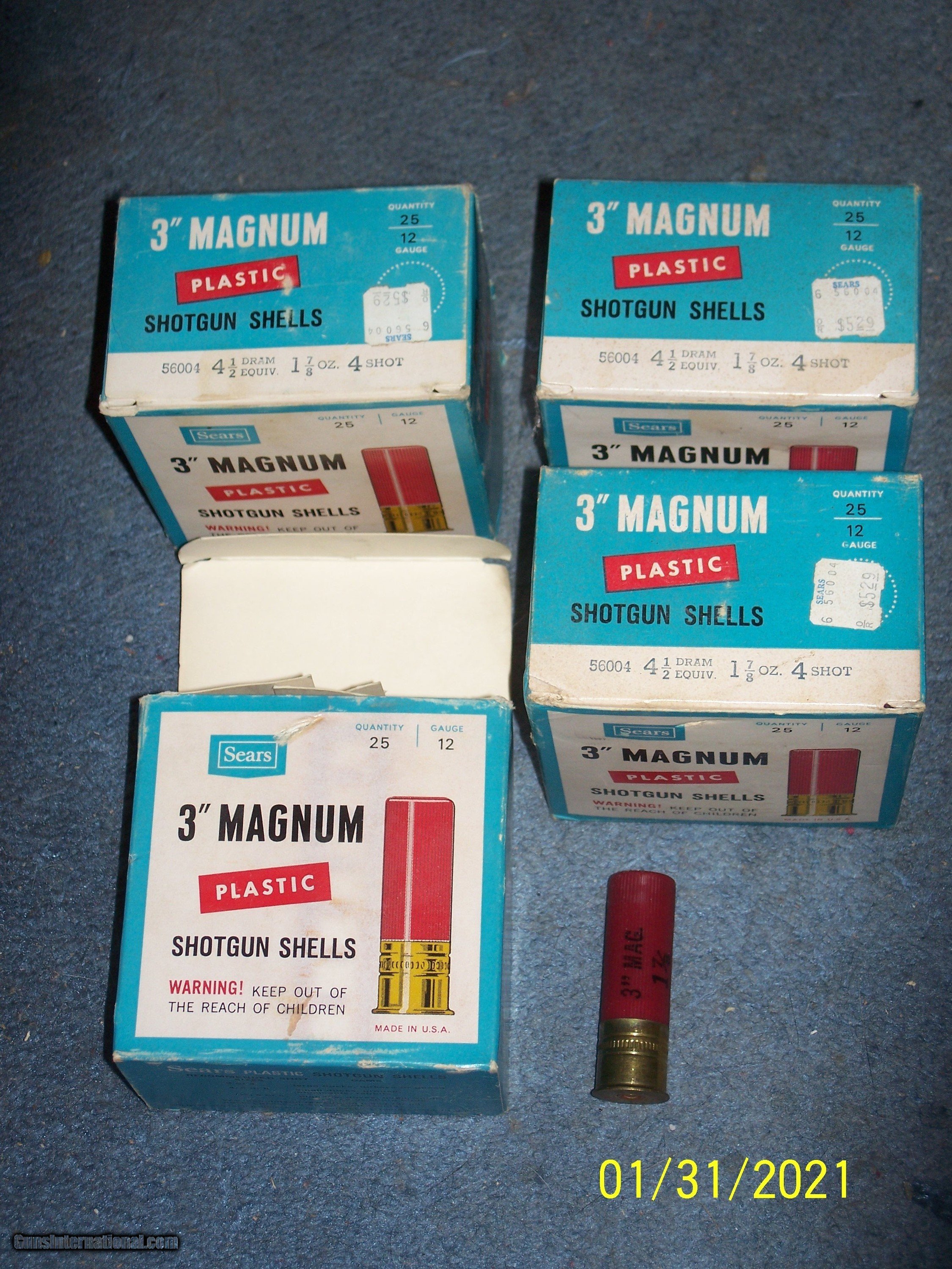 Description: 4 full boxes of ammo as shown. 12 gauge, 3" magnum loads. Total of 100 rounds. Perfect for Turkey hunting ! Plastic shells, made for Sears by Federal. Shipping is $20 to 48 states. We will not ship to CT, NY, NJ, HI, MD, IL, CA, or any town / state prohibiting ammo sales. We need a copy of your ID to process the order. SOLD |