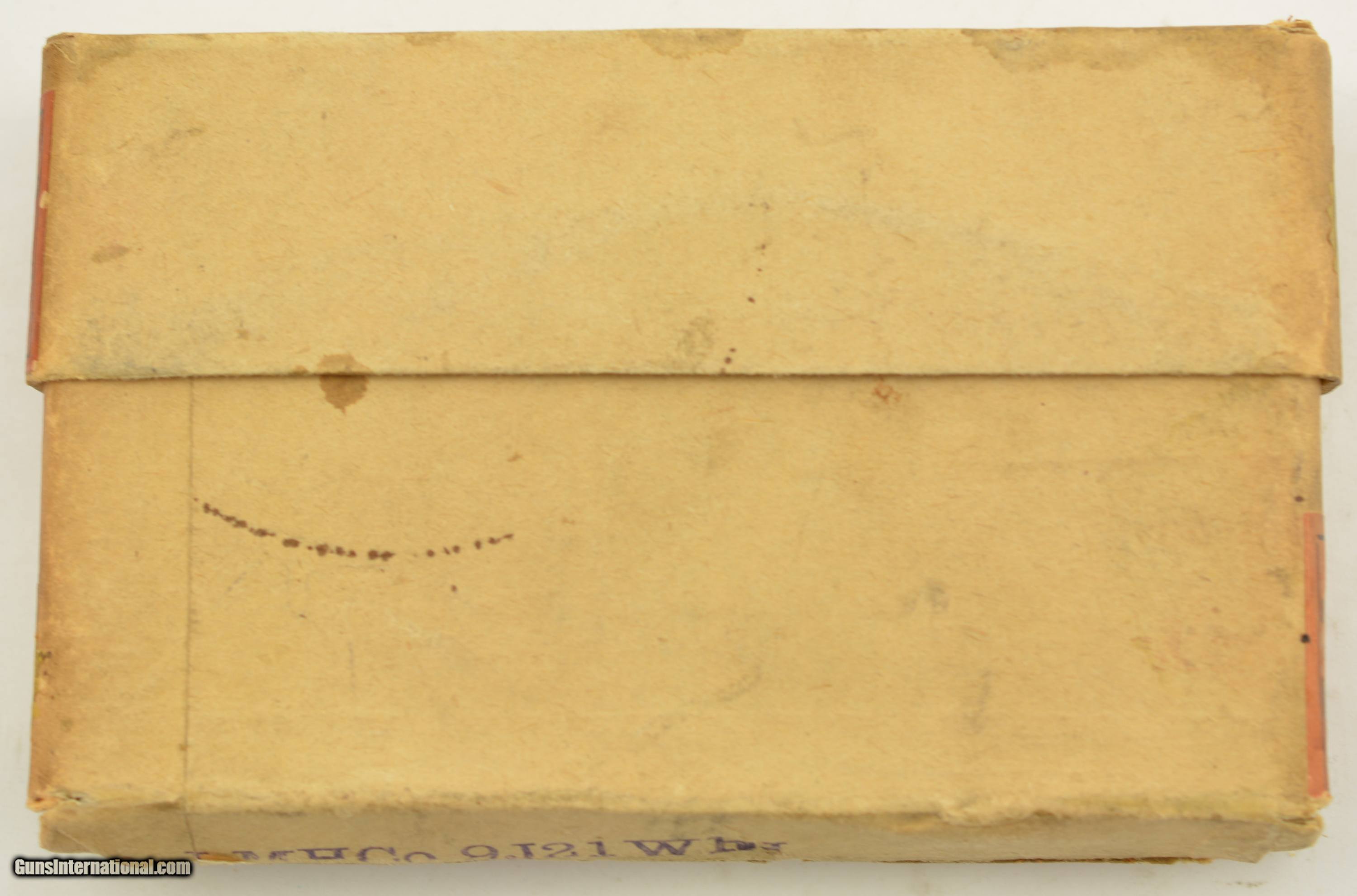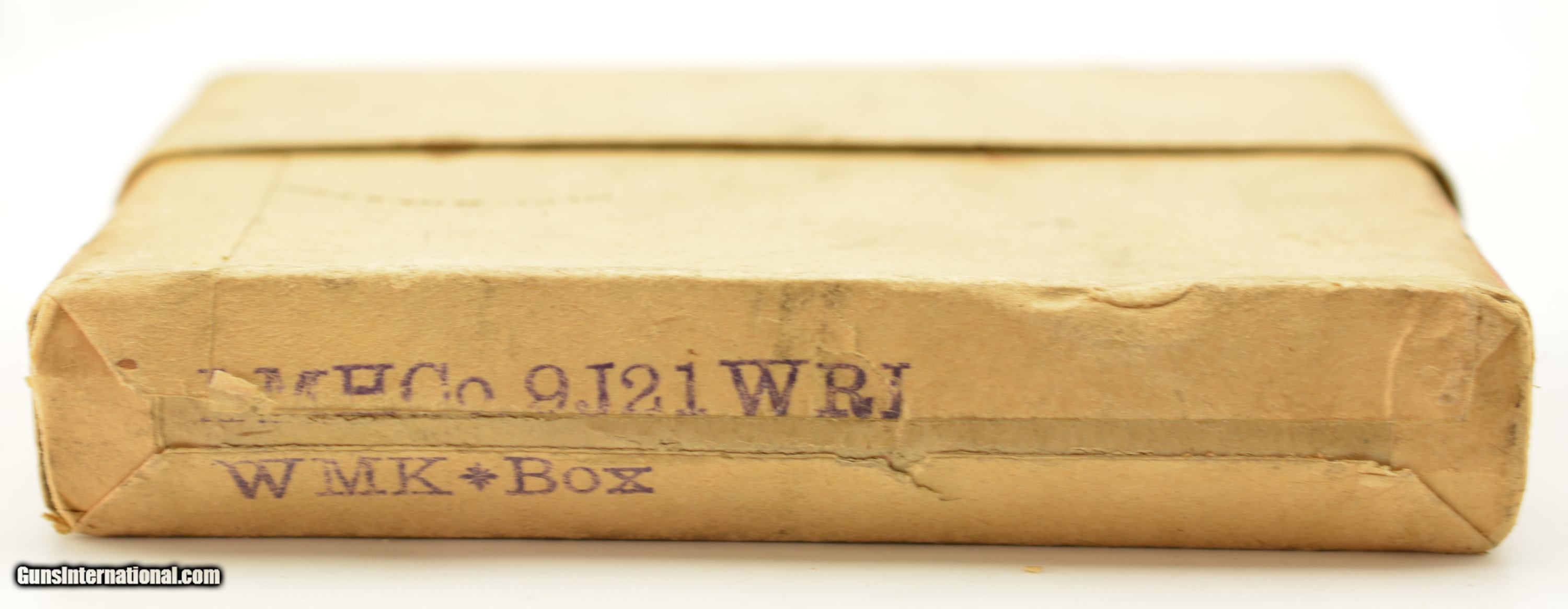 Description: This is a partial, 19 original rounds, of .35 Winchester ammunition manufactured by Winchester with 150 grain patched soft point bullets. The two piece, round corner box was manufactured between 1903-1905 and has complete top and side labels showing some light flaking and rub wear with seam separation on the bottom and top edges. The cartridges are in excellent condition with "W" primers. A hard to find box that will display well. SOLD |