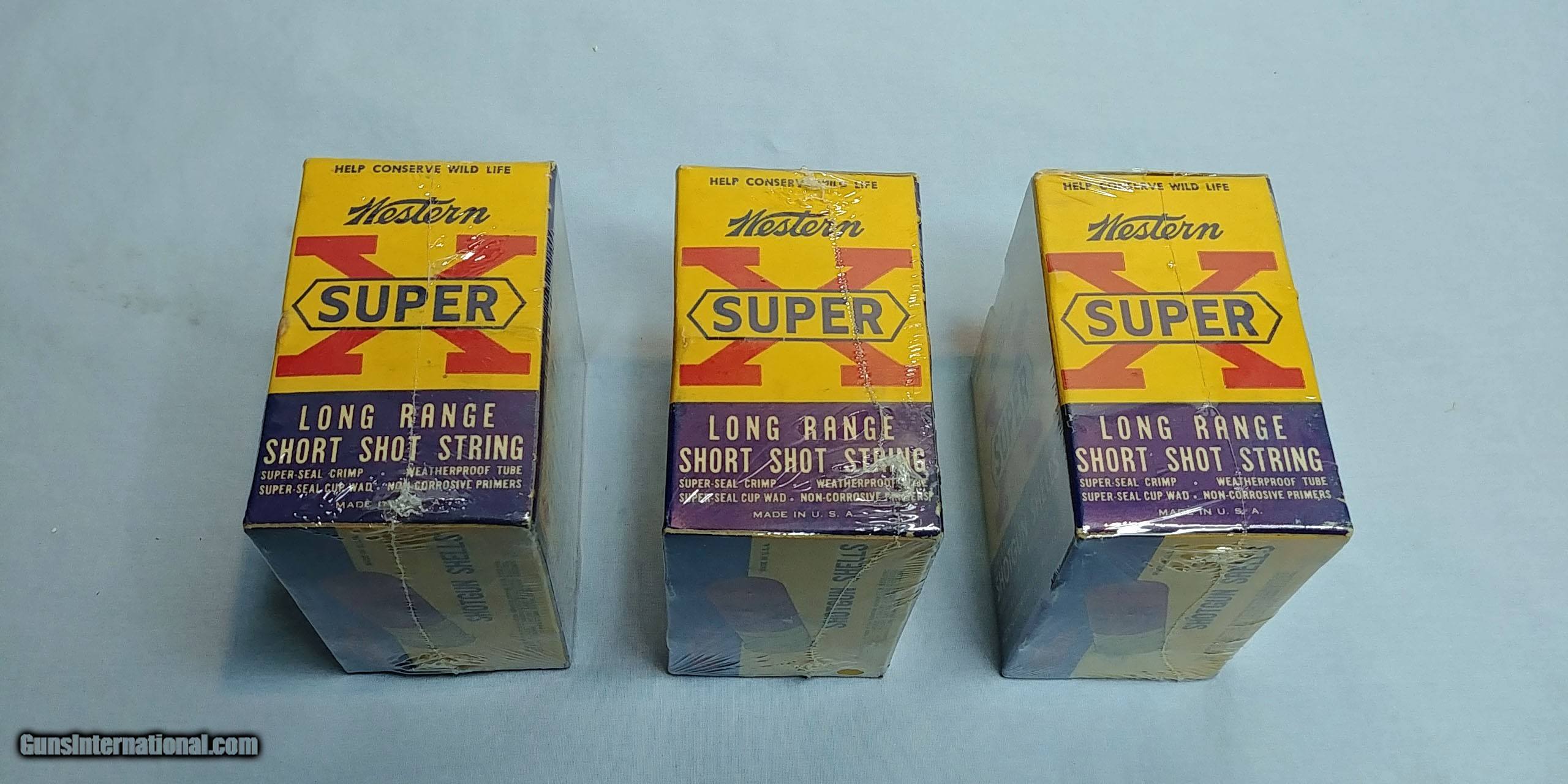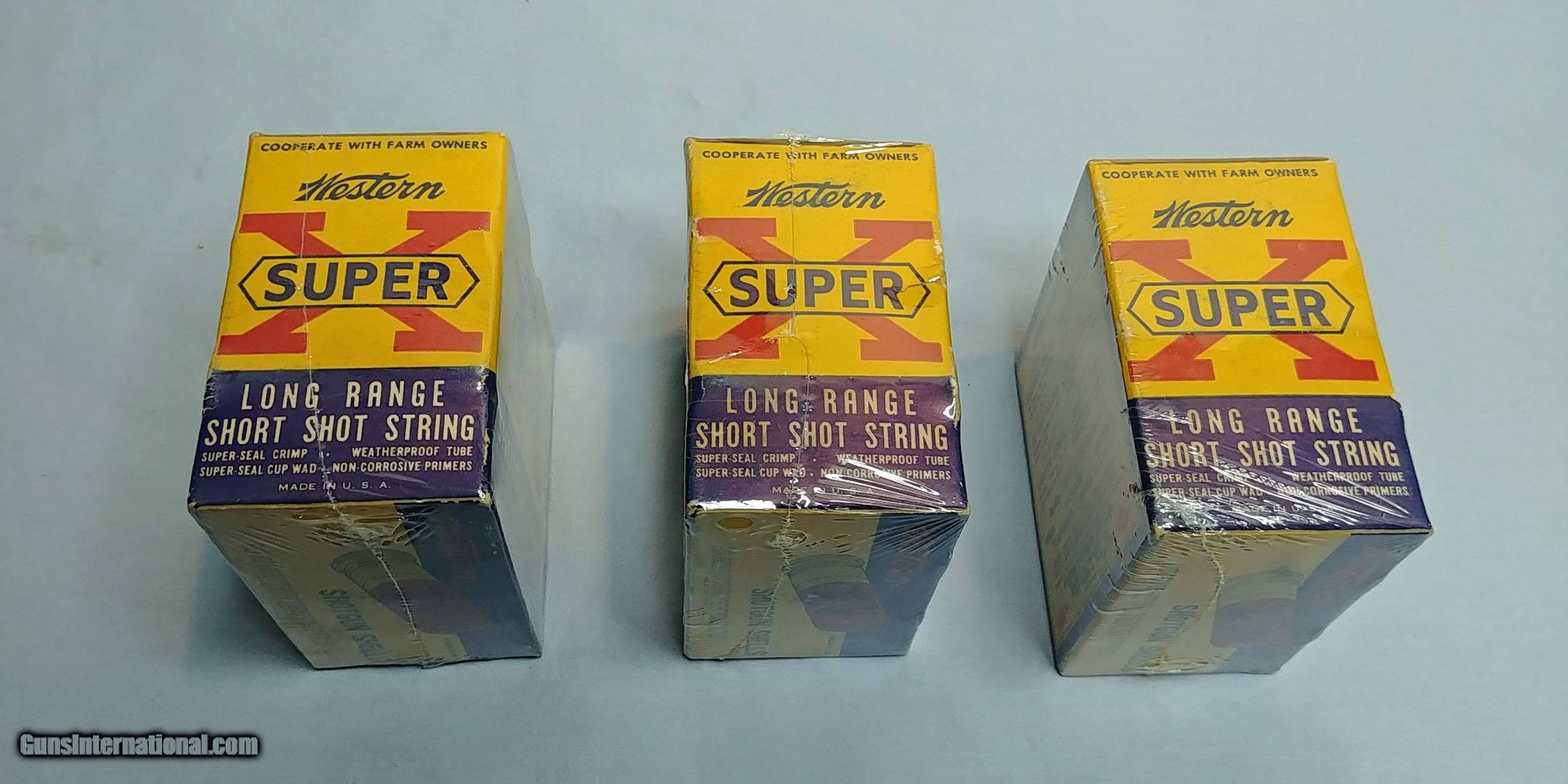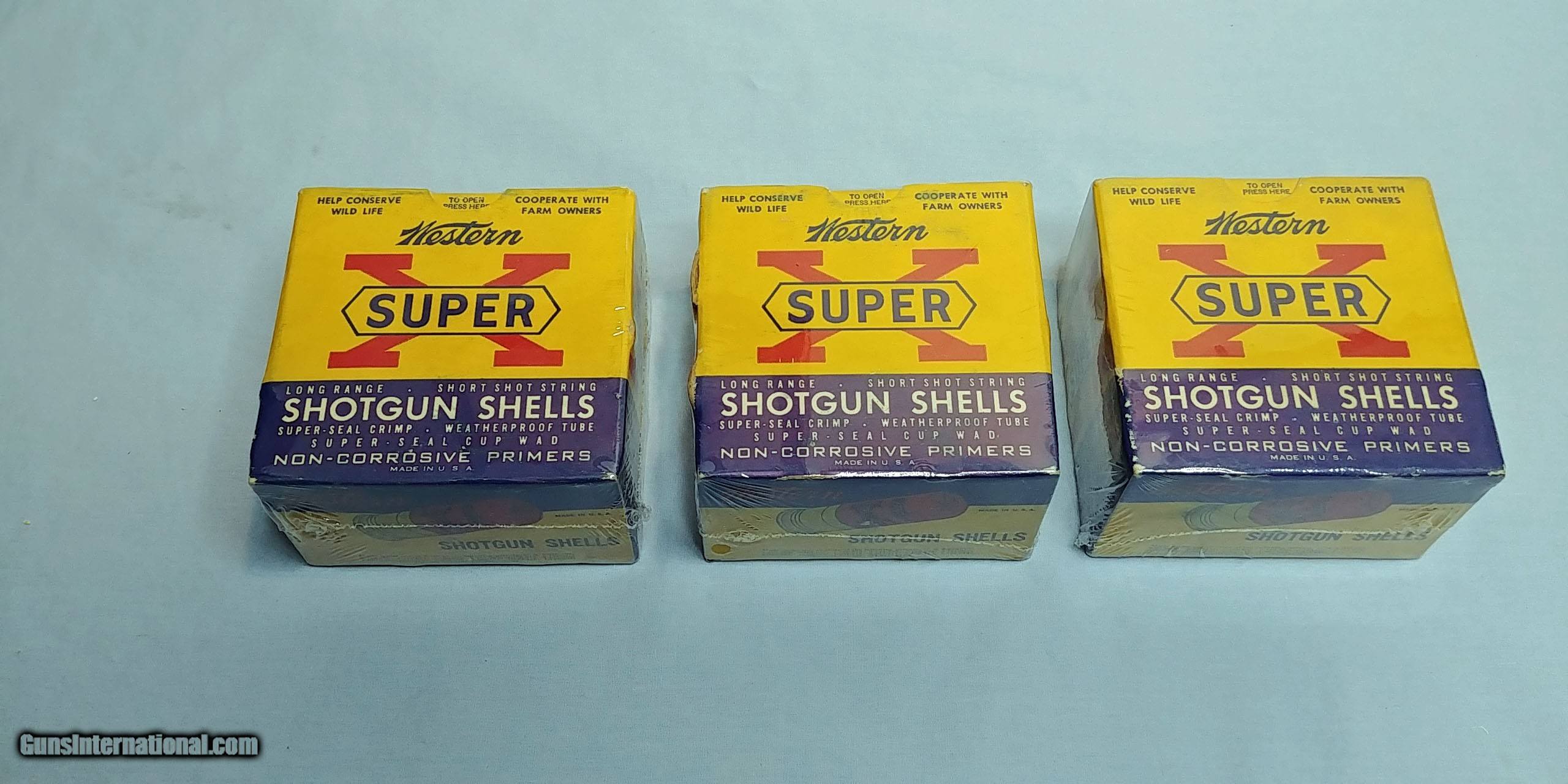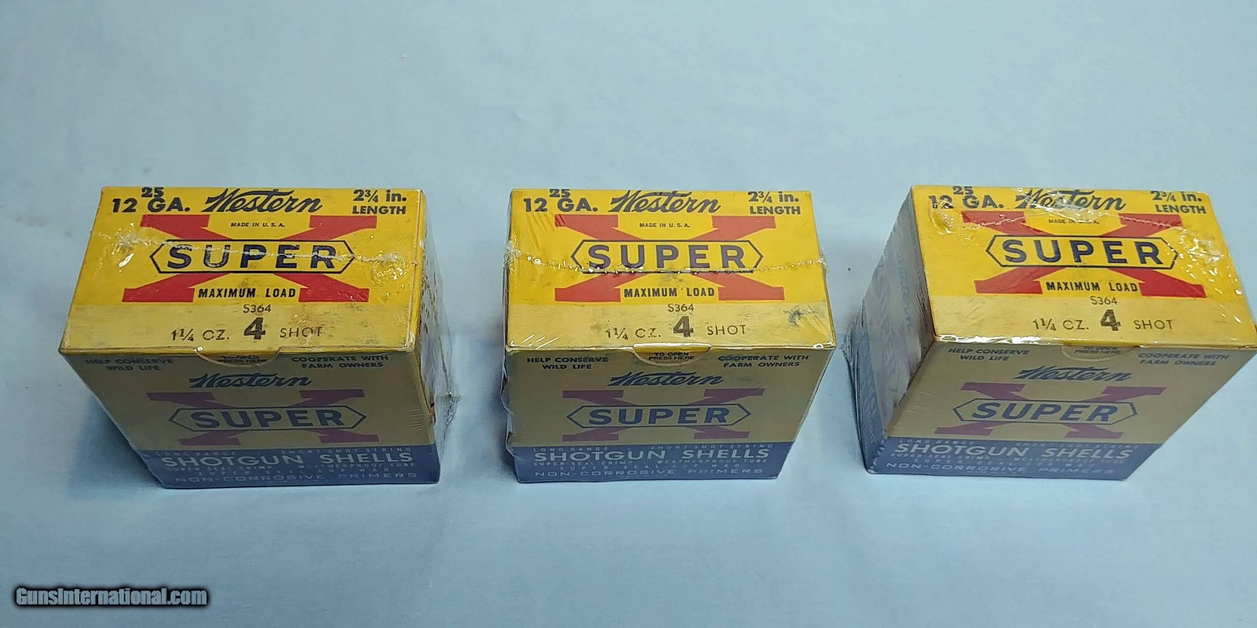 Description: Three full boxes of vintage Western Super-X 12 gauge 2 3/4" 1 1/4 oz #4 Shot shells. All three boxes of full of the original shells. I've shrink wrapped the boxes to further protect them. Shipping will be whatever the cheapest cost to ship to your address by UPS Ground. The package weight is 10 lbs. It is the buyer's responsibility to know their local laws prior to ordering ammunition. A buyer must be a minimum of 21 years old to purchase ammunition. Ammunition can only be shipped via ground delivery service. It can not be mailed to Post Office Box. If you'd like a shipping estimate, please send me an address or at least a zipcode as to where the item would be sent. Payment by certified check, money order or personal check. If paying by personal check shipping will be delayed until check clears. I DO NOT ship to: CA, CT, AK, HI, NY, NJ, IL, Washington D.C. SOLD Shotgun Gauge: 12 Gauge |