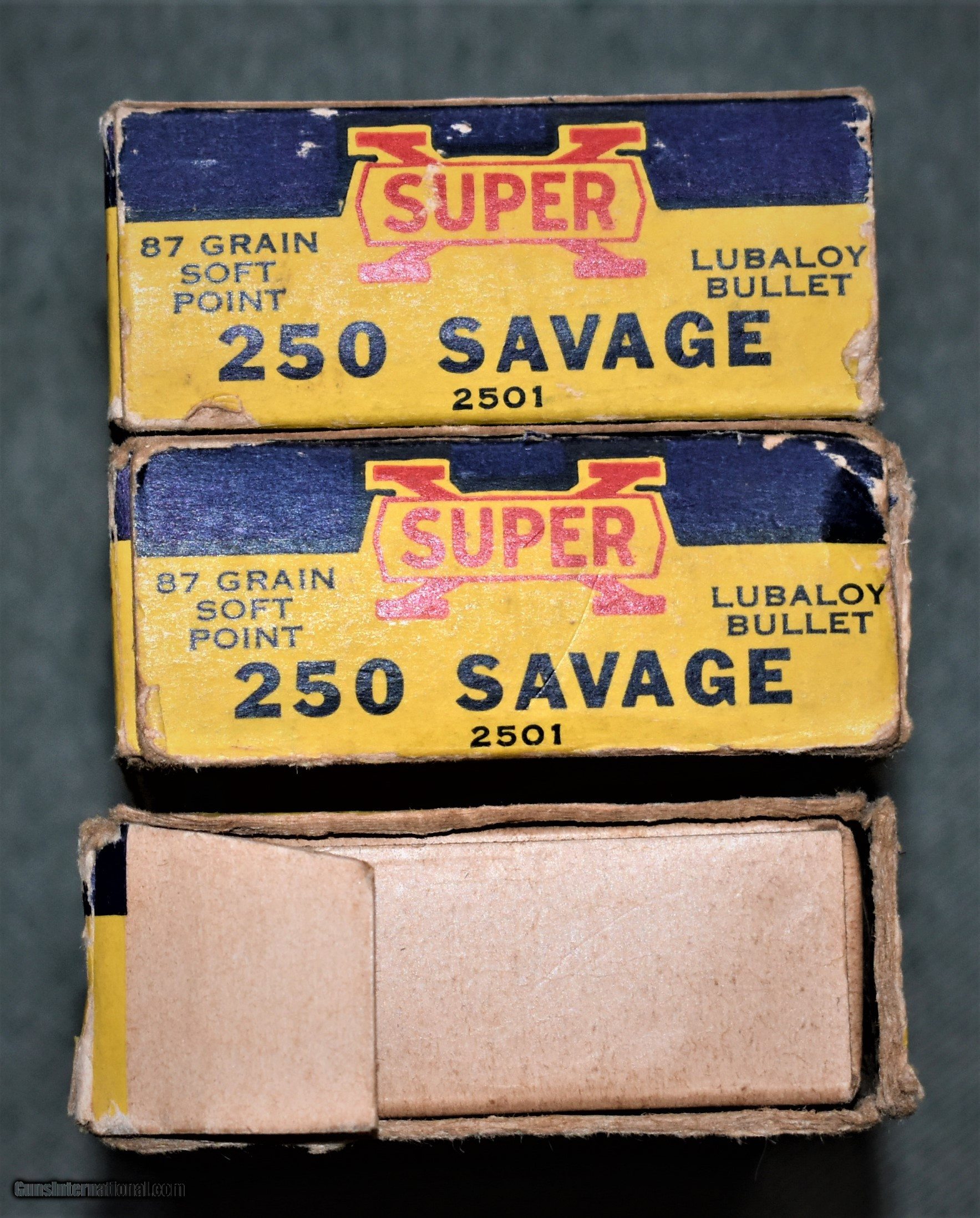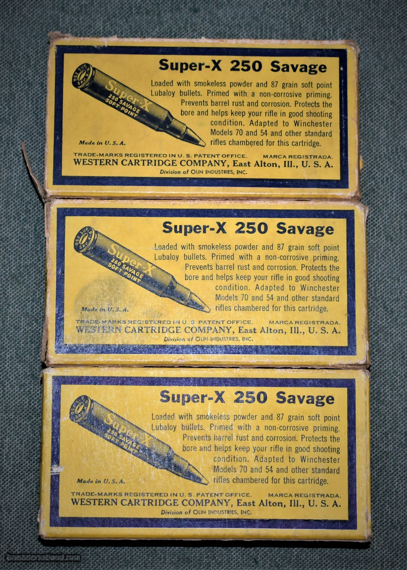 Description: Three full boxes of Winchester Western Super-X 250 Savage in the hard to find 87 grain soft point. All rounds are factory loaded and are in excellent condition. One box is missing an end flap. Other than that the boxes are in good condition with bright graphics. SOLD Rifle Caliber: .250-3000 Savage |