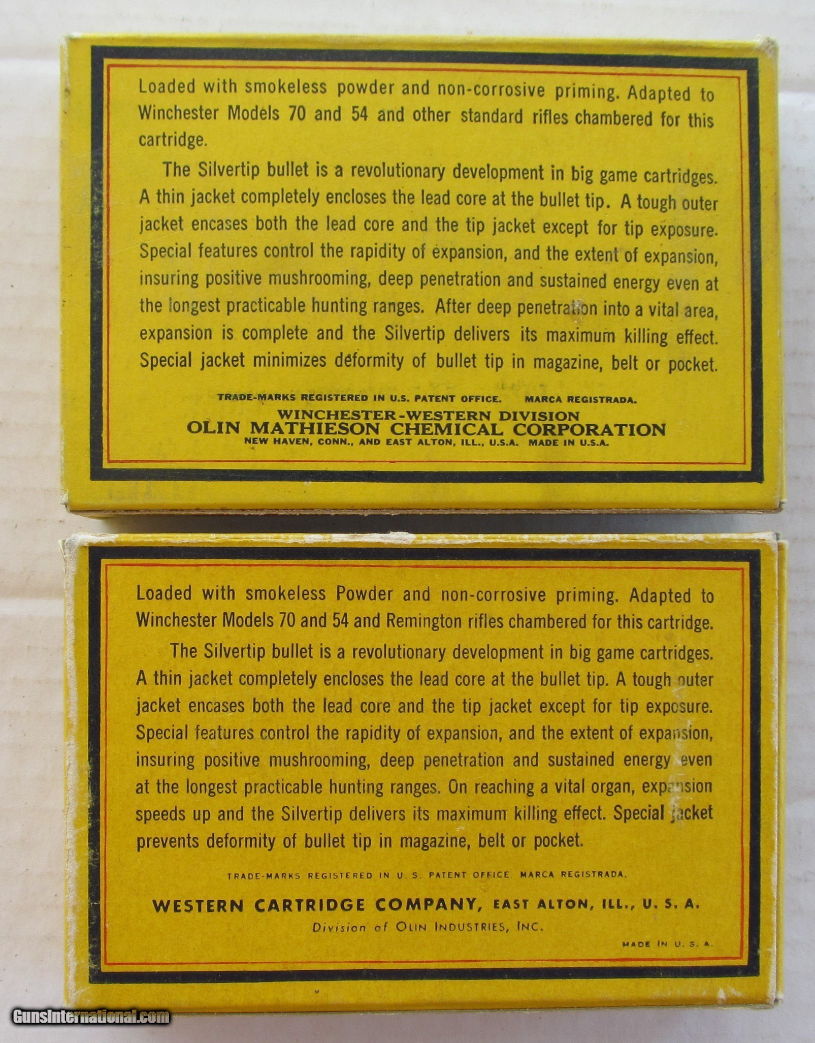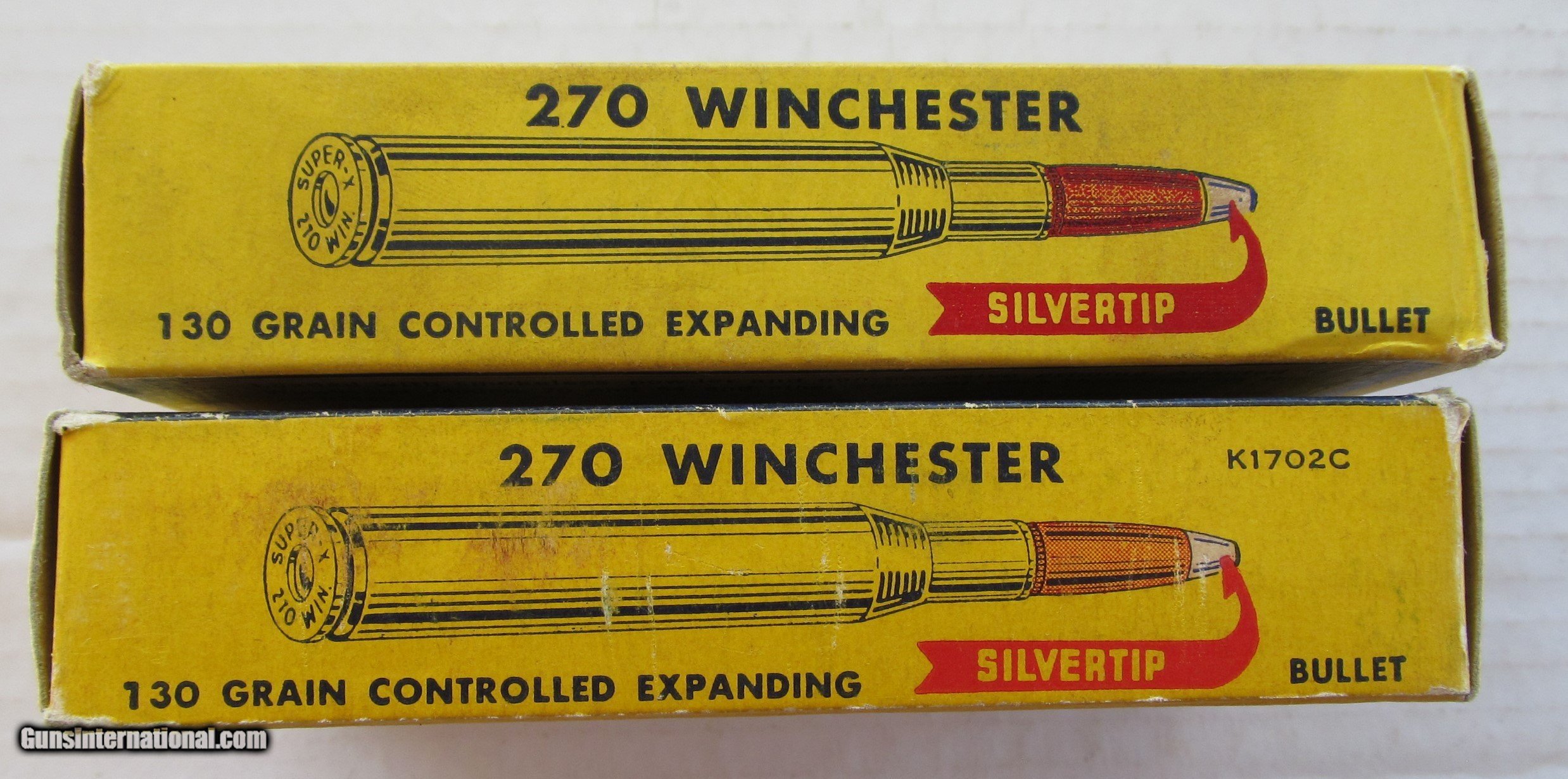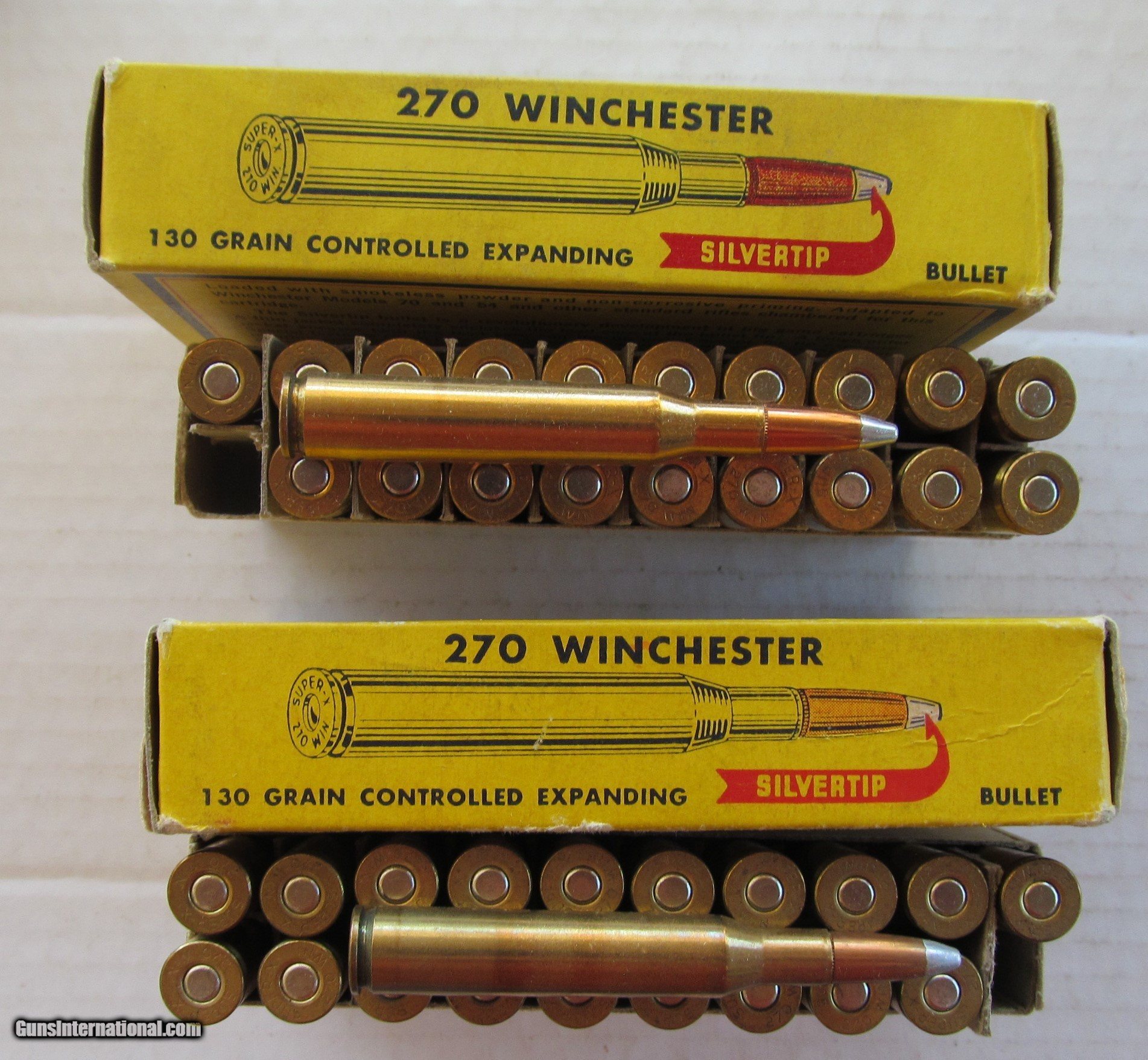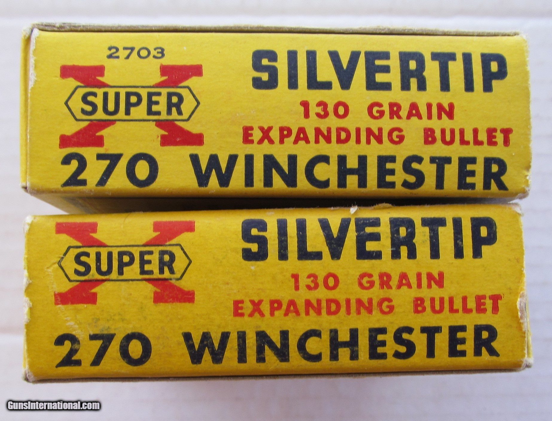Description: Two full boxes of Western Super-X 270 Winchester 130 Grain Silvertip Bullets, boxes are in excellent condition having all flaps fully attached. $50.00 for both boxes 40 cartridges and $15.50 for UPS ground shipping to CONUS 48 USA. Should you have any questions please email me. It must be legal for you to possess and for me to ship this ammunition to you. Thanks SOLD $50.00 SOLD Rifle Caliber: .270 Winchester |