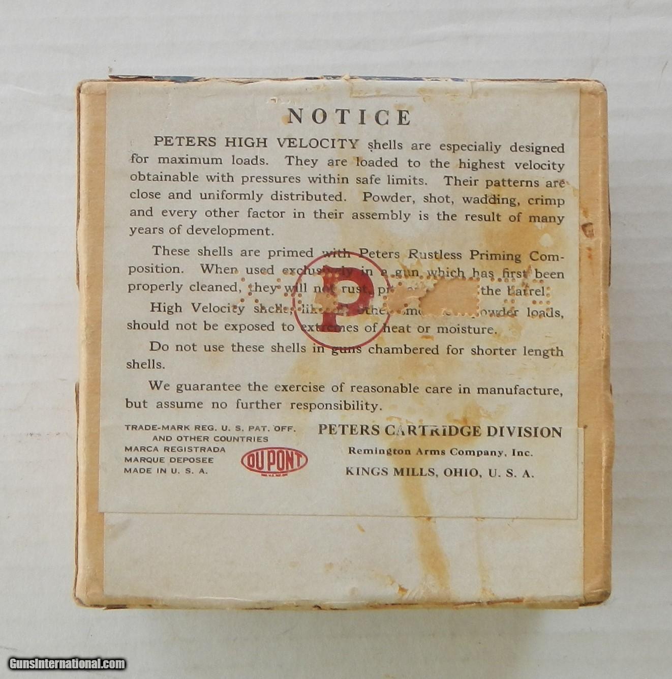 Description: Here is one of the always Popular Peters Blue Bill High Velocity two piece Rustless 12 gauge #4 Chilled Shot, full and correct, shells are Mint. All sides have been photographed for your review. Price includes UPS shipping to USA CONUS 48. Please email me should you have any questions. Thanks SOLD SOLD |