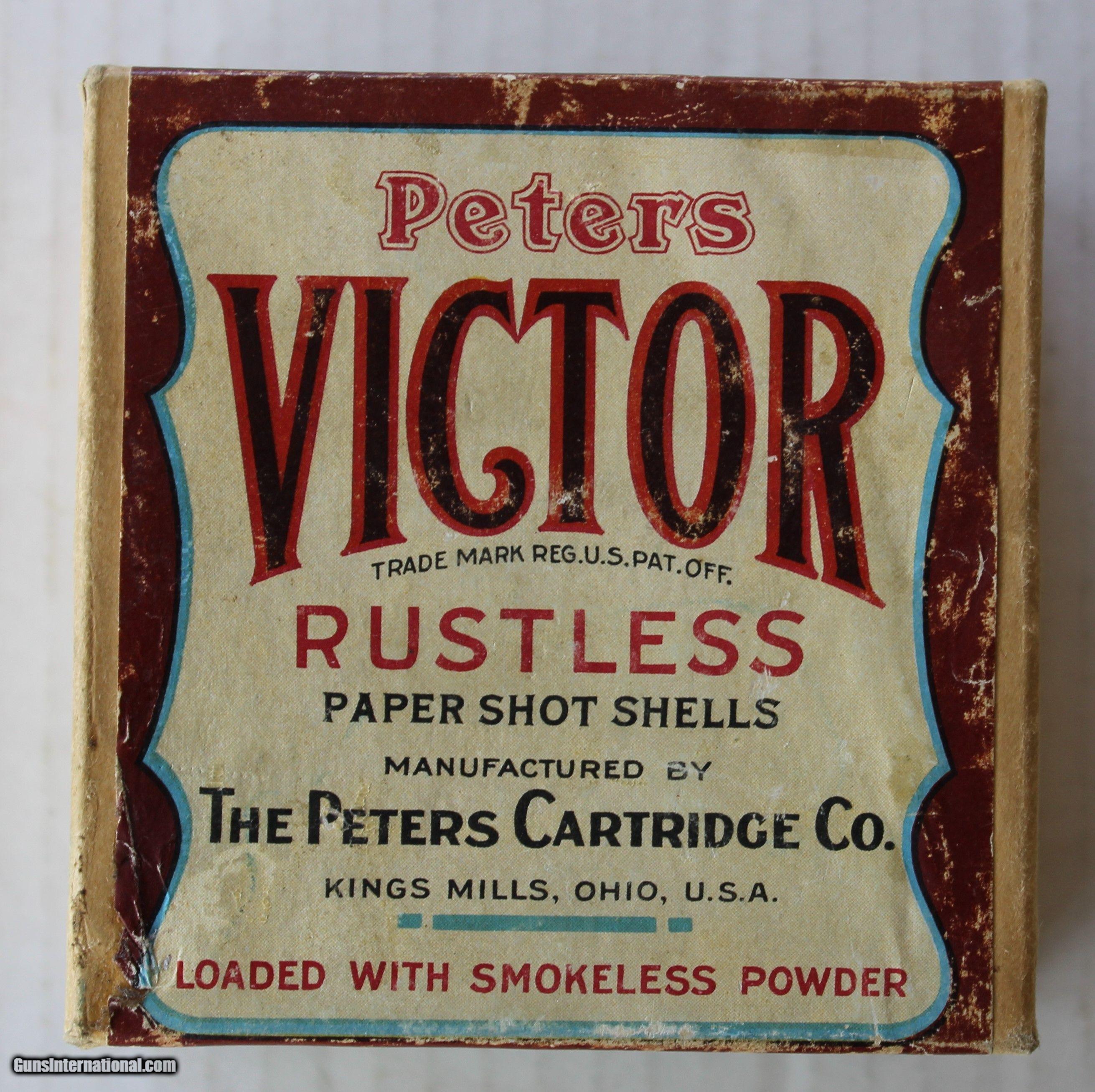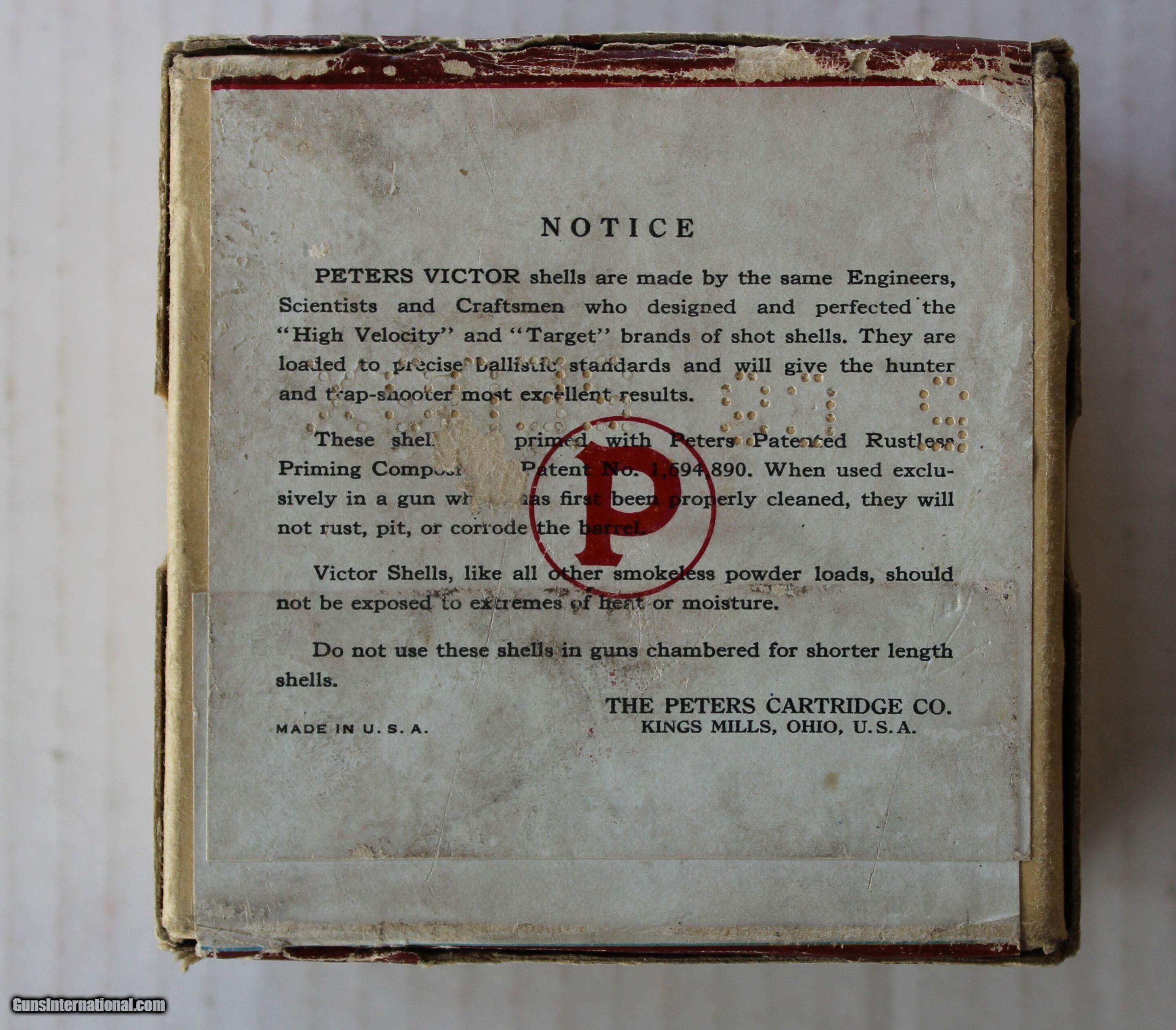 Description: Empty Peters two piece Victor Rustless 16 gauge shot shell box, 2 9/16th length, 7 1/2 chilled shot. Has original price of .80 cents which I believe is done in grease pencil. No shell bulges on this two piece box which is nice, has the original bottom, nice box in 16 gauge. Has the Kings Mills, Ohio address, this is circa late 1920's issue. I have pictured all sides so you can determine the condition of the box. Please email me if you have any questions about this box. Mailed to USA CONUS 48 va Priority Mail so please add $7.50. Thanks SOLD |