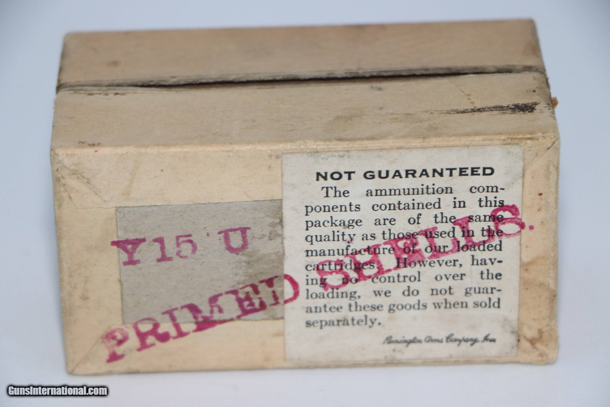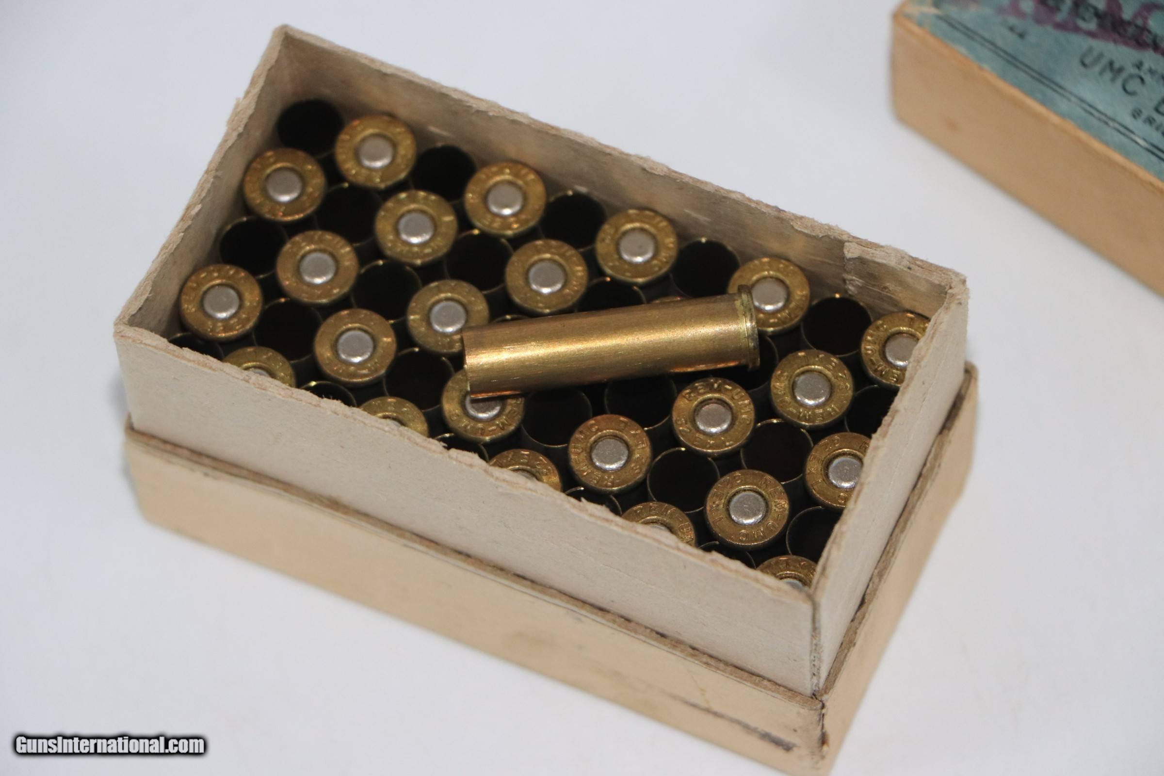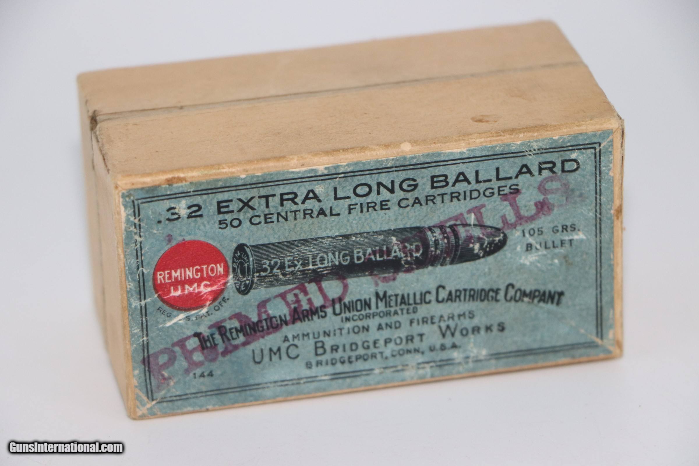 Description: 32 Extra Long Ballard Primed Brass by Rem Arms UMC Metallic Cartridge Co. Brass is excellent, half-split box is VG with a few scuffs. 1910s. Code: 144. Add 11.50 S+H SOLD Rifle Caliber: .32 |