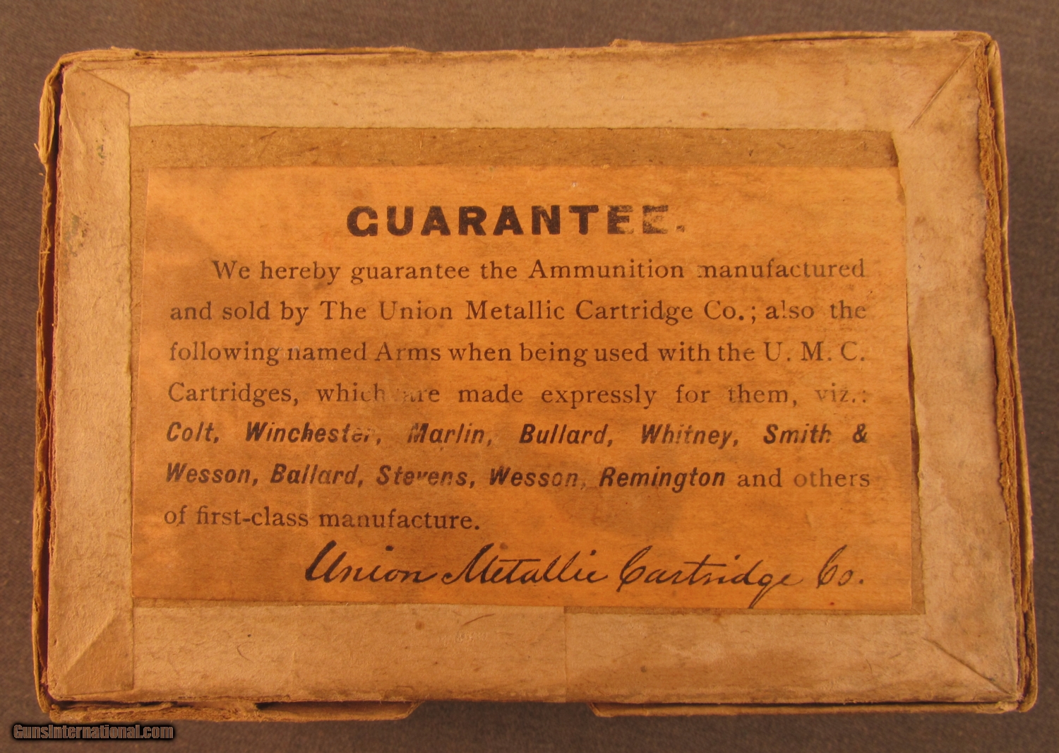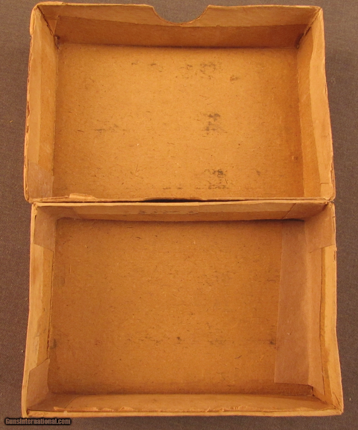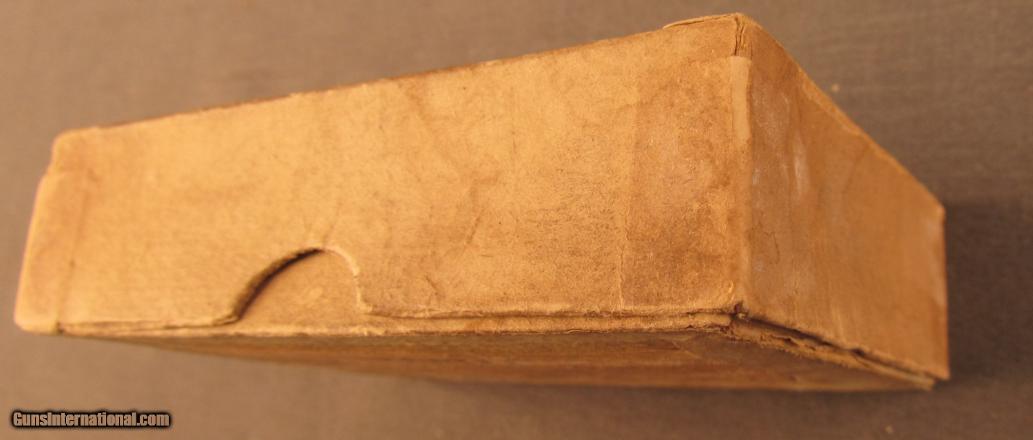 Description: This empty two piece empty box is from around 1890, it remains in very good condition with shelf wear and light scuffing . Top also shows a tiny hole. Top has one repaired corner, bottom shows repairs to three corners and one bottom edge. The orange guarantee label on bottom shows very little wear with printing completely legible. This scarce caliber was introduced in 1886 and discontinued by 1904. A great item to display with a high wall rifle. SOLD Manufacturer: UMC Model: AMMO Caliber Info: .38-90 Gauge Info: .38-90 |