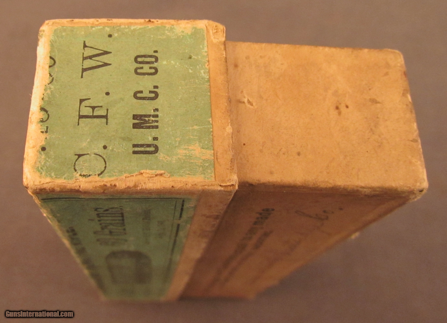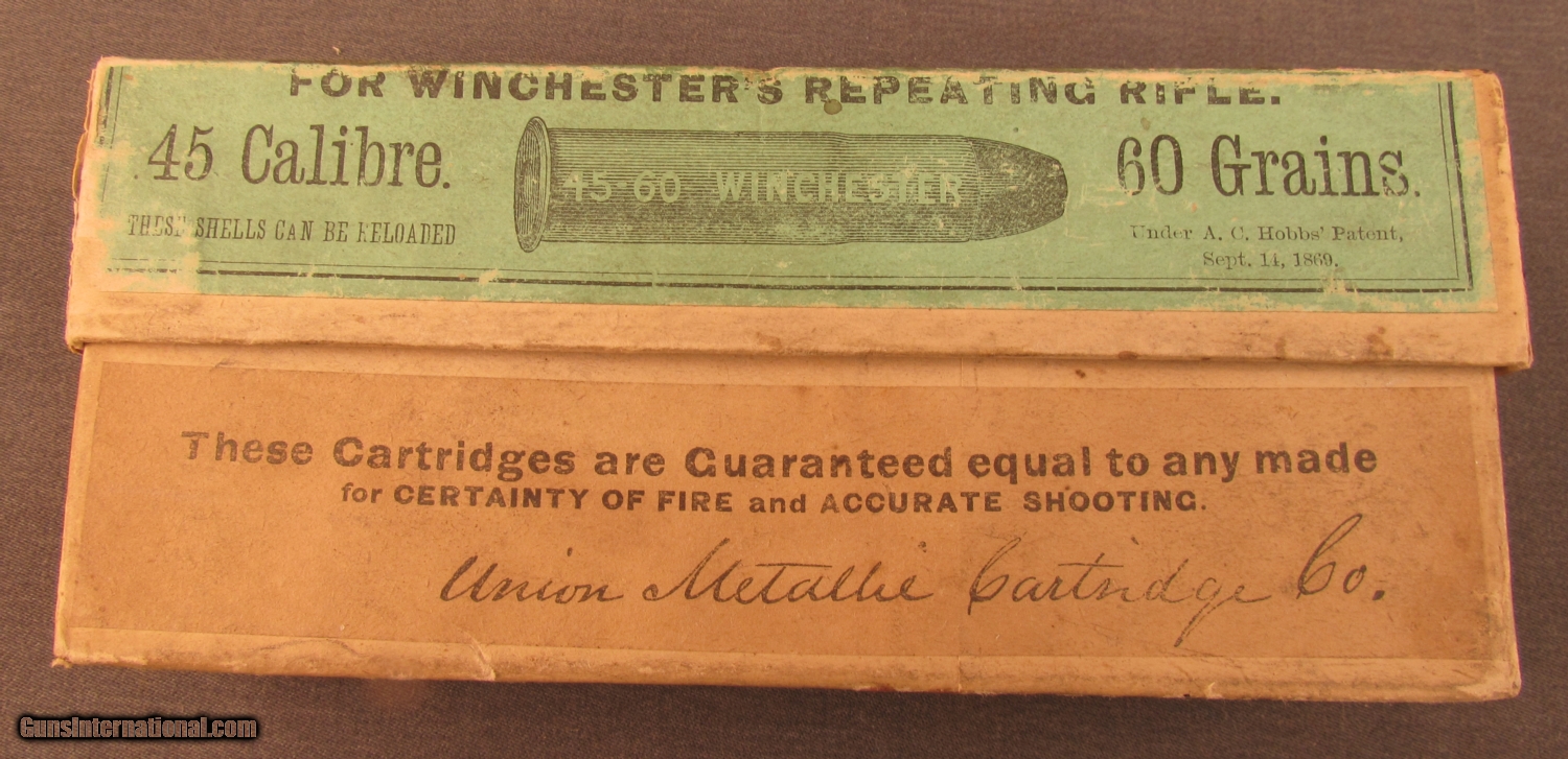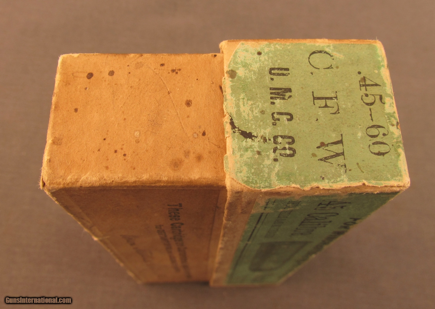 Description: This partial (17 original rounds) two piece box remains in very good condition with stains, light soiling and some scuffing on label. Hobbs' patent of 1869 is called out on label as well as central fire and 45 calibre indicating late 1870s production. Bottom half of box shows an early guarantee with company autograph and an old price (75 cents) in pencil. Ammo has a few light stains, several bullets are slightly misshapen. SOLD Manufacturer: UMC Model: Ammo Caliber Info: .45-60 Gauge Info: .45-60 |