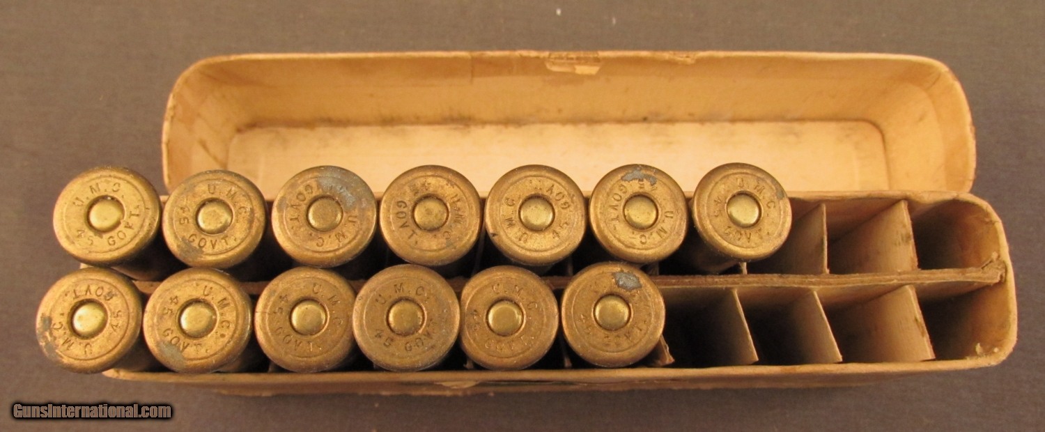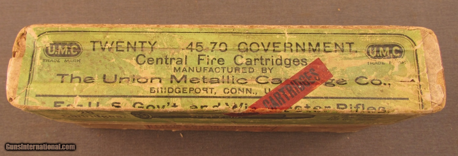 Description: This partial (13 rounds) 20 round two piece round corner box has an added "Shot Cartridges" sticker on top label. Box contains hollow wood tipped shot loads in brass cases with "U.M.C. 45 Gov't" headstamps. Box remains in very good plus condition with light soiling and shelf wear. The ammo shows small areas of discoloration. These wood tipped shot cartridges have become quite popular with collectors lately. SOLD Manufacturer: UMC Model: Ammo Caliber Info: .45-70 Gauge Info: .45-70 |