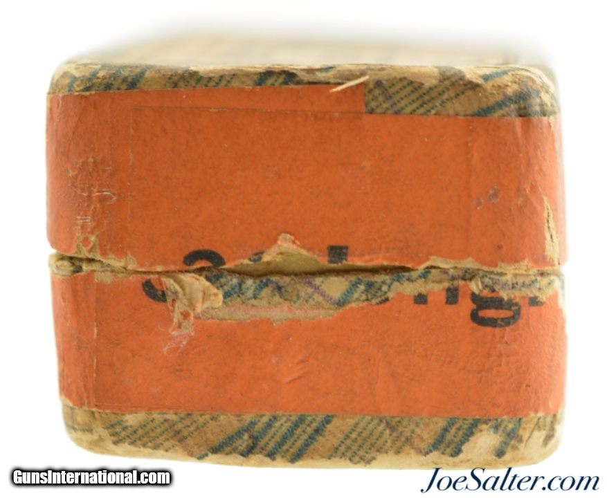 Description: This is a full box, 50 correct rounds, of .32 Long Rim Fire ammunition manufactured by the Union Metallic Company (UMC). The two piece, round corner fabric box has a very fine, intact primary label with a very nice Birds Head pistol wood cut and the UMC Dog head logo. The box is solid with wear on the raised edges, mild age soiling. The orange side label is about 85-90% intact with clear writing. The "U" head stamped cartridges rate from excellent to very good with some showing age darkening and several having firing pin strikes. A very desirable picture box with the Dog head logo perfect to pair with an antique pistol. SOLD |