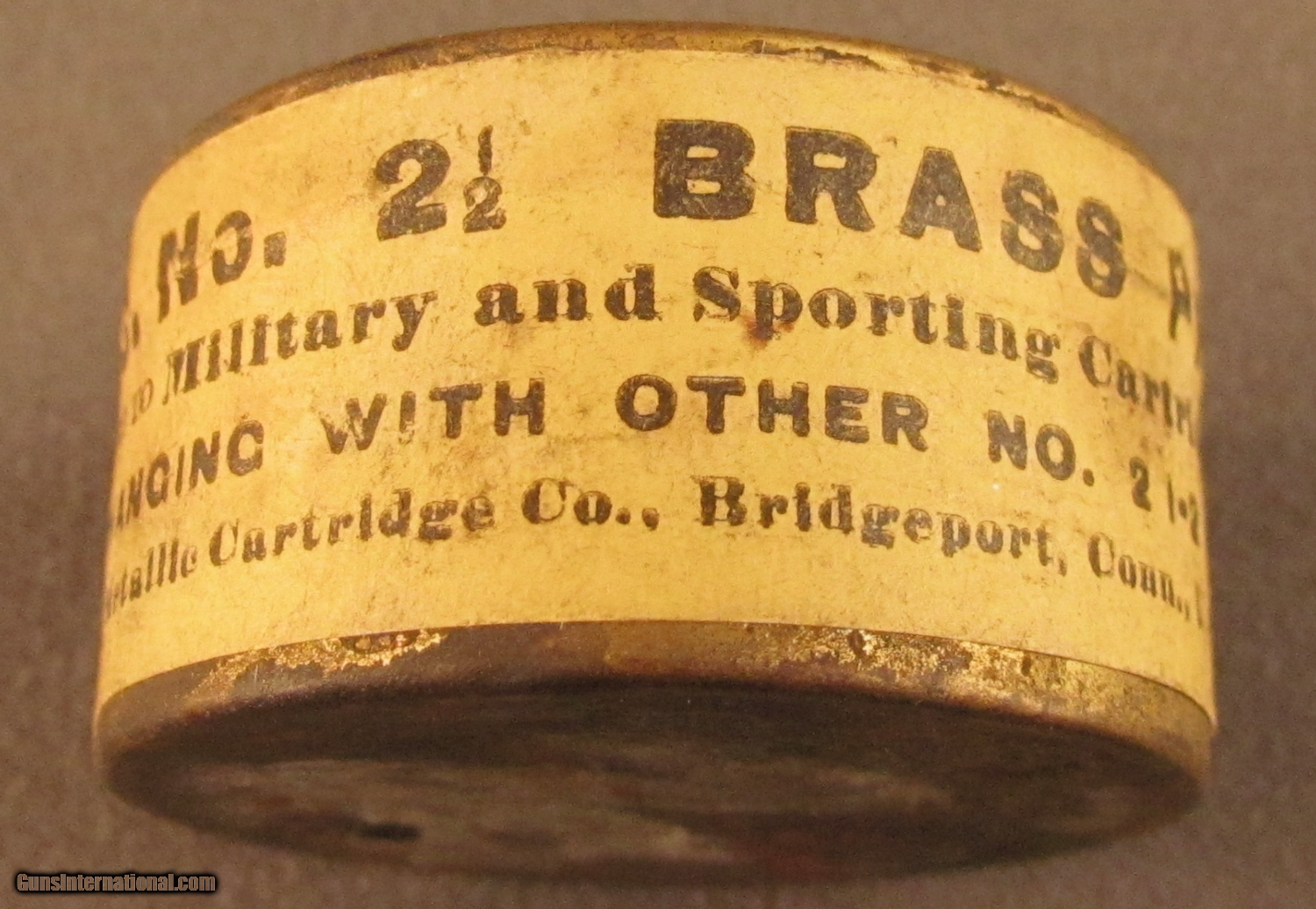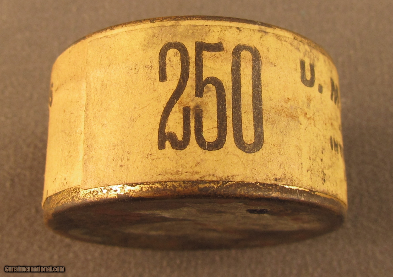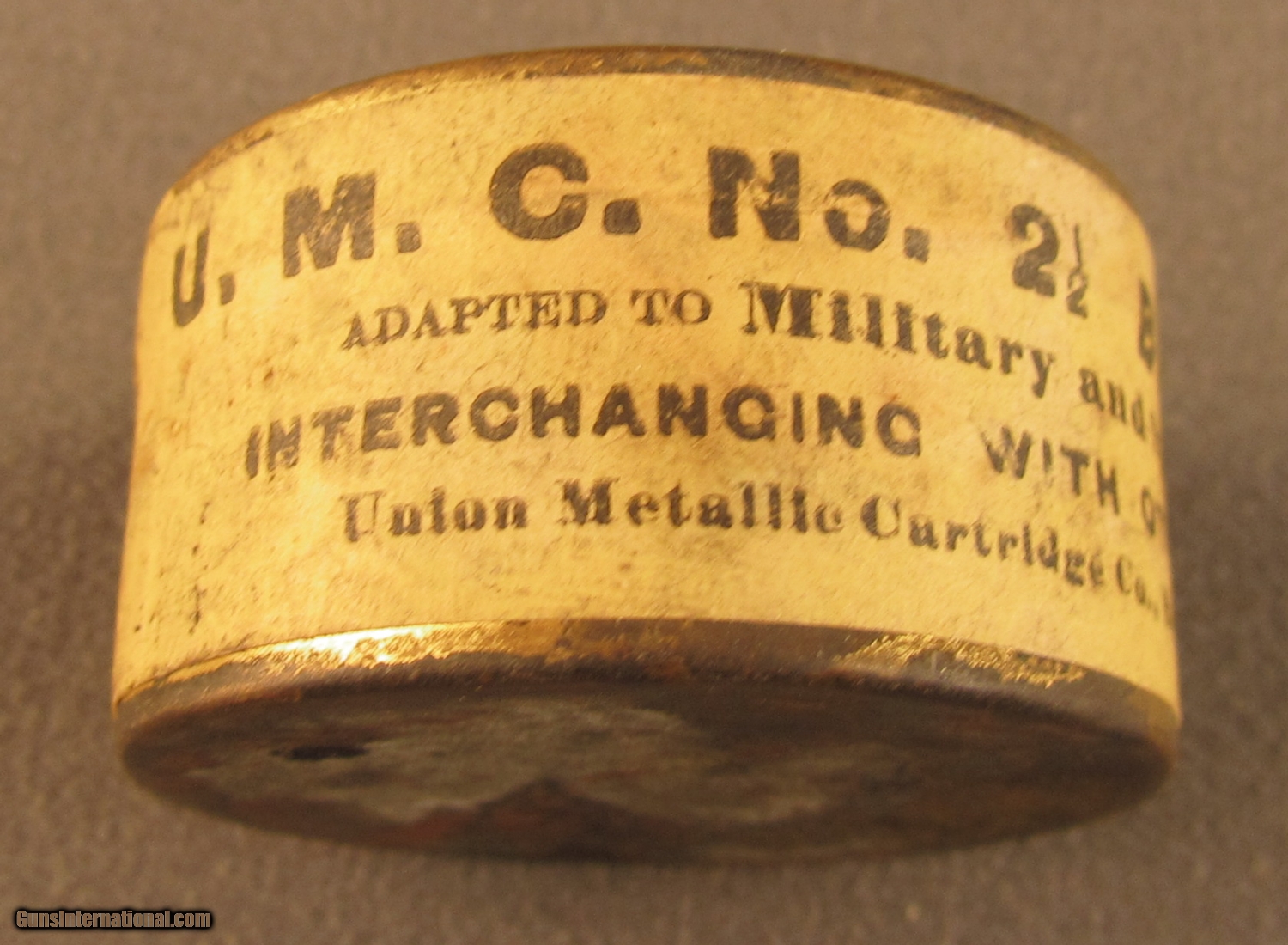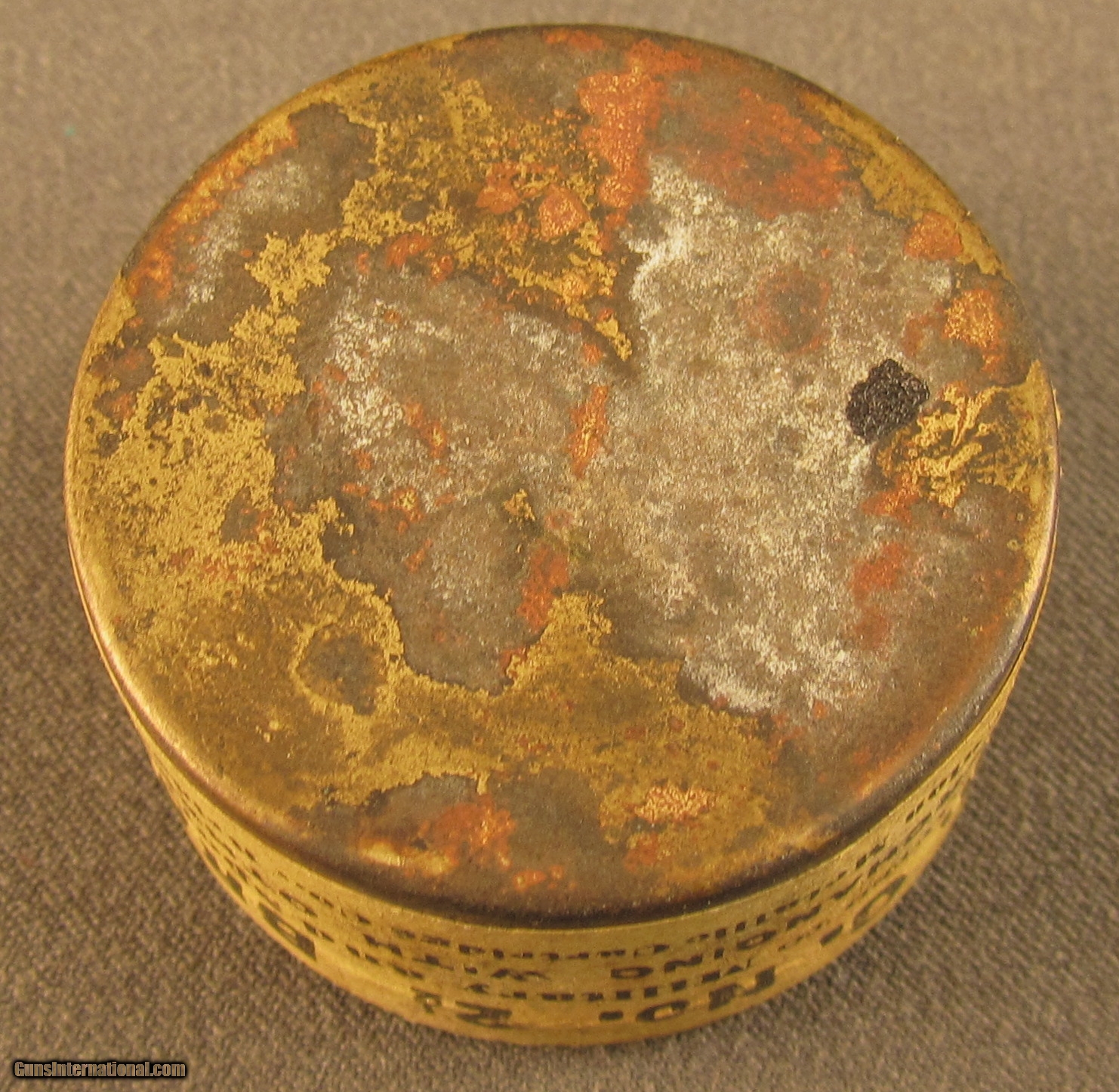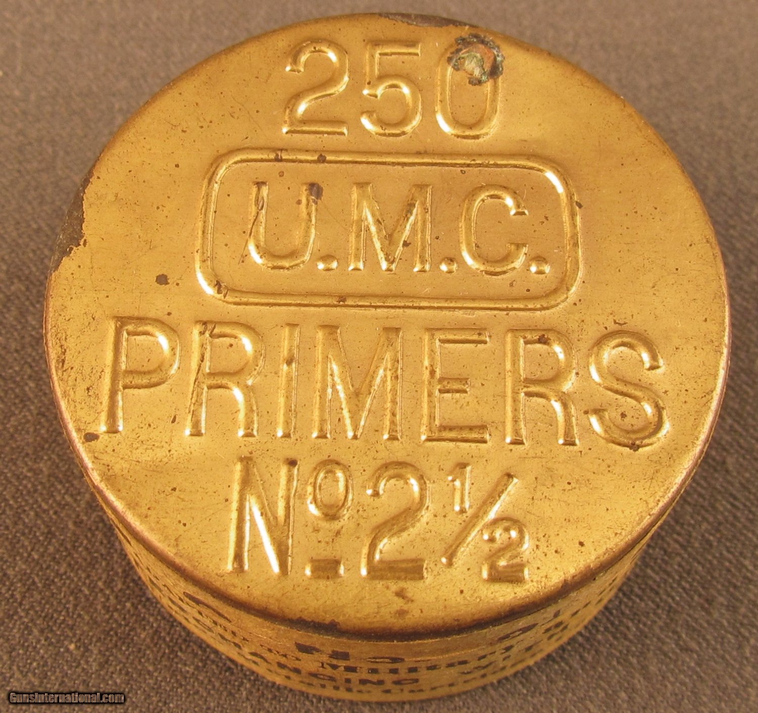Description: This full sealed gold tone can has stamped lid and yellow side sealing label. Lid shows a couple small dark areas of oxidation, side label is complete and uncut. This tin was manufactured before 1911 and will make a great display item. SOLD Manufacturer: UMC Model: Ammo |