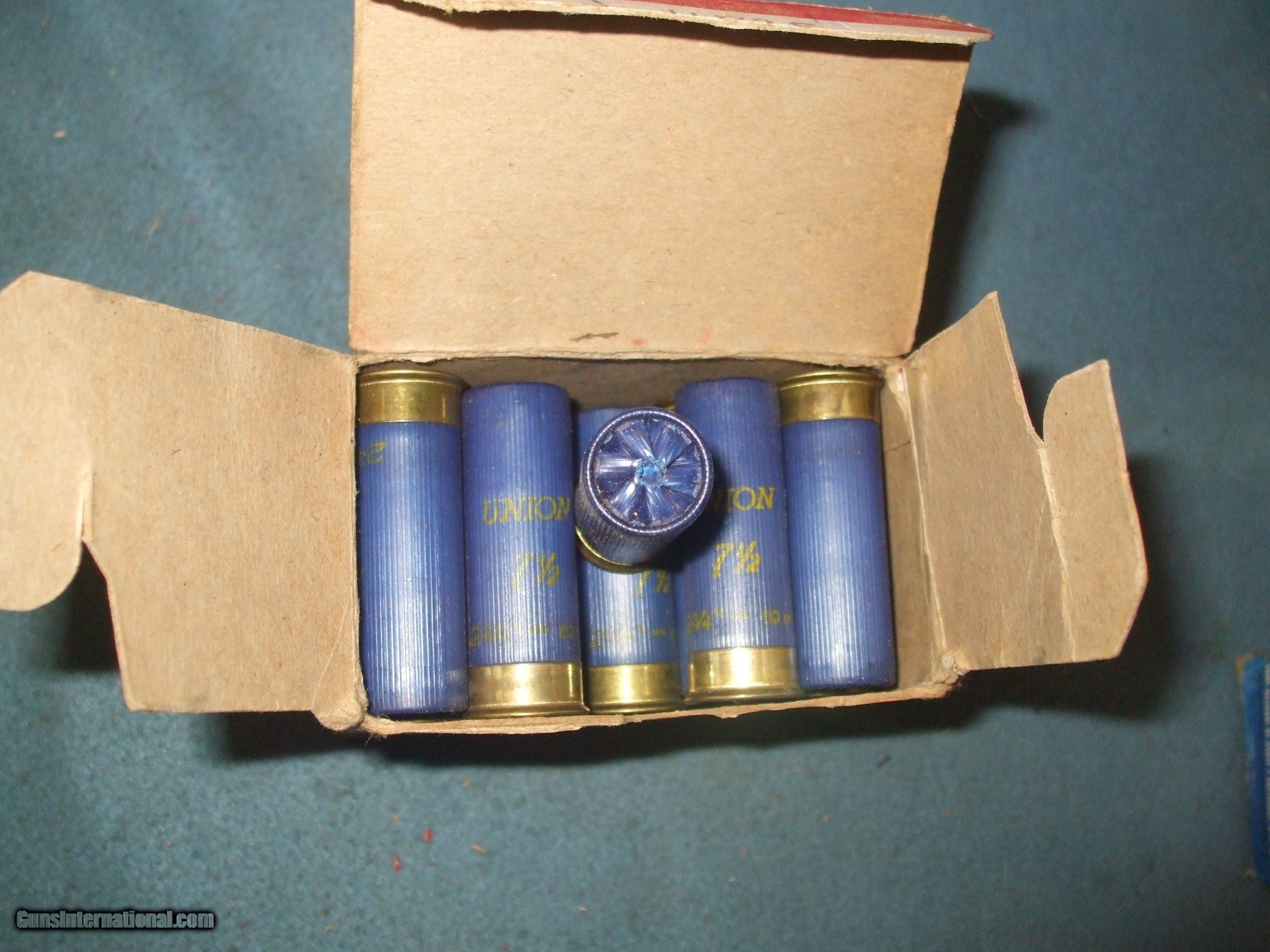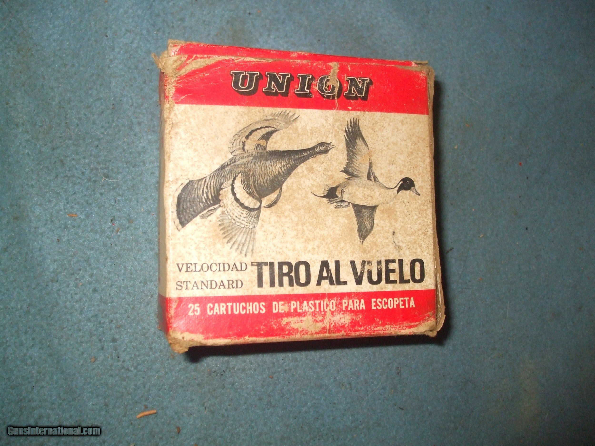 Description: Union 12ga Low brass 7 1/2 shot. Plastic shells. Full box 25rds. Made in Mexico 1970's by "Union Mexicana De Armas and Cartuchos" using Winchester components from 1960's like the Mark 5 casing used here. Box good condtion and shells excellent. Please note cannot ship to CA, MA, NJ, IL or any other restricted areas. I am located in Delaware and can deliver locally. SOLD Shotgun Gauge: 12 Gauge |