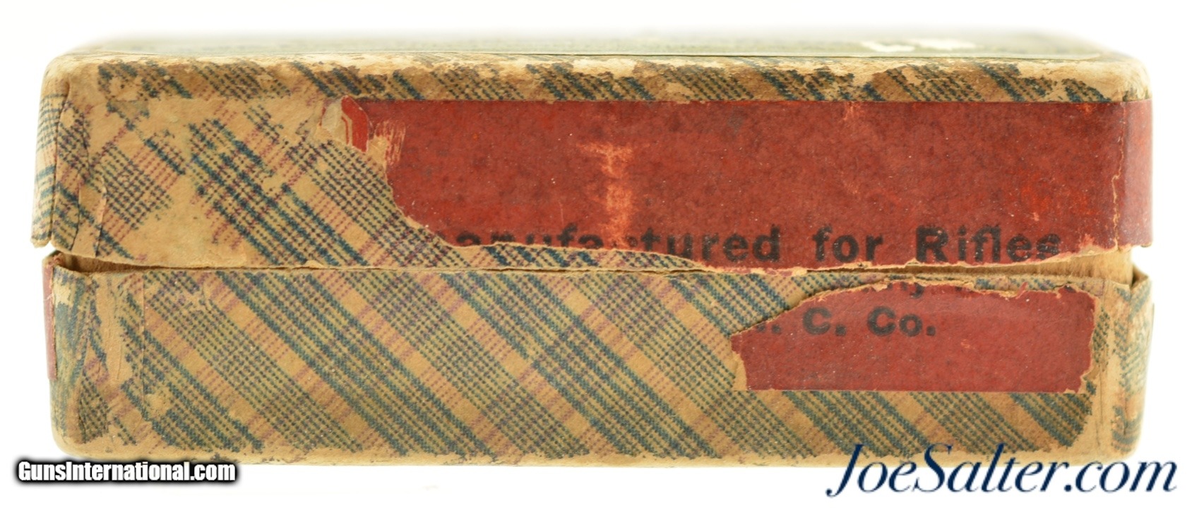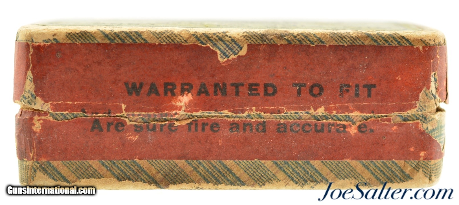 Description: This is a full box, 50 original rounds of .38 Long Rim-Fire black powder ammunition manufactured by U.M.C. with swaged bullets. The two piece, fabric box is solid with edge and rub wear showing some slight flaking to the top green and black label with near excellent graphics. The side seal label is about 75% intact. The cartridges are in very good to near excellent condition with some age darkening and bullet lube oxidation. SOLD |
