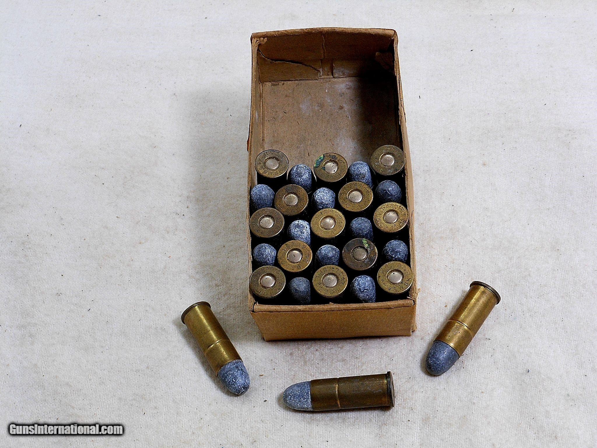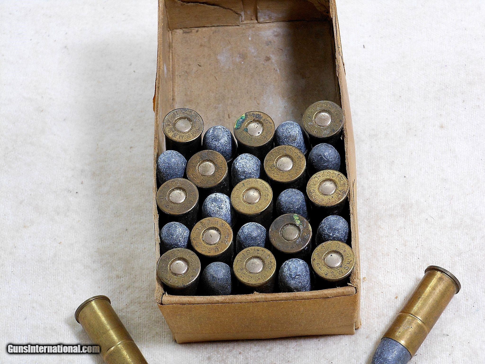 Description: There are 28 original US Cartridge Co. factory loaded 44 Smith & Wesson shells. These shells are loaded with the lead 246 grain bullets. These shells are in clean condition with the round top nickle plated primers with no logo. These shells would be great for filling out an original partial box or for display with early pistols. The Winchester box for empty primed shells was were these shells were found in. Search for hlvfineguns on google for more details. LE (8) F. No. 455 -19 SOLD |