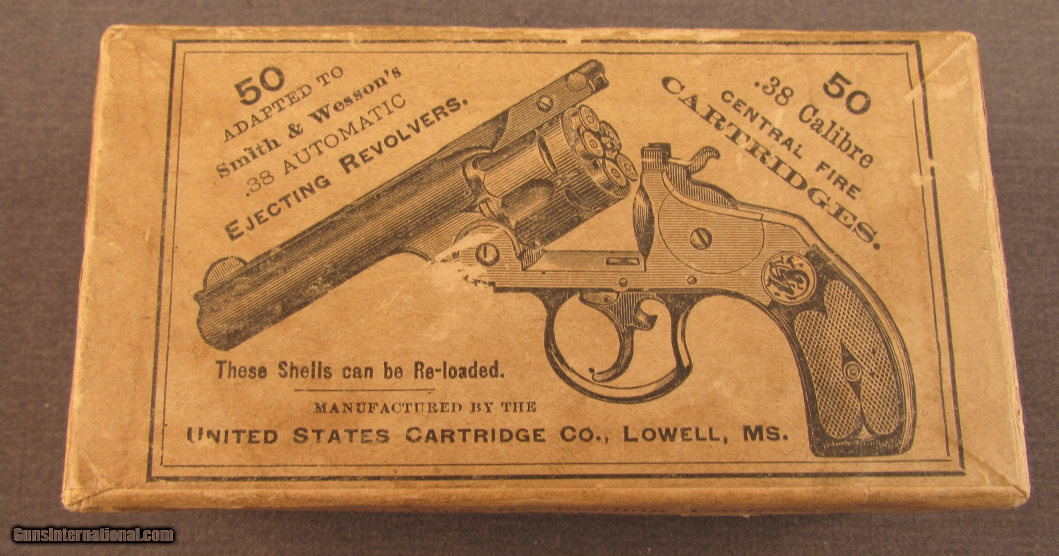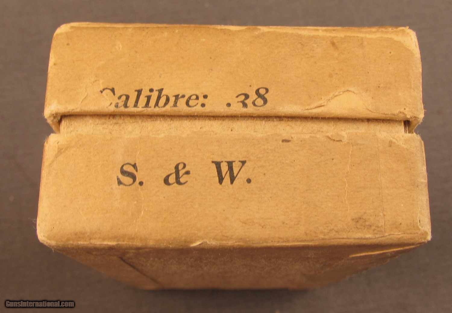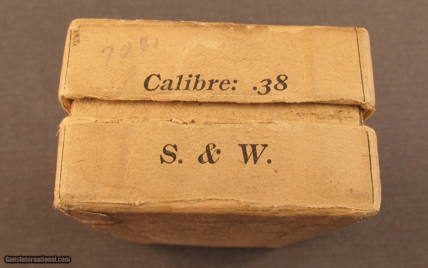 Description: This full 50 round two piece half split box shows a S+W .38 double action second model on top label. These were built from 1880 to 1884. Box shows light shelf wear with minor scuffs on top label and very light soiling. The ammo has U.S. 38 S&W headstamps on brass cases with copper primers showing intertwined US Bullets have flat points. Ammo appears mostly clean with slight discoloration on a few rounds. Top and side labels have Smith & Wesson Automatic ejecting revolver callouts. A nice early US Cartridge Co Box. SOLD Manufacturer: U.S. Cart. Co. Model: Ammo Caliber Info: .38 S&W Gauge Info: .38 S&W |