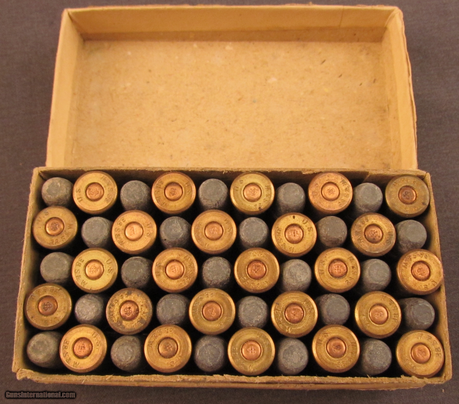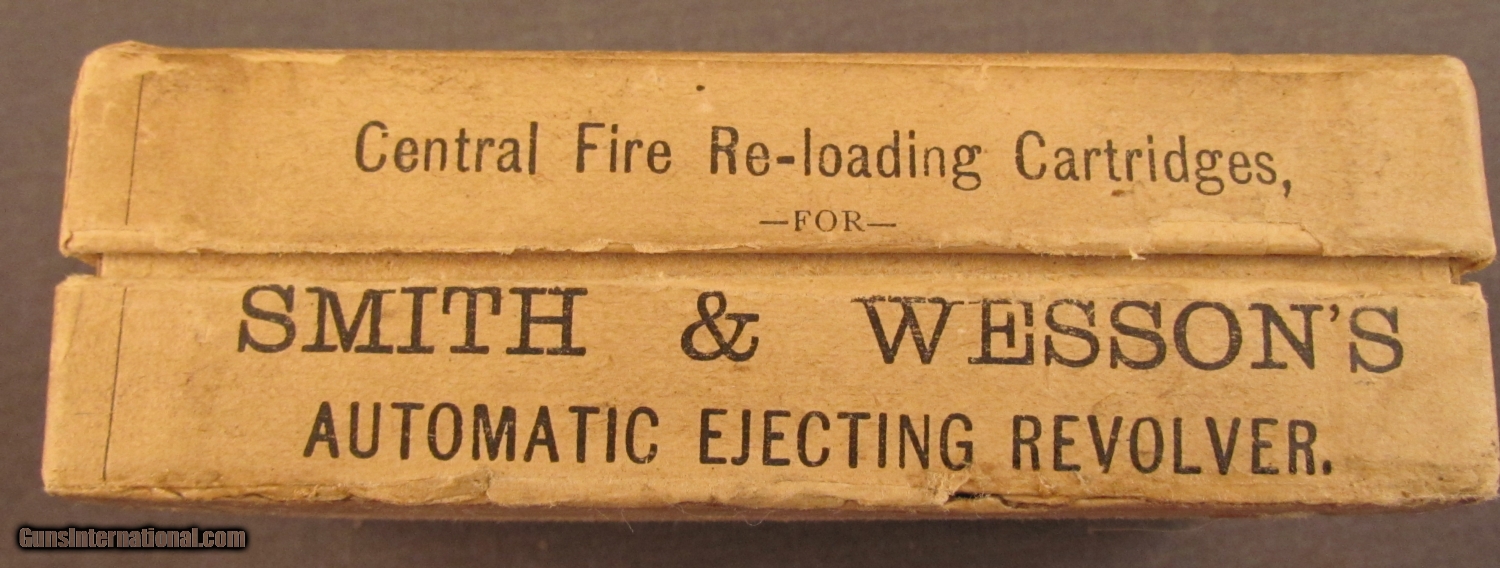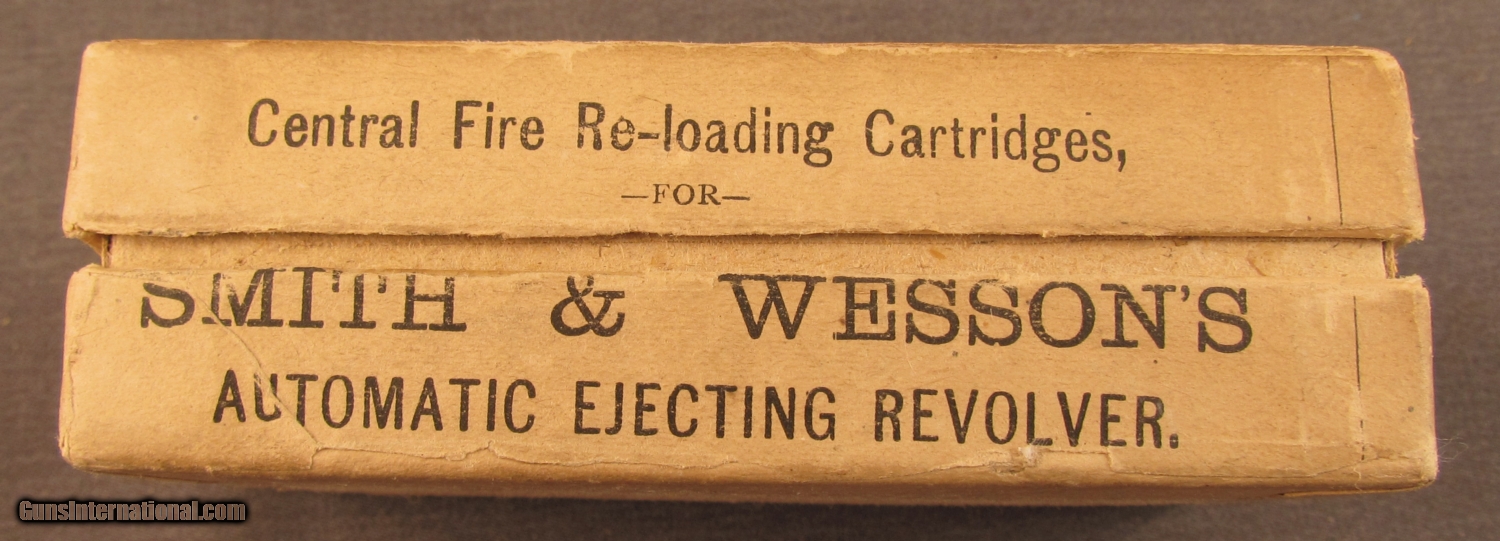 Description: This full 50 round two piece half split box shows a S+W .38 double action second model on top label. These were built from 1880 to 1884. Box shows light shelf wear with minor scuffs on top label and very light soiling. The ammo has U.S. 38 S&W headstamps on brass cases with copper primers showing intertwined US Bullets have flat points. Ammo appears mostly clean with slight discoloration on a few rounds. Top and side labels have Smith & Wesson Automatic ejecting revolver callouts. A nice early US Cartridge Co Box. SOLD Manufacturer: U.S. Cart. Co. Model: Ammo Caliber Info: .38 S&W Gauge Info: .38 S&W |