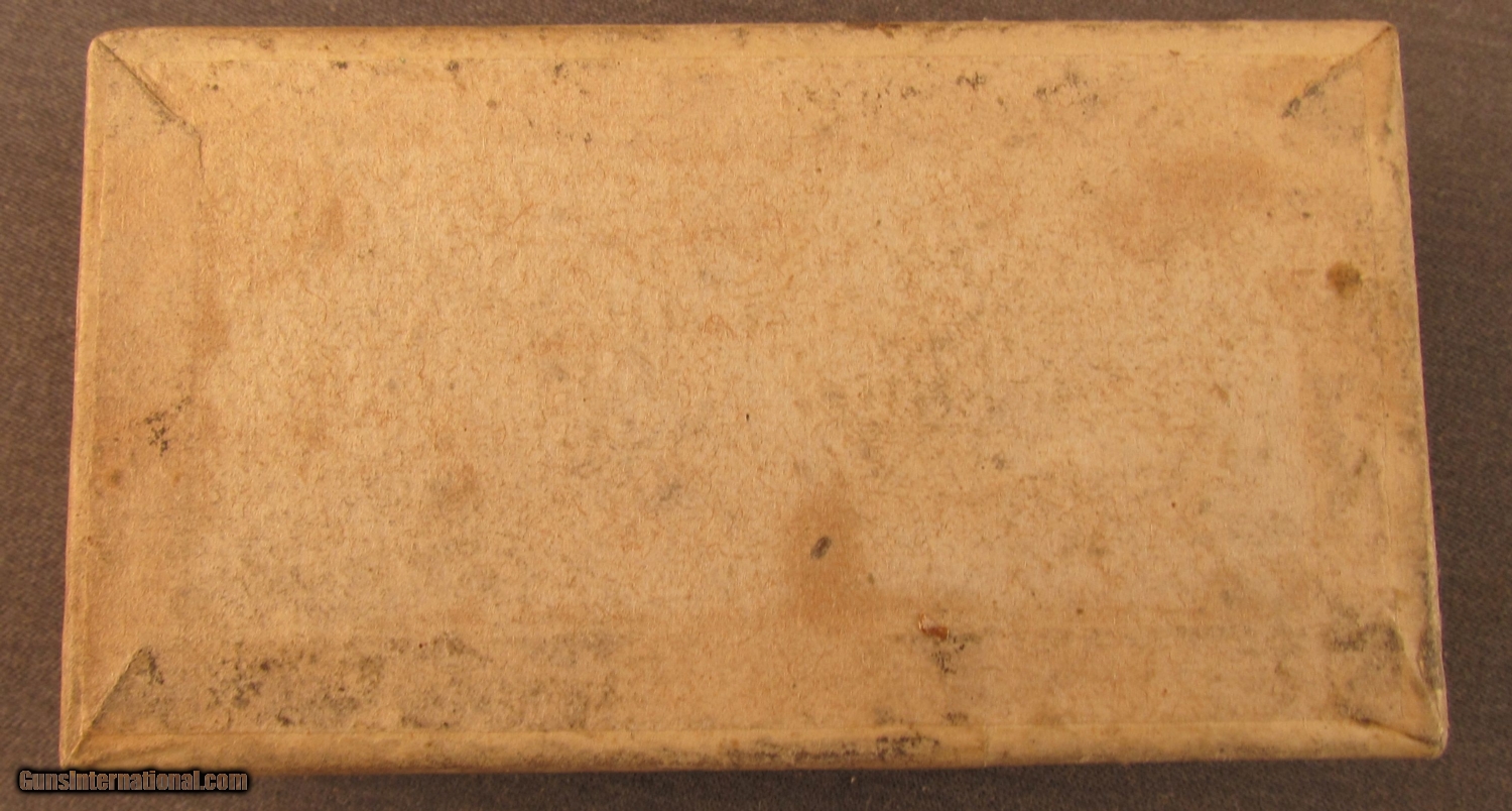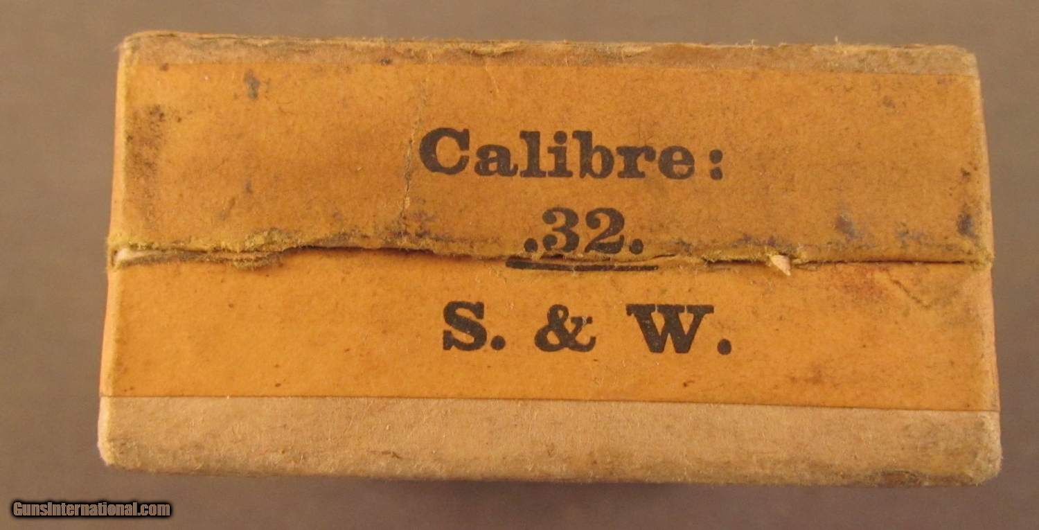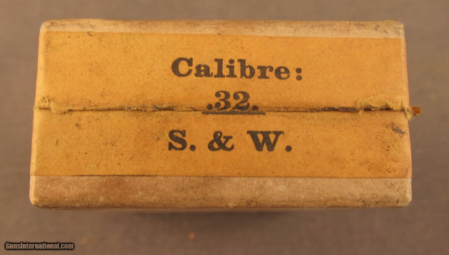 Description: This two piuece half split box has an orange label with "For Smith & Wesson's new 32 automatic ejecting revolver" callout. Box contains six mixed rounds, 3 brass cases, 3 copper cases. labels show light soiling with some areas of loss and repair on side label, top label remains fully legible with a few small stains. This late 1870's box will look great displayed with a nice revolver. SOLD Manufacturer: U.S. Cart. Co. Model: Ammo Caliber Info: .32 S&W Gauge Info: .32 S&W |
