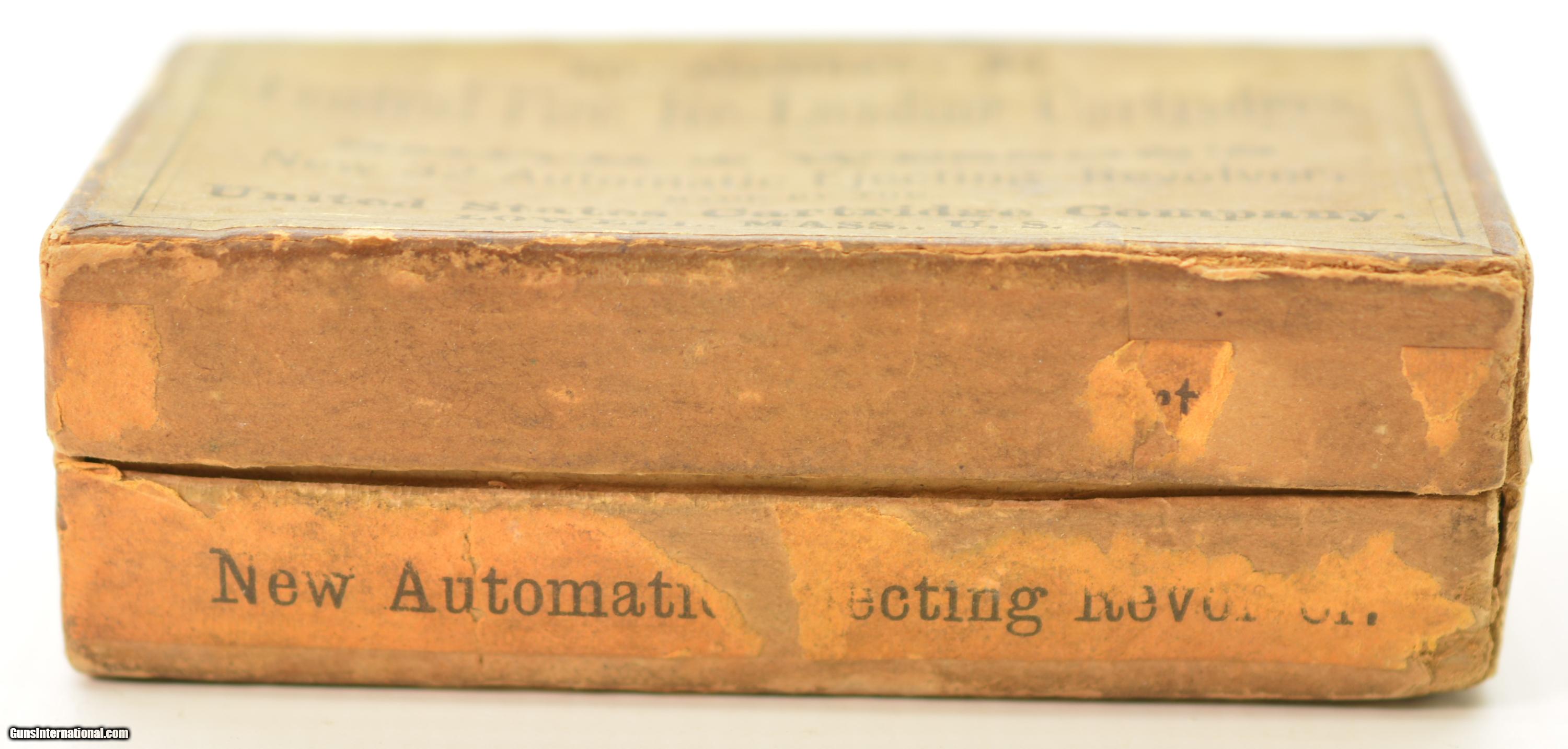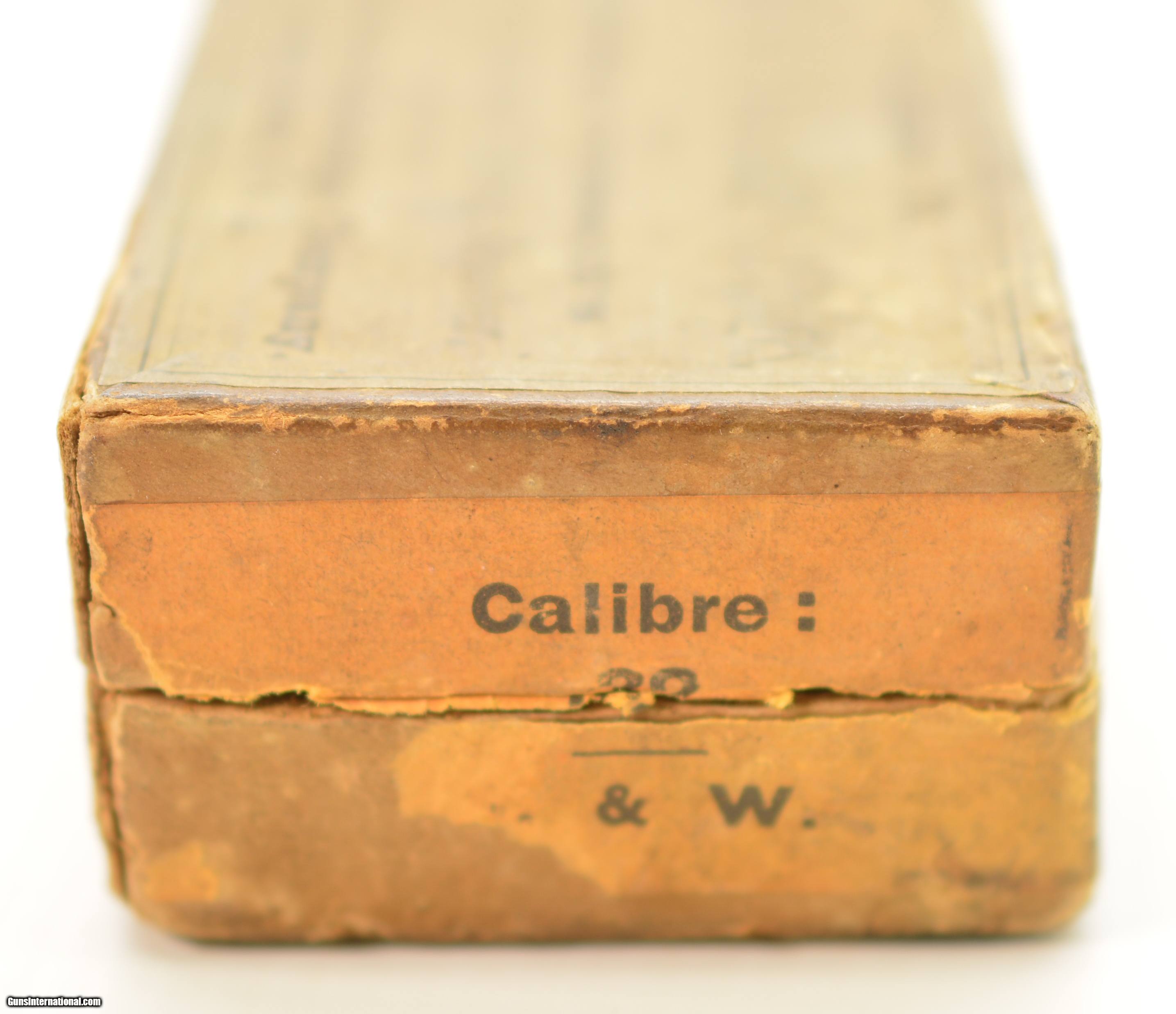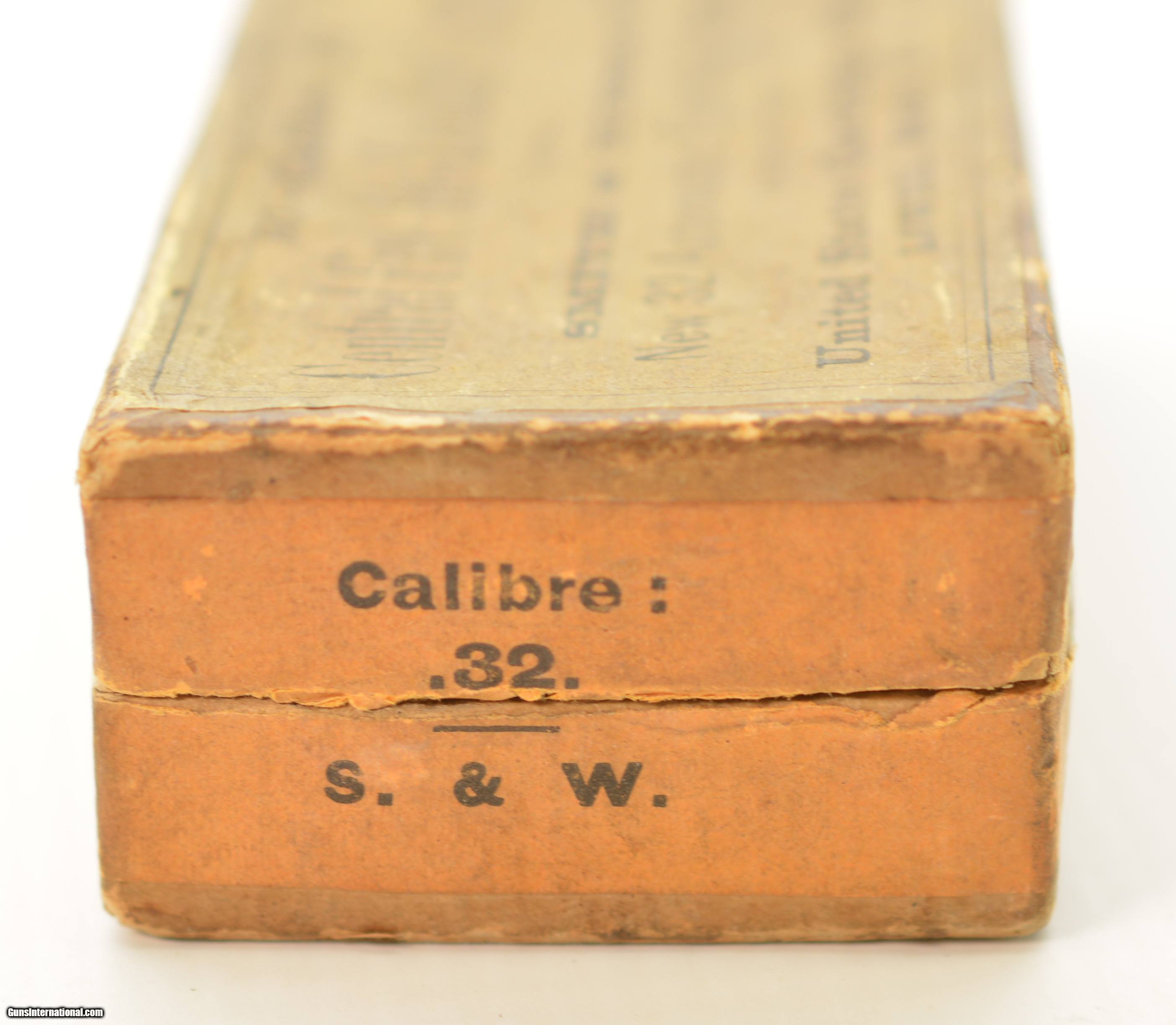 Description: This late 1870's box has a callout for Smith & Wesson's new 32 automatic ejecting revolver. This partial (29 rounds) box contains round nose bullets in brass cases with no headstamps. Box has a faded green to label with light soiling. Top shows a separation at lower right corner. Side sealing label is only 70% present. A very good early US box with Smith & Wesson callout. SOLD Manufacturer: U.S. Cart. Co. Model: Ammo Caliber Info: .32 S&W Gauge Info: .32 S&W |