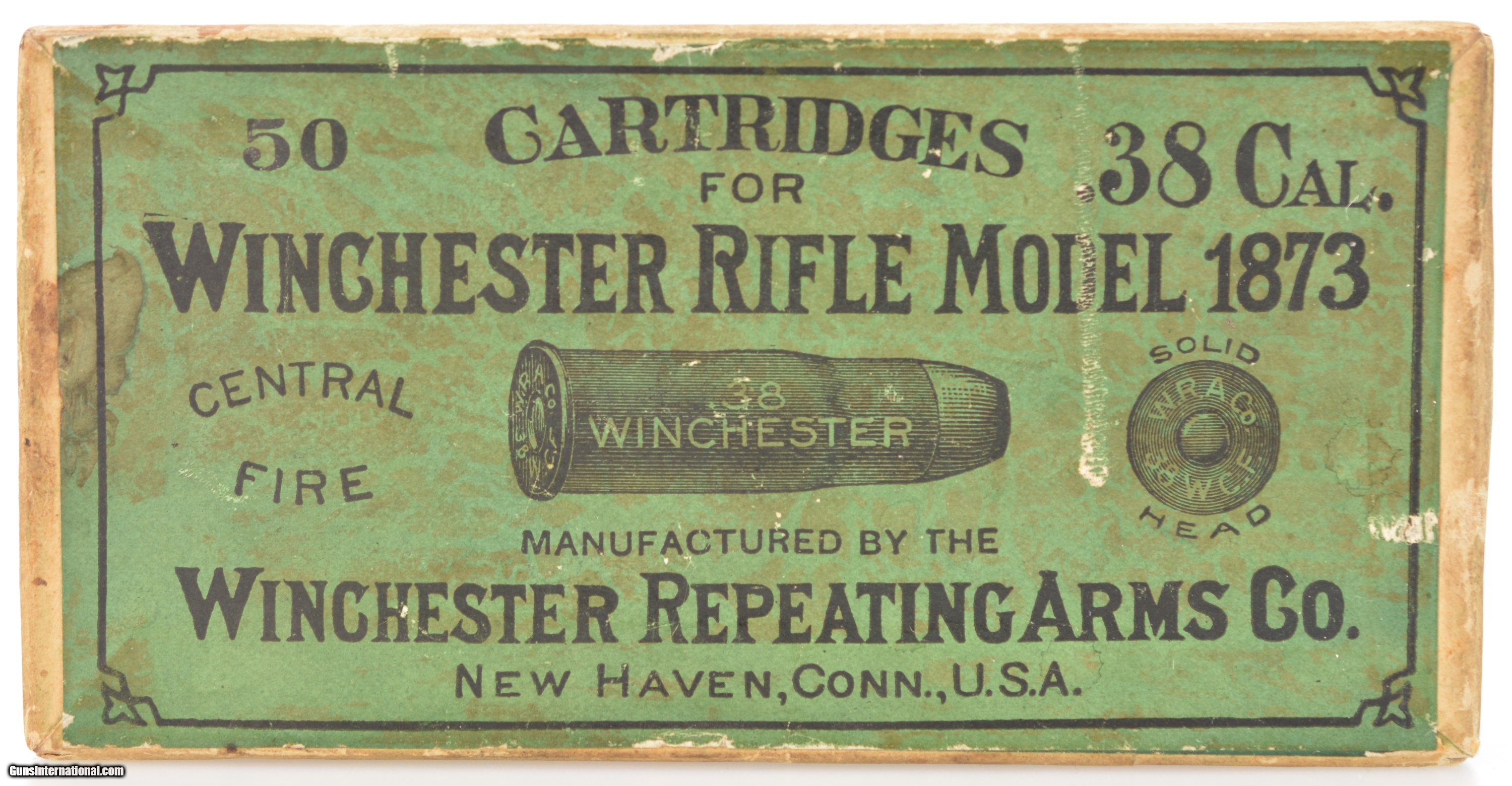 Description: This is a full box of .38 W.C.F. (.38-40) in the first Black Powder loading for this cartridge by Winchester. The Green and black top label and red side label are in excellent condition with light soiling and a small scuff marks showing a great top and profile cartridge cut with “Central Fire" call out. The box is solid with sound corners. Fifty correctly head stamped rounds are present marked “W.R.A. Co. 38 W.C.F." with some having been lightly cleaned but all in very good condition. A great, early box that is hard to find in this condition. SOLD Manufacturer: Winchester Model: Ammo Caliber Info: .38-40 Gauge Info: .38-40 |
