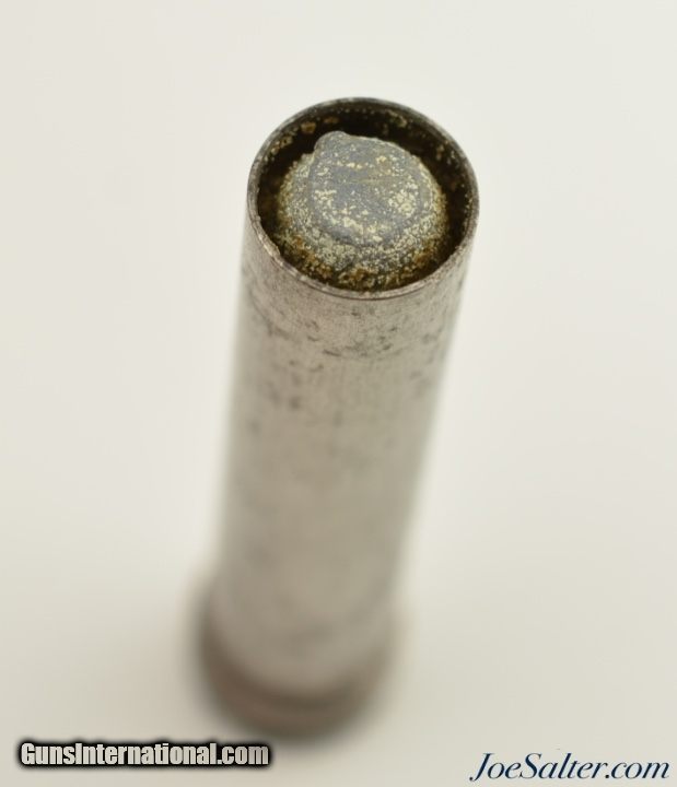 Description: This is an original .41 Caliber Roper rifle cartridge manufactured by Sylvester H. Roper of Amherst, Mass for his Revolving rifle patented on April 10, 1866 (Patent No. 53881). The rugged steel cartridge was designed to be reloaded and were made in both .32 and .41 calibers for his 6 shot revolving rifle and in 12 & 16 Gauges for the four shot revolving shotgun. This example is in excellent condition with a flat nose bullet loaded flush with the cartridge top showing some minor carbon staining. A very rare loaded cartridge for a very rare gun and testament of the great innovation present in the post-Civil War era gun industry. SOLD |