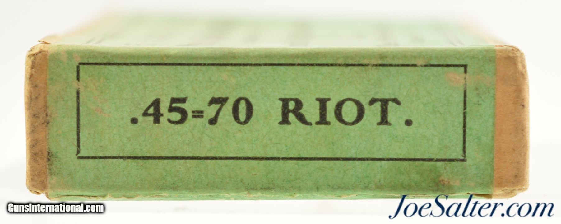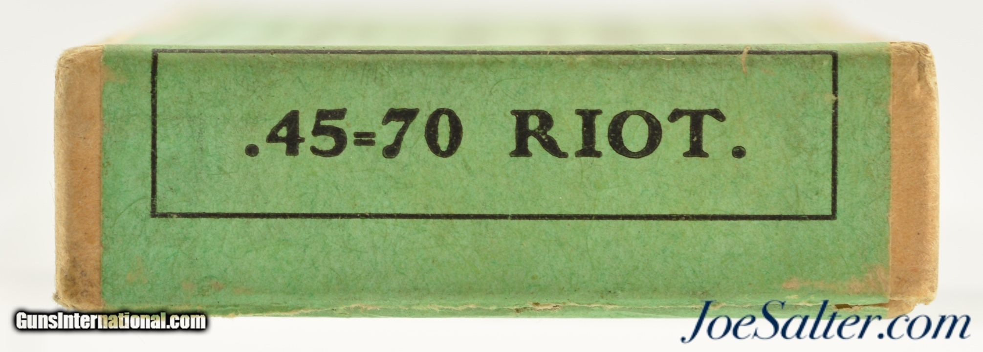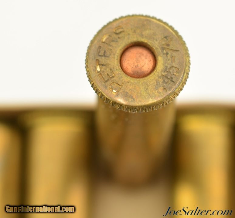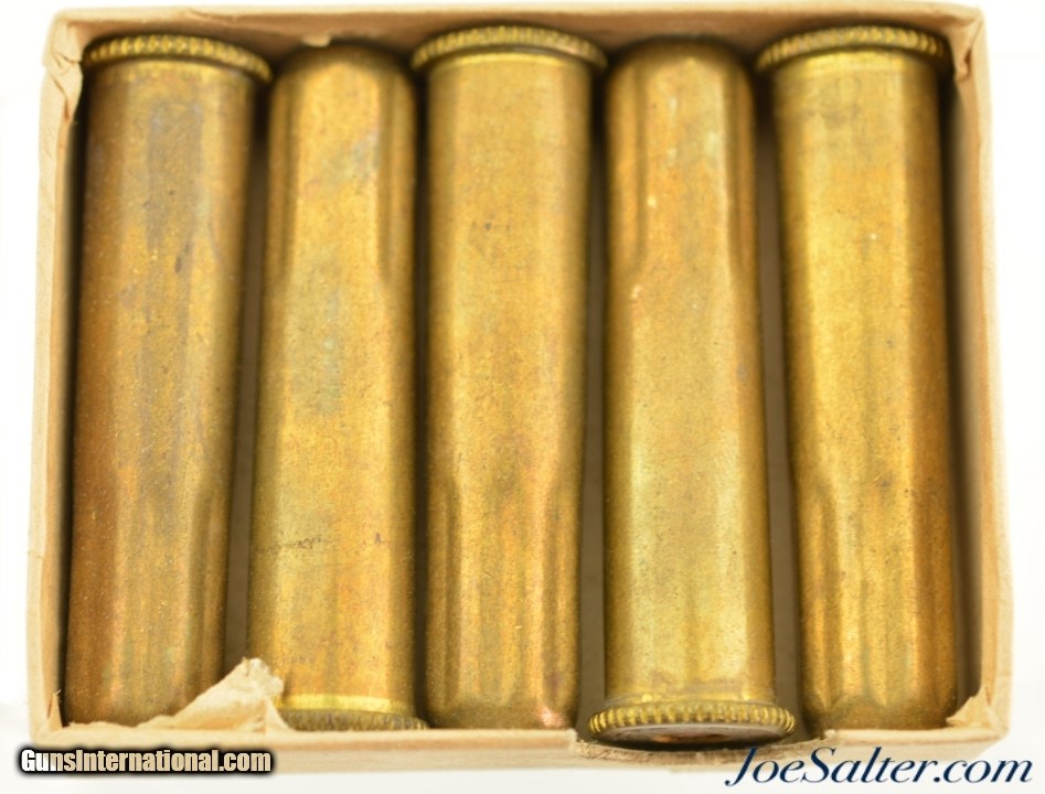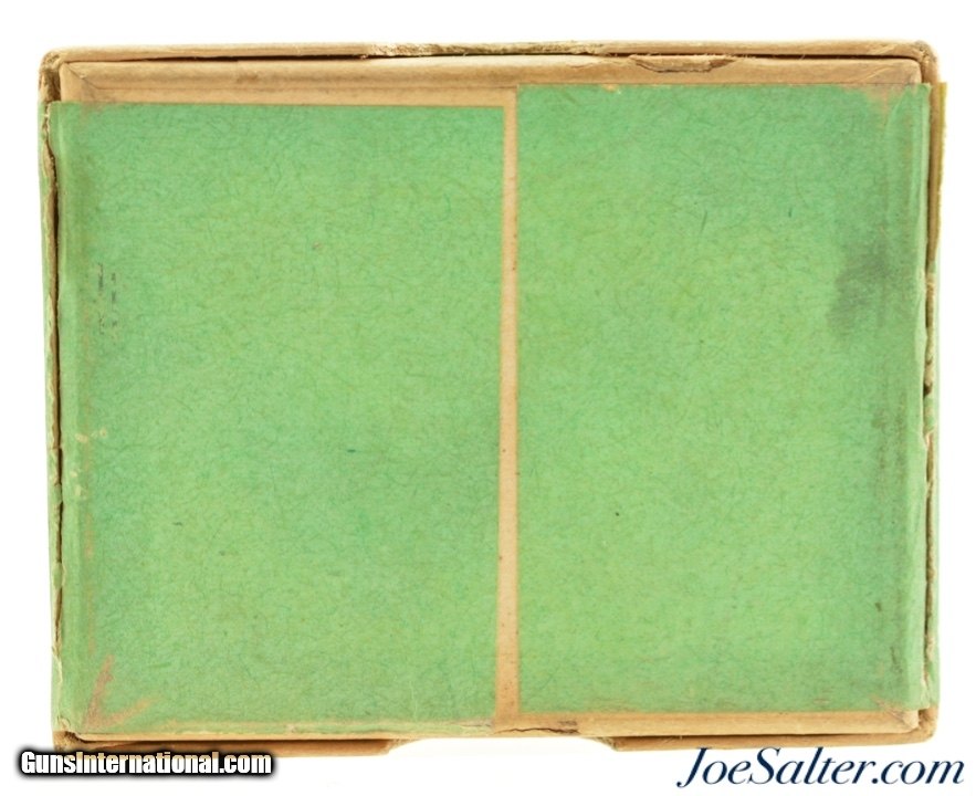 Description: This is a full, 5 original rounds, of .45-70 Riot cartridges manufactured by Peters loaded with shot. The two piece, buff box with green and black label is in excellent condition marked .45-70 Riot on the sides and "Adapted to .45-70 Rifle and Carbines" on the cover. The cartridges have a crimped end and a serrated or knurled head rim giving them a distinct look that would not be confused with regular blank loads. A very rare special loading that is in excellent condition. SOLD |