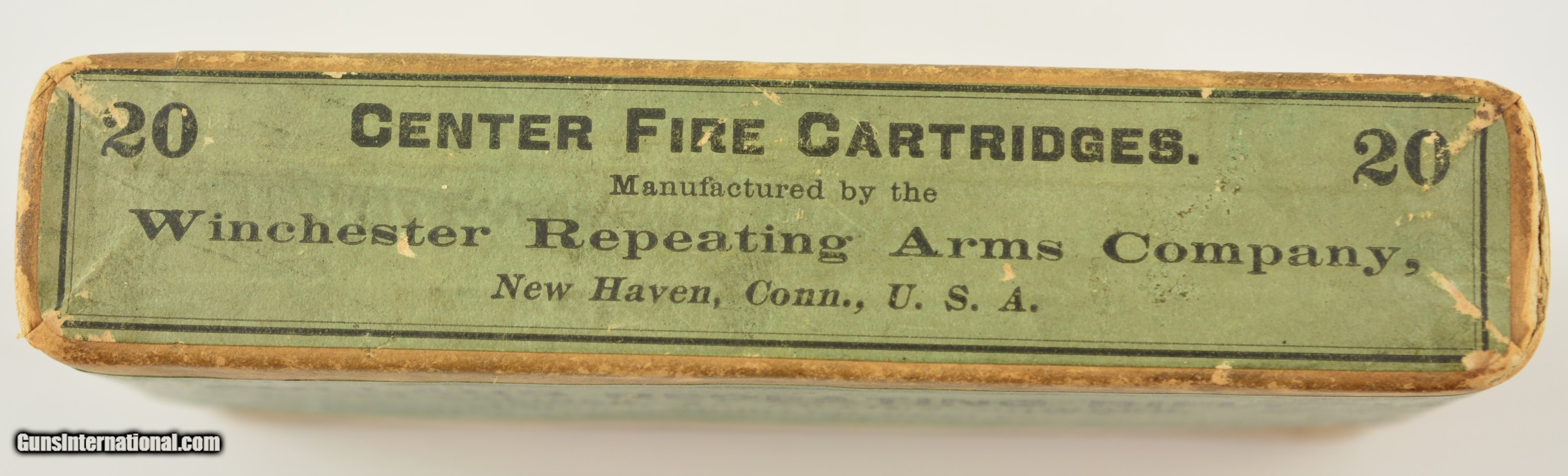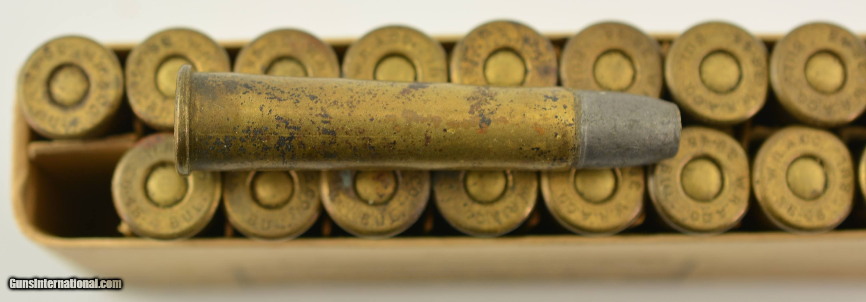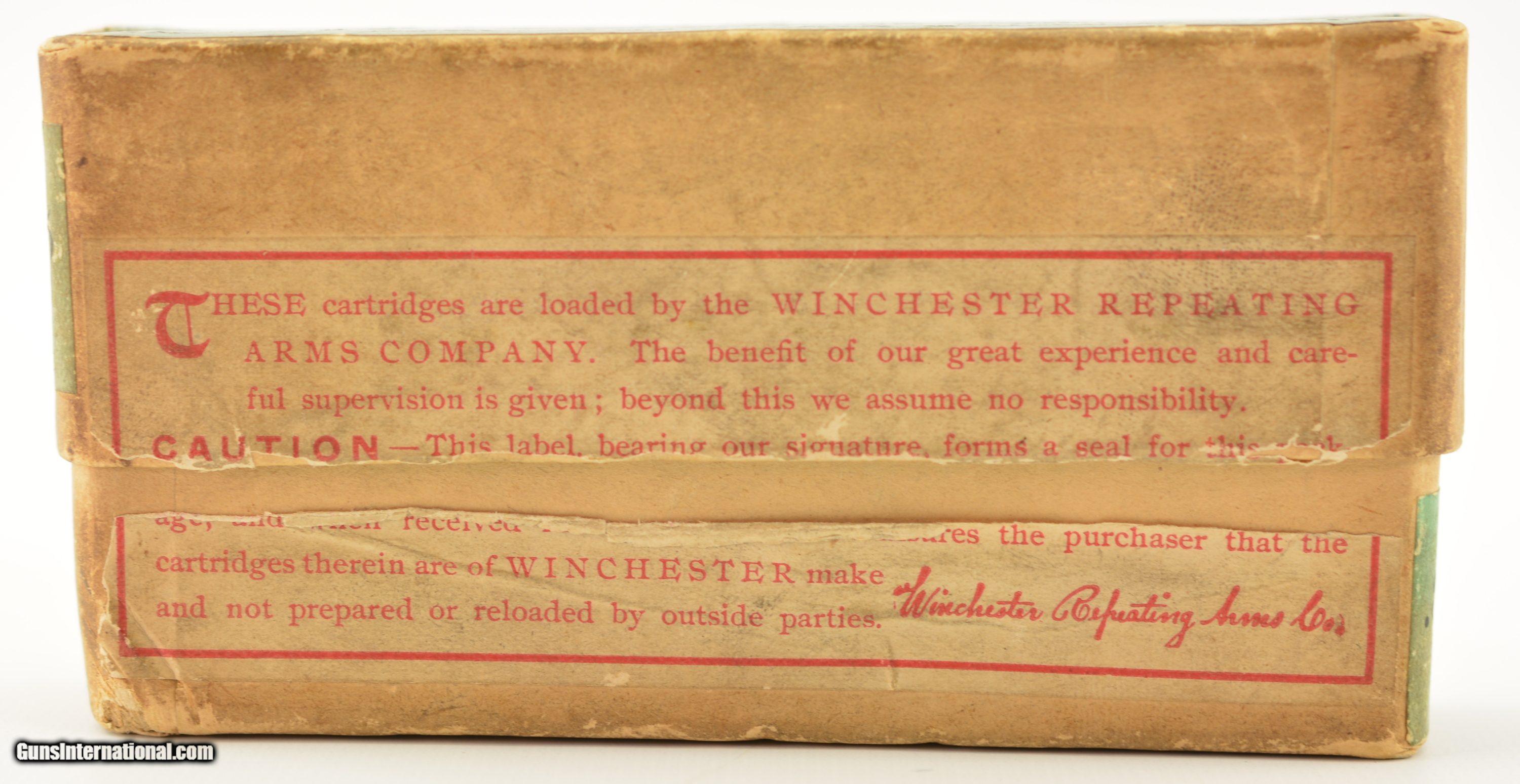 Description: This is an almost full (19 original, correct cartridges) of .38-45 Bullard manufactured by Winchester. Giles and Shuey point out in One Hundred Years of Winchester Cartridge Boxes, 1856-1956 that any “Bullard calibers in Winchester boxes are very Scarce" and have a rarity of R3. This two piece box buff box has the green top and side labels with the red Winchester rear sealing label. The box and labels are very lightly soiled with strong graphics and excellent “Bullard Repeating Rifle" call out with a written number on the front left corner and very light rub wear on the top. The round corner box is sound with very slight separation on the right top corner. The 19 rounds have the correct “W.R.A. Co. 38-45 BUL." headstamp and are in excellent condition with some slight tarnish and light verdigris on several rounds. An excellent and very scarce box. SOLD Manufacturer: Winchester Model: Ammo Caliber Info: .38-45 Gauge Info: .38-45 |