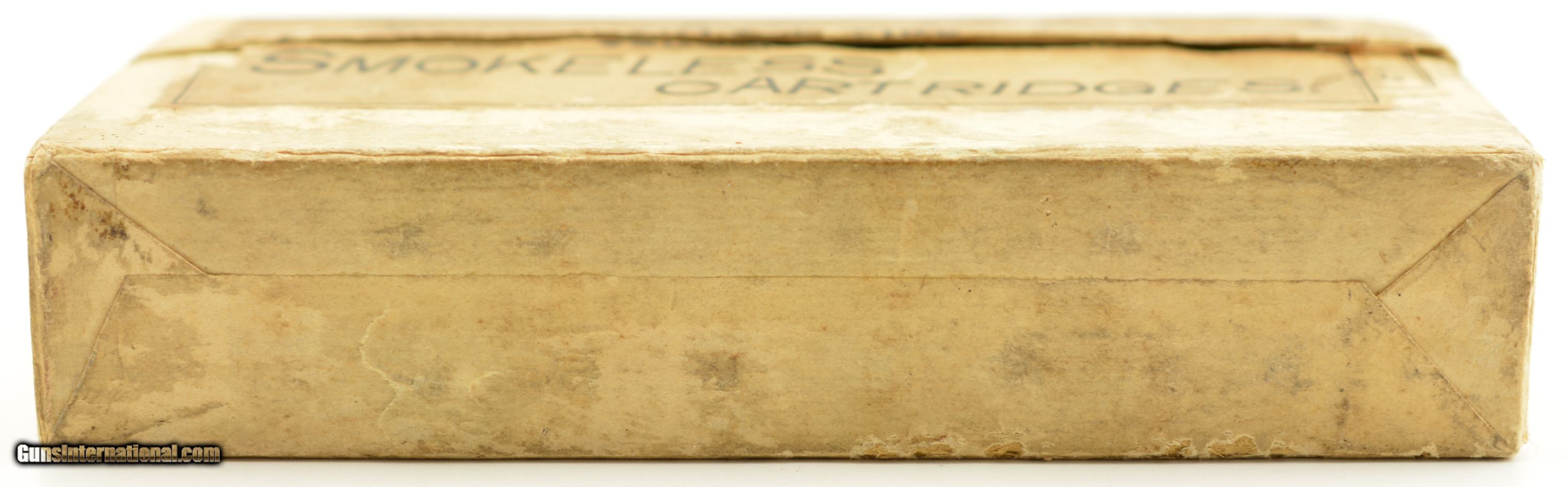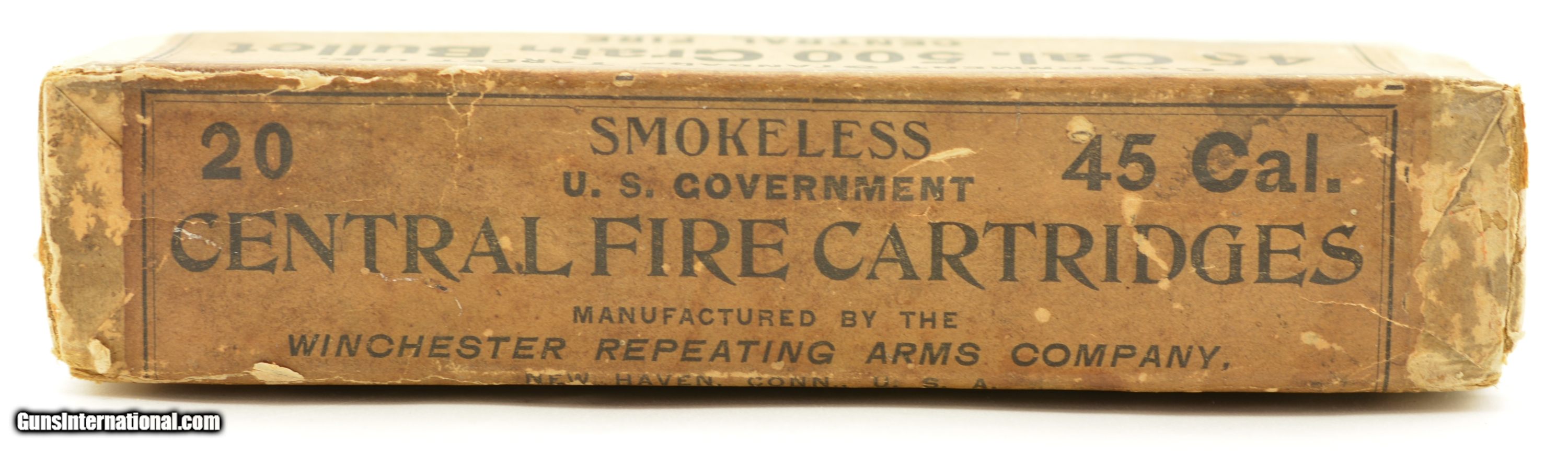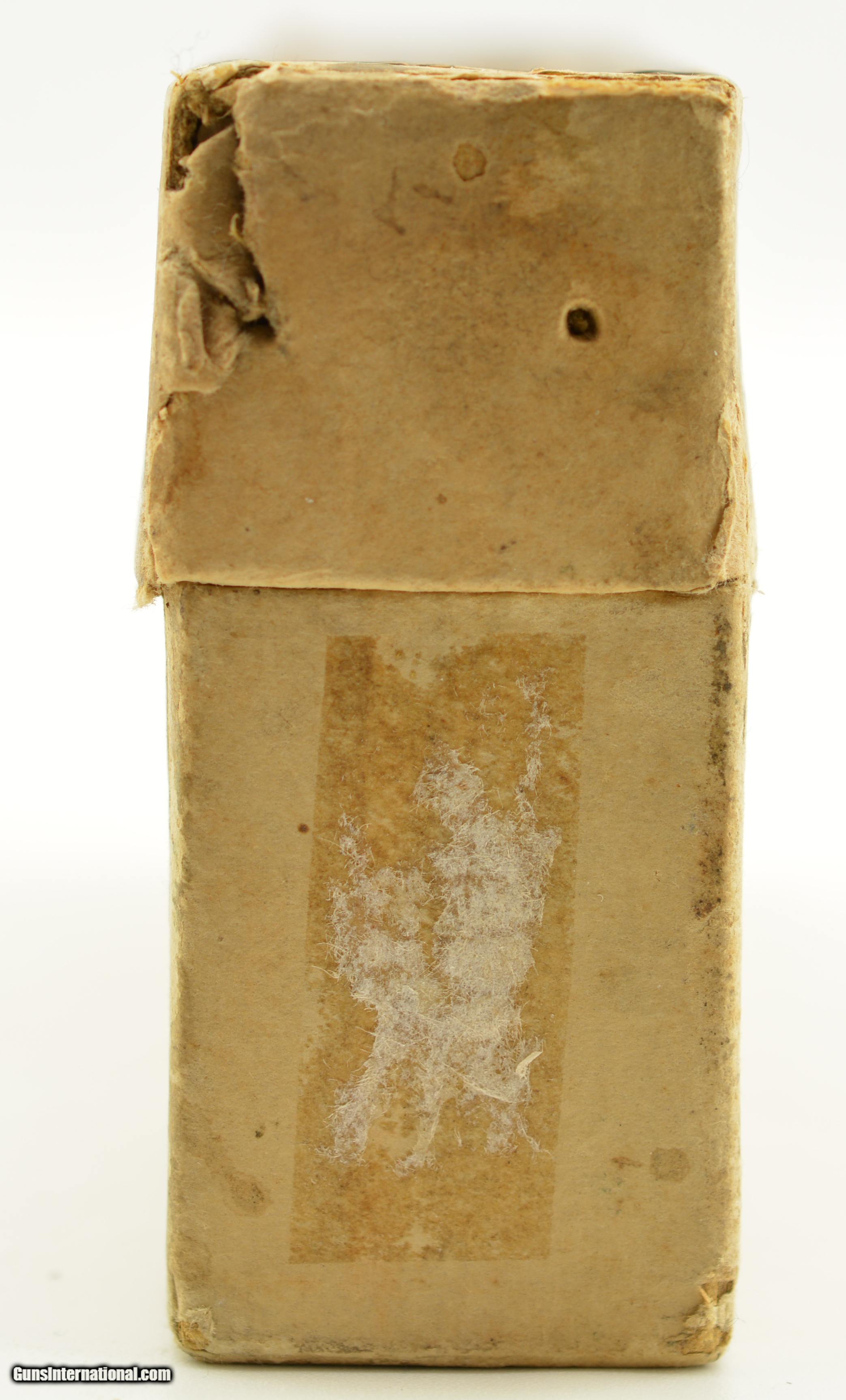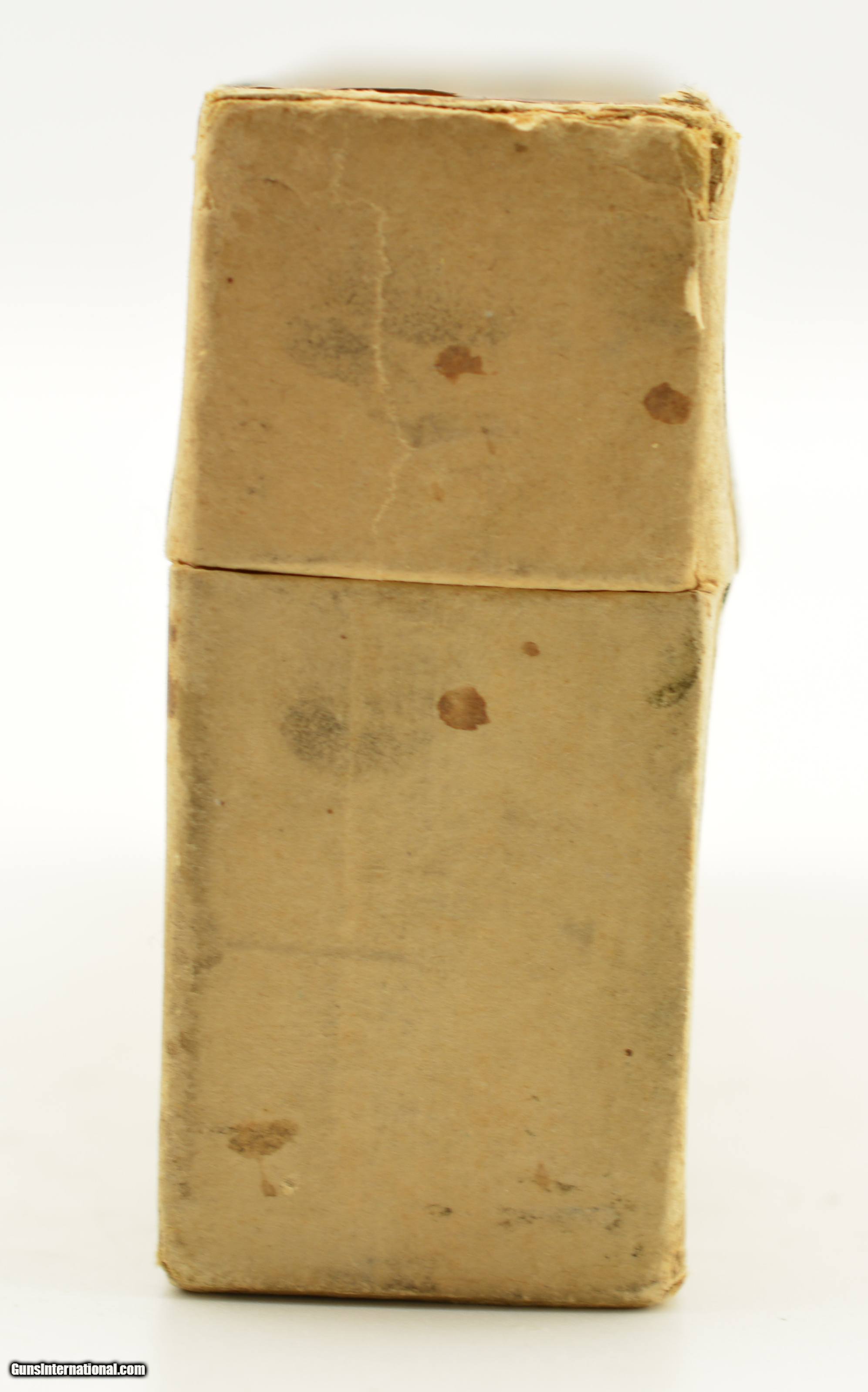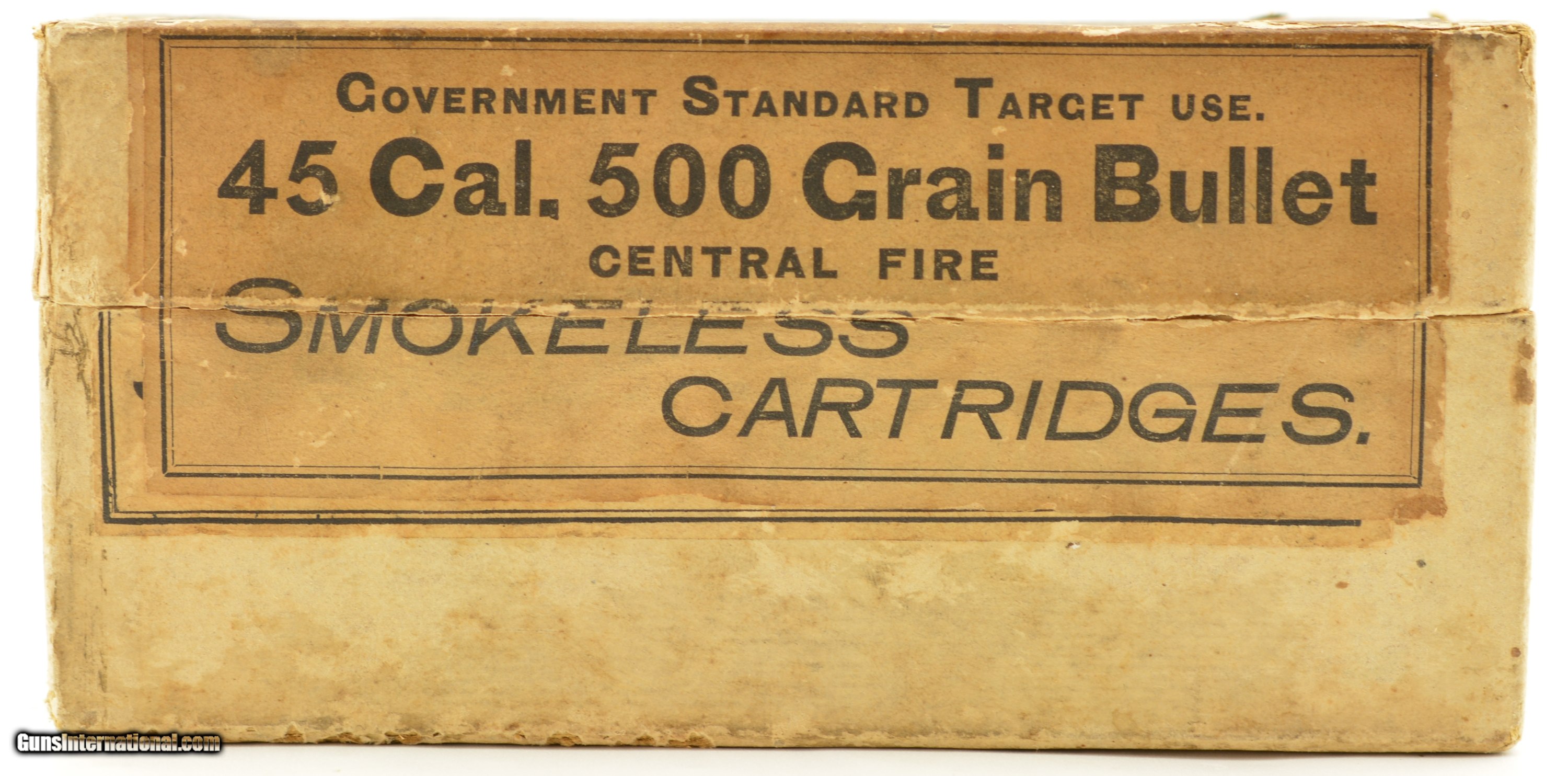 Description: This is a full, 20 original rounds, box of .45-70 ammunition manufactured by Winchester for the U.S. Government for “Standard Target Use" with the very scarce smokeless powder load and 500 grain bullets. Identified on p93 of Giles & Shuey's One Hundred Years of Winchester Cartridge Boxes, 1856-1956 these Smokeless boxes are seldom encountered and were only manufactured from 1895-98 with a rarity of R4 on a scale of 1-5. The two piece buff box is solid with plain, intact labels showing light flaking calling out the Government contract and Winchester Repeating Arms Company with overall mild age soiling. The cartridges are in near excellent condition lightly darkened with age. A rare box for the advanced collector. SOLD Manufacturer: Winchester Model: Ammo Caliber Info: .45-70 Gauge Info: .45-70 |