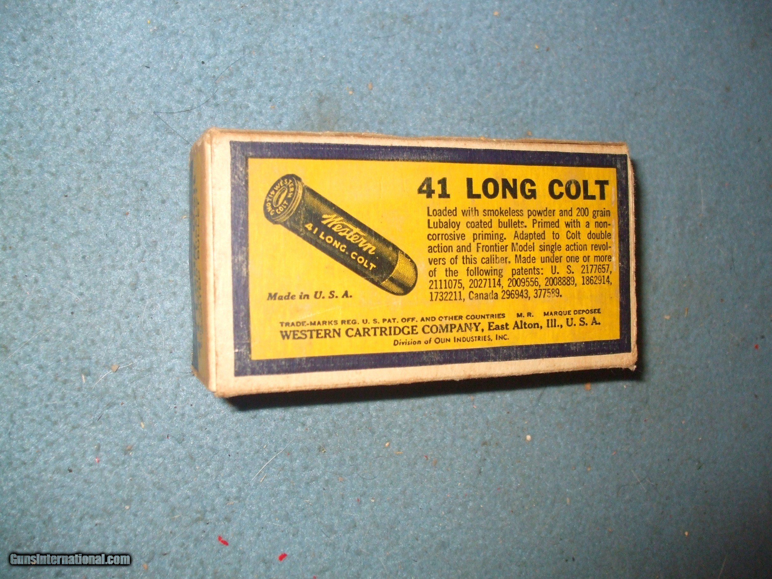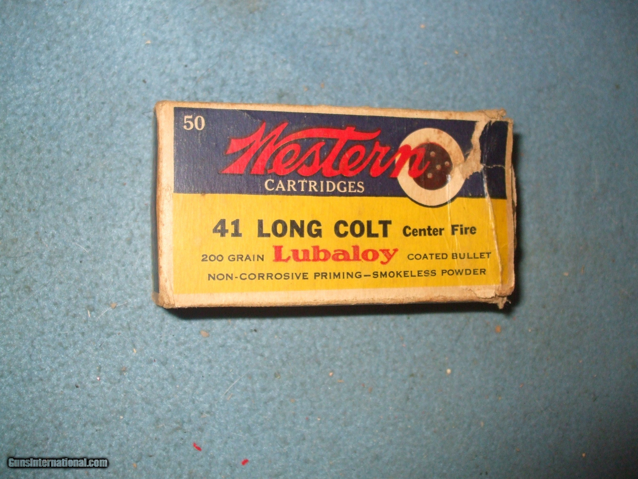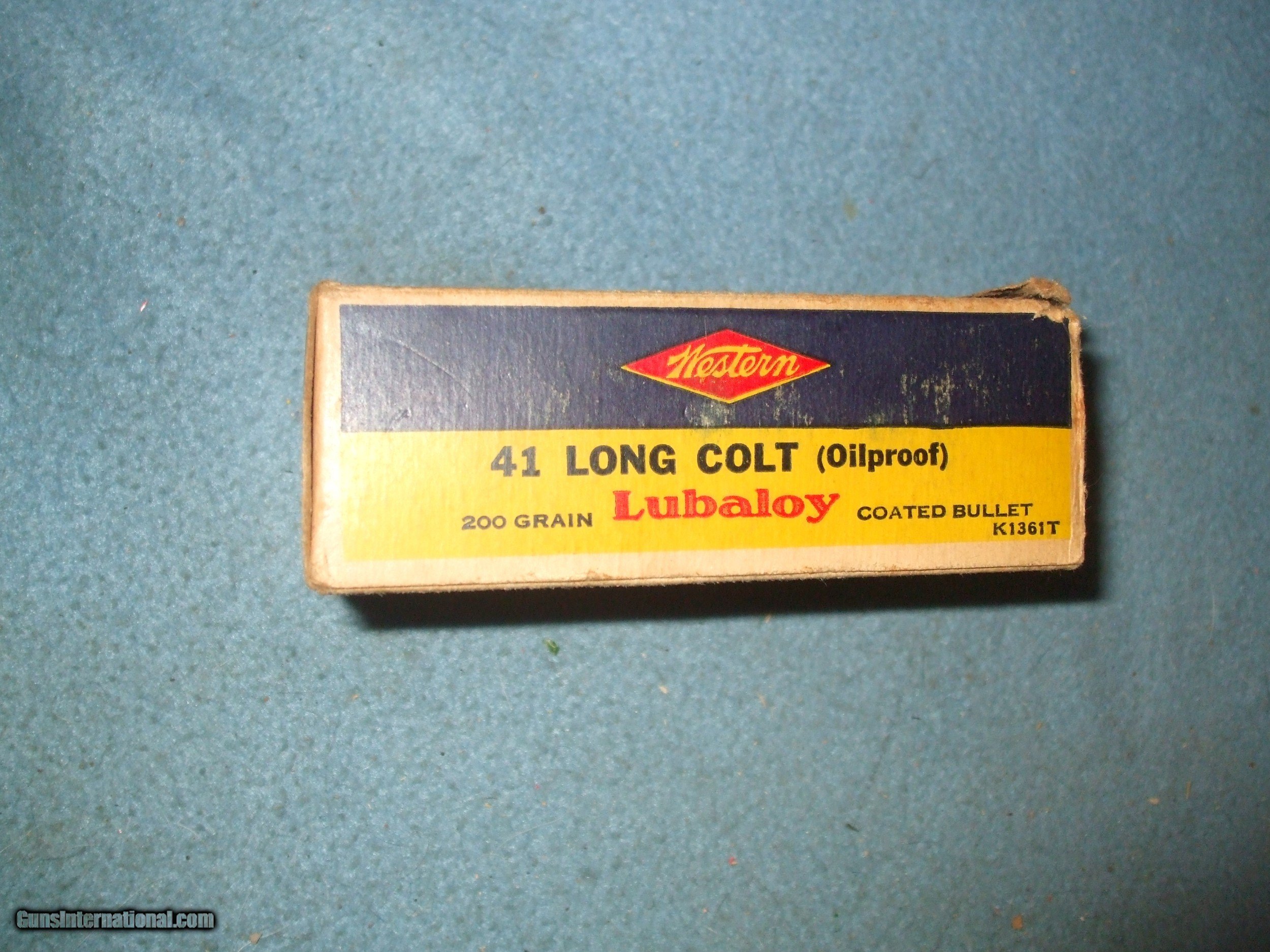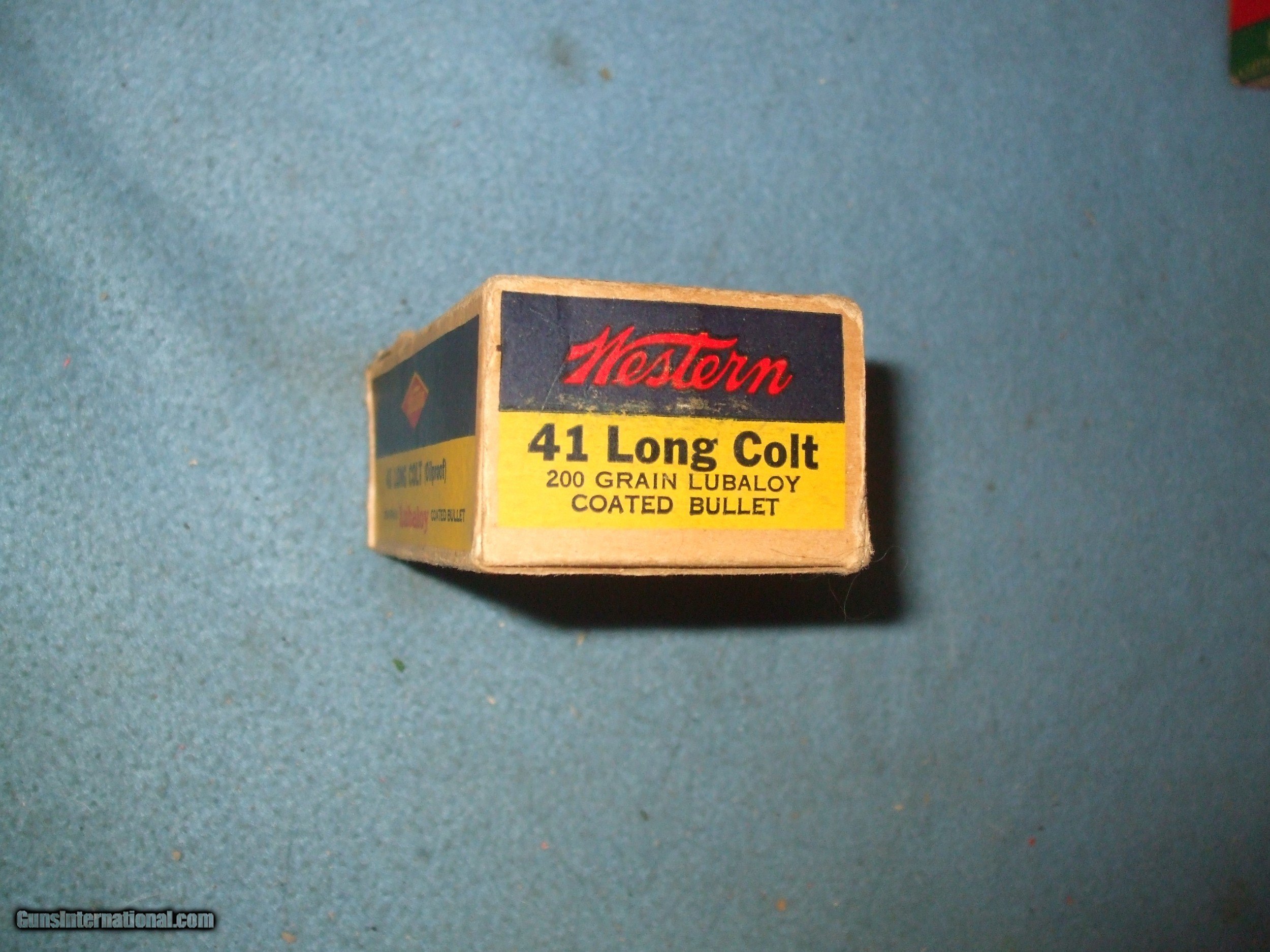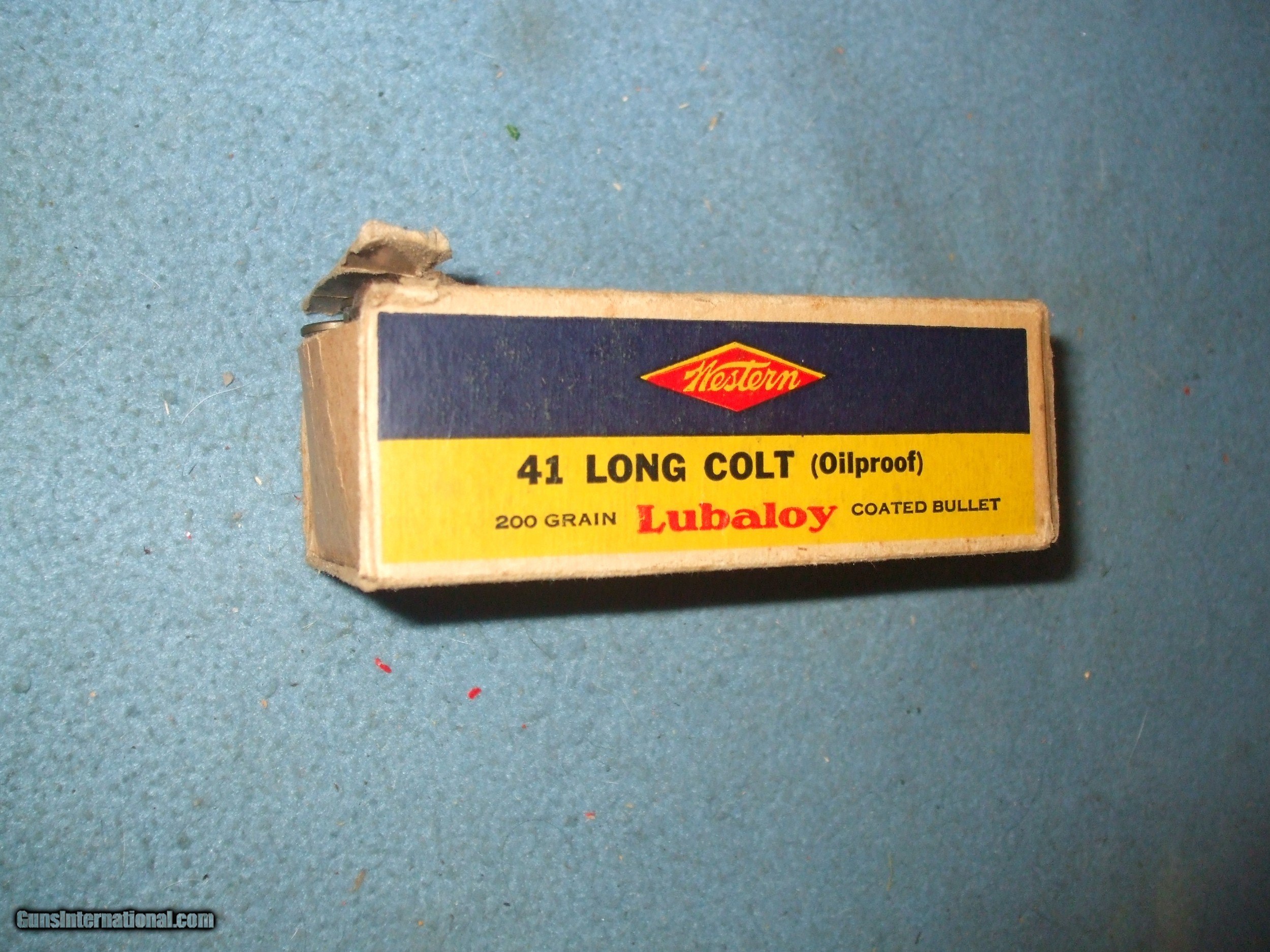 Description: Western 41 Long Colt 200gr Lubaloy. Full box 50rds. End flap missing on one end of box otherwise box in good shape. Ammo excellent. Rare cartridge rare box. Please note cannot ship to CA, MA, NJ, IL or any other restricted areas. I am located in Delaware and can deliver locally. SOLD Handgun Caliber: .41 Long Colt (.41 Colt, .41 LC) |