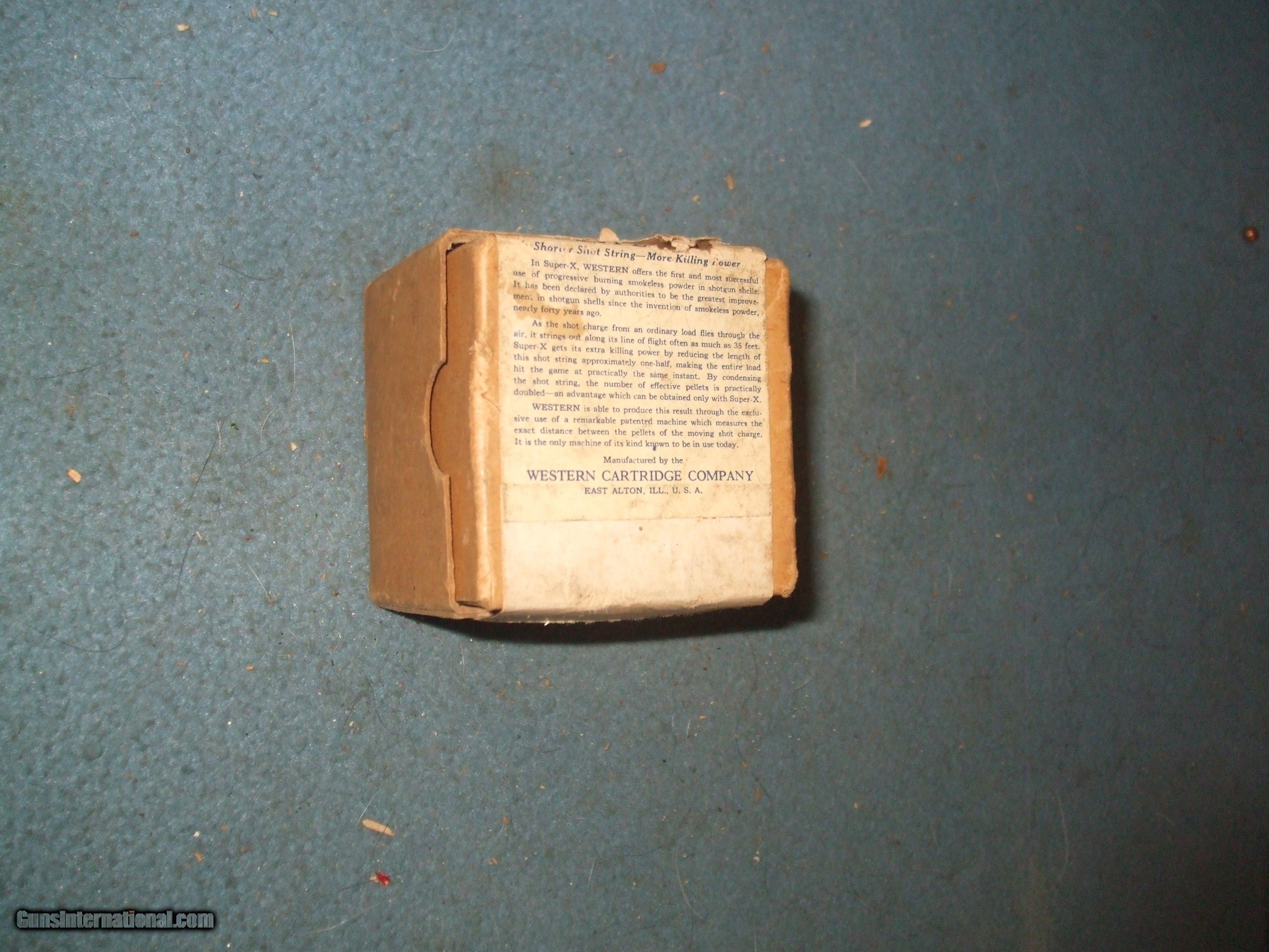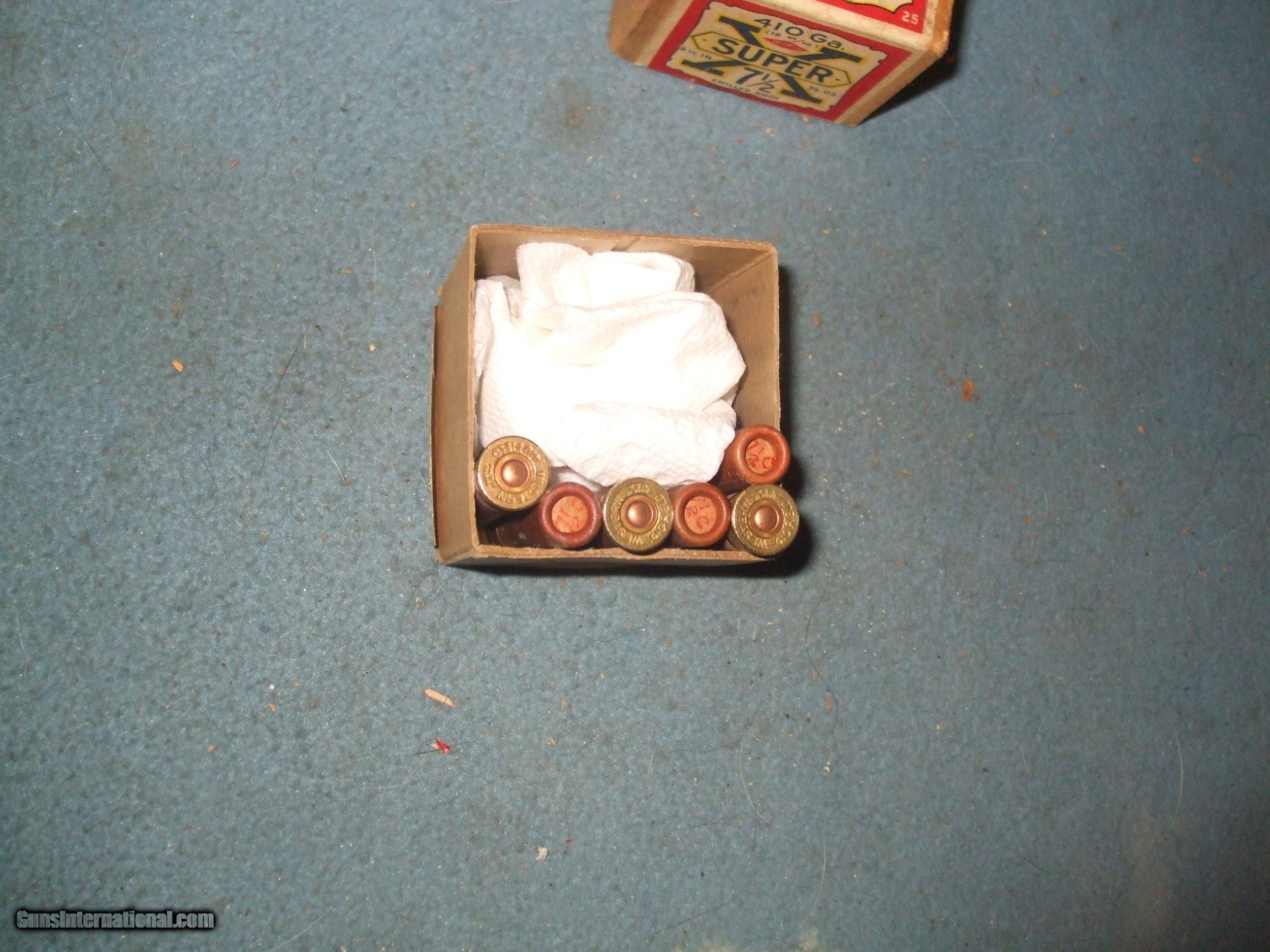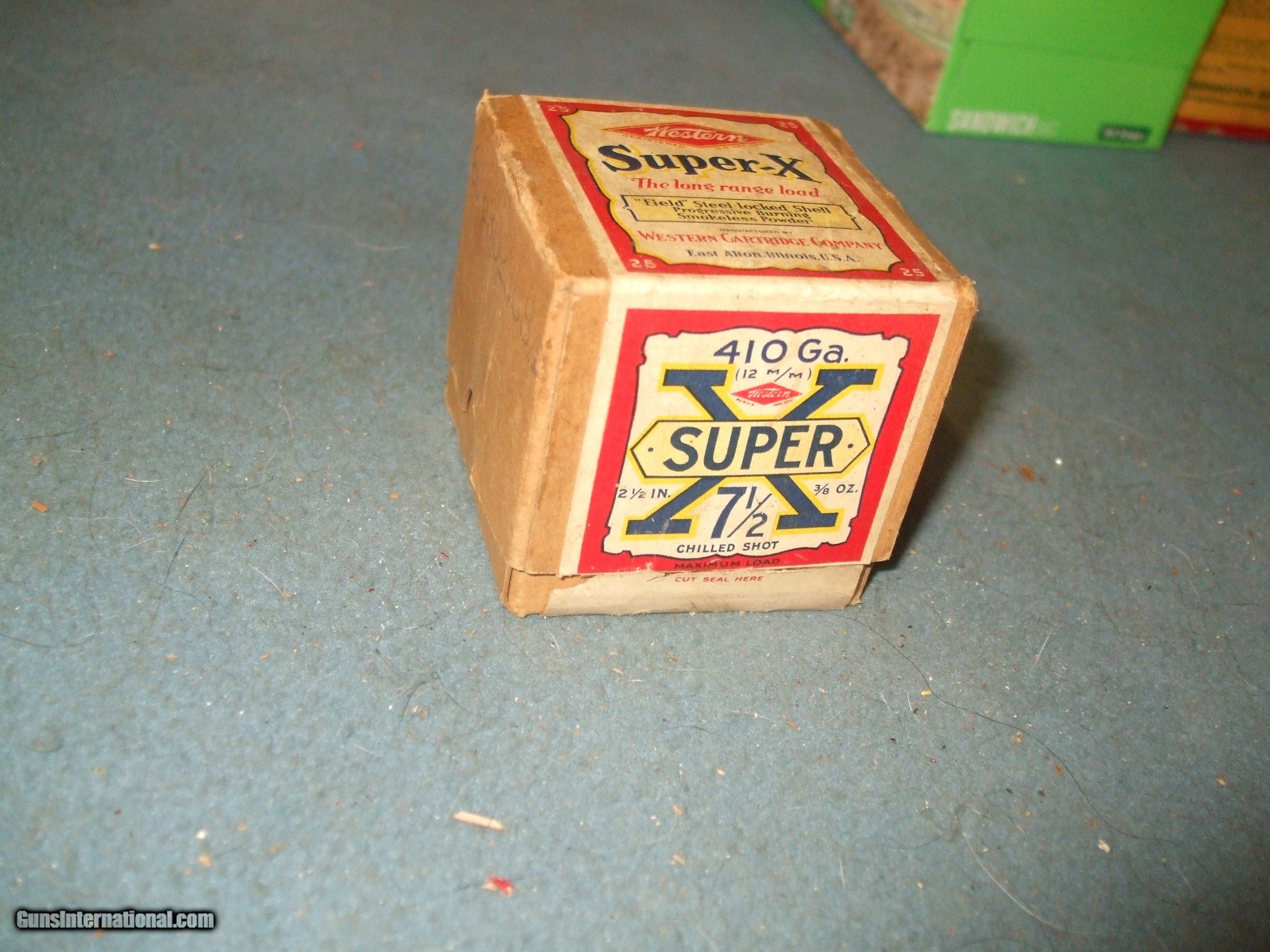 Description: Western 410 Super X 21/2" #71/2 shot. Paper shell roll crimp. Early Western slip top box with good graphics. Not a full box 6rds only. Shells very good. Please note cannot ship to CA, MA, NJ,IL or any other restricted areas. I am located in Delaware and can deliver locally. SOLD Shotgun Gauge: .410 Gauge |