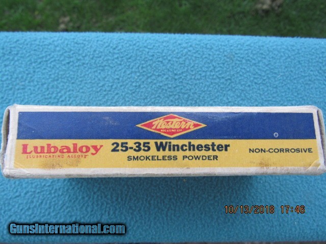 Description: Full box of the original 20 rounds with matching headstamps. Bright and colorful Western Bullseye box of 25-35 Winchester ammo. Shows some shelf wear, light staining and a bit of pencil writing. One end flap is sound, other is split about 1/2 way but still attached. Rounds in good shape. Soft point boat tail bullets a bit of an oddity for a lever action caliber. Payment via money order, bank check or PayPal. Ships to US addresses only via UPS Ground. Buyer pays actual shipping cost plus $3 for packing materials. Will combine shipping for multiple ammo boxes purchased so check my other listings. Please be sure this is legal for you to purchase and own; must have copy of photo ID included with payment. SOLD |