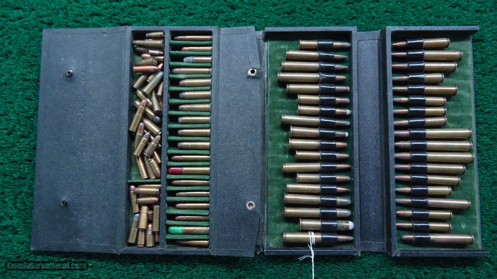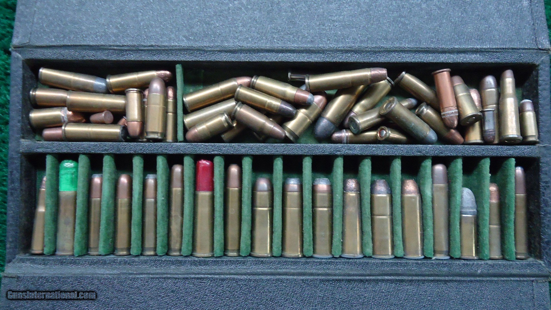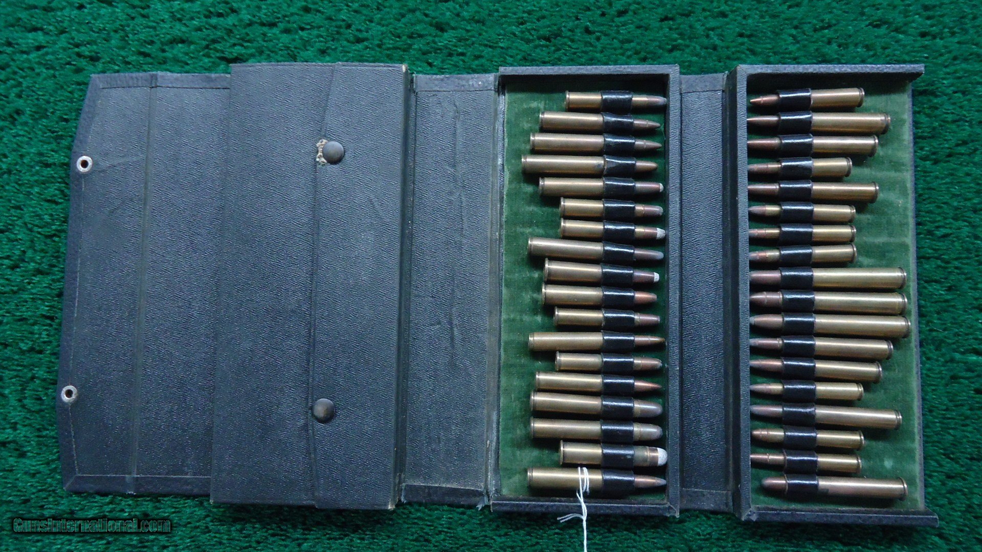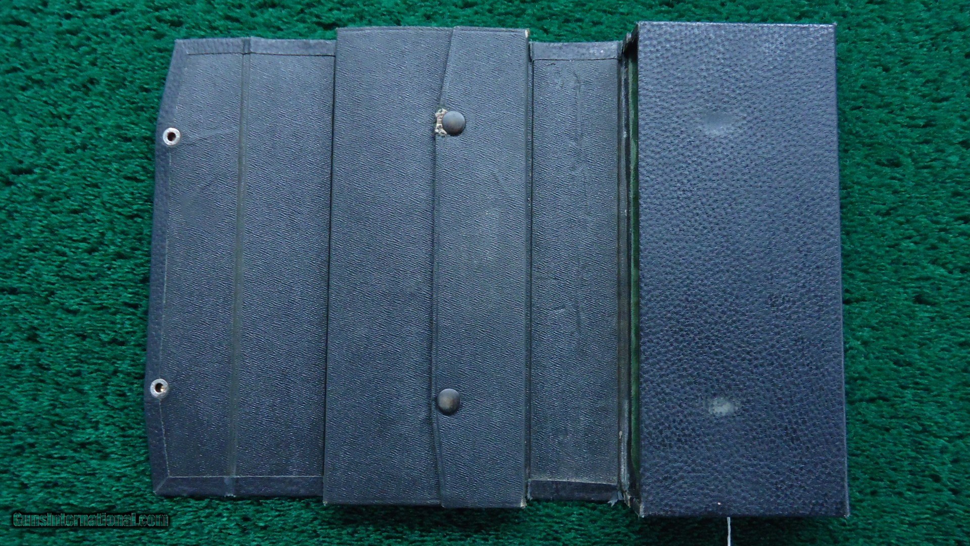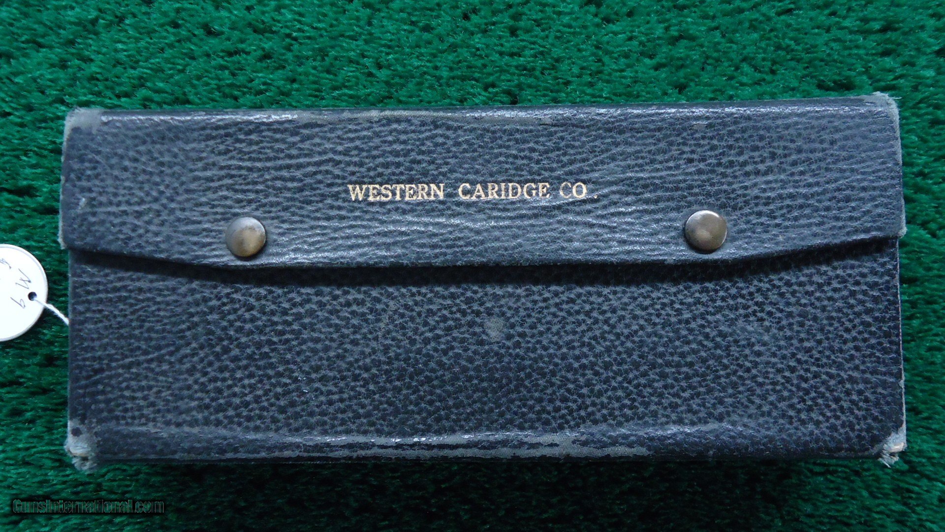 Description: This traveling case folds and has 4 layers of cartridges displayed. About 80 cartridges with about 3/4 of them in individual slots. Marked on the outside of the black leatherette case is "Western Cartridge Company". I have seen a few of these but they are a rather scarce item. A unique piece of Americana. Leroy Merz Antique Firearms specializes in antique and vintage Winchesters and other fine American firearms. Since 1965 Mr. Merz has taken part in the world of firearms and has been a contributor to many well known reference books. Just recently we mailed the 129th edition of our privately-published catalog. We have hundreds of additional guns in every price range at our home online. Search for Merz Antiques in google. SOLD |