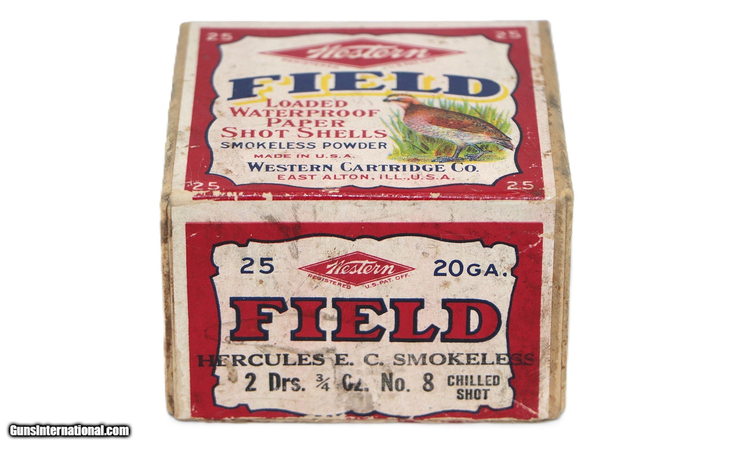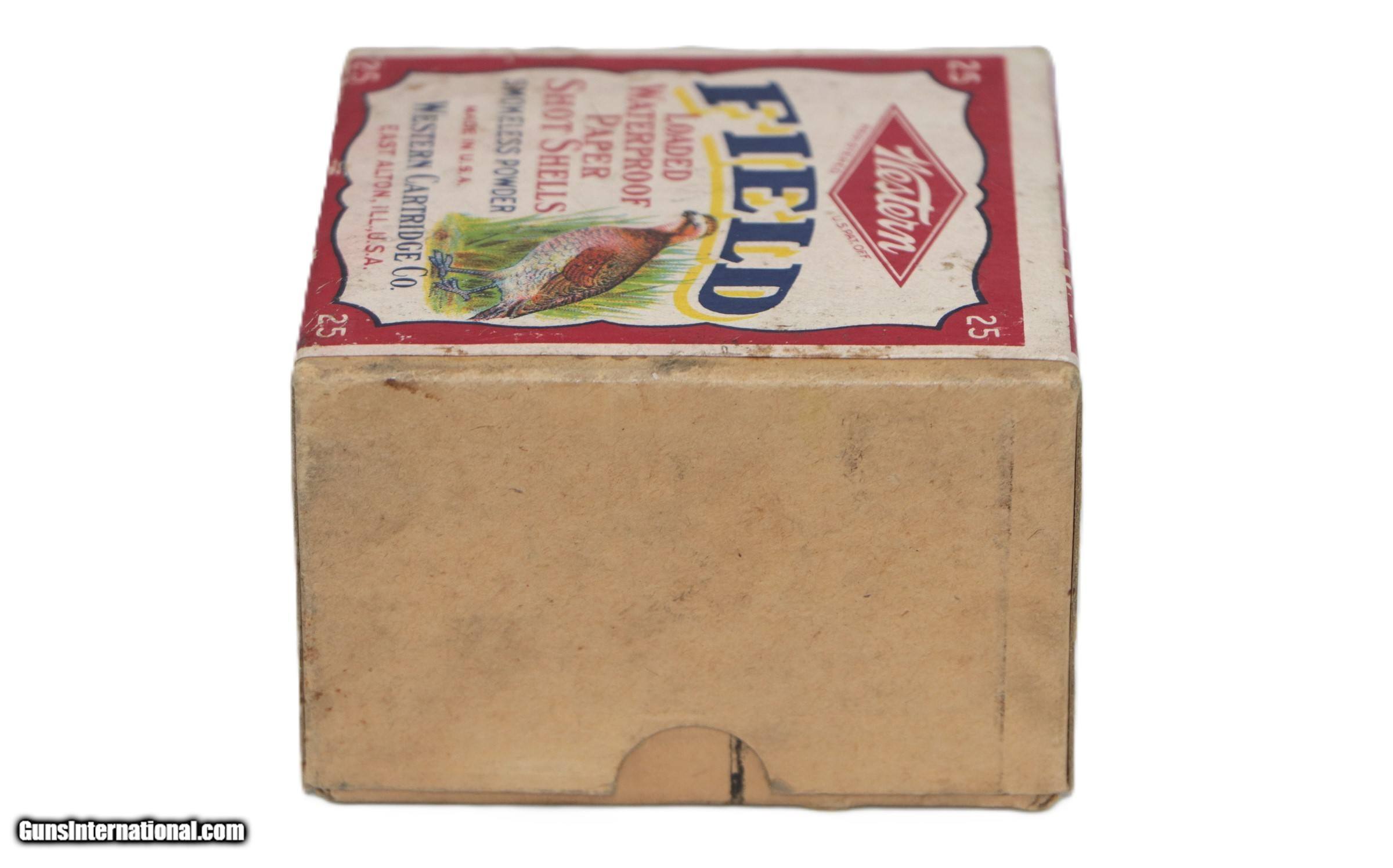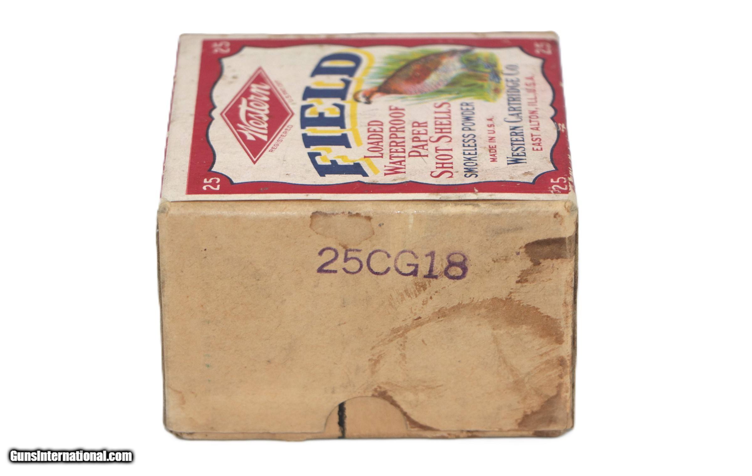 Description: Western, Field, 20 Gauge, Shot Size 8, 3/4 oz., 2 Drs, 25 Factory Rounds. Box is VG+ - Exc with a few scuffs at seal break and and some age staining. Side of top half of box has a couple small water stains. Ammo is Exc++. Add $14 for Shipping SOLD Shotgun Gauge: 20 Gauge |