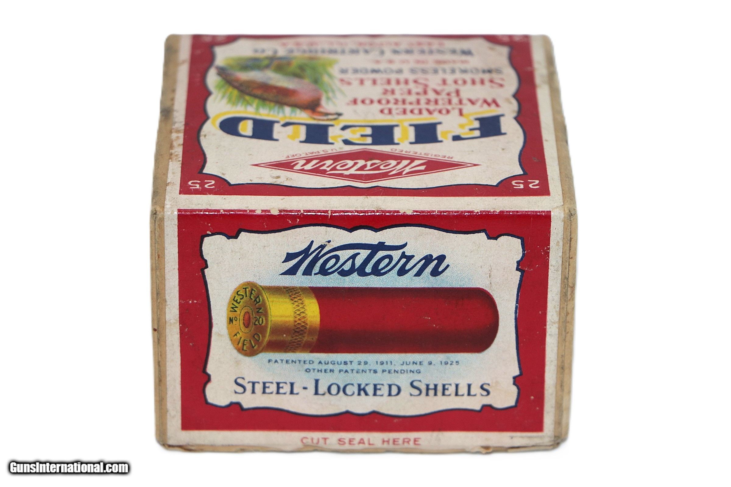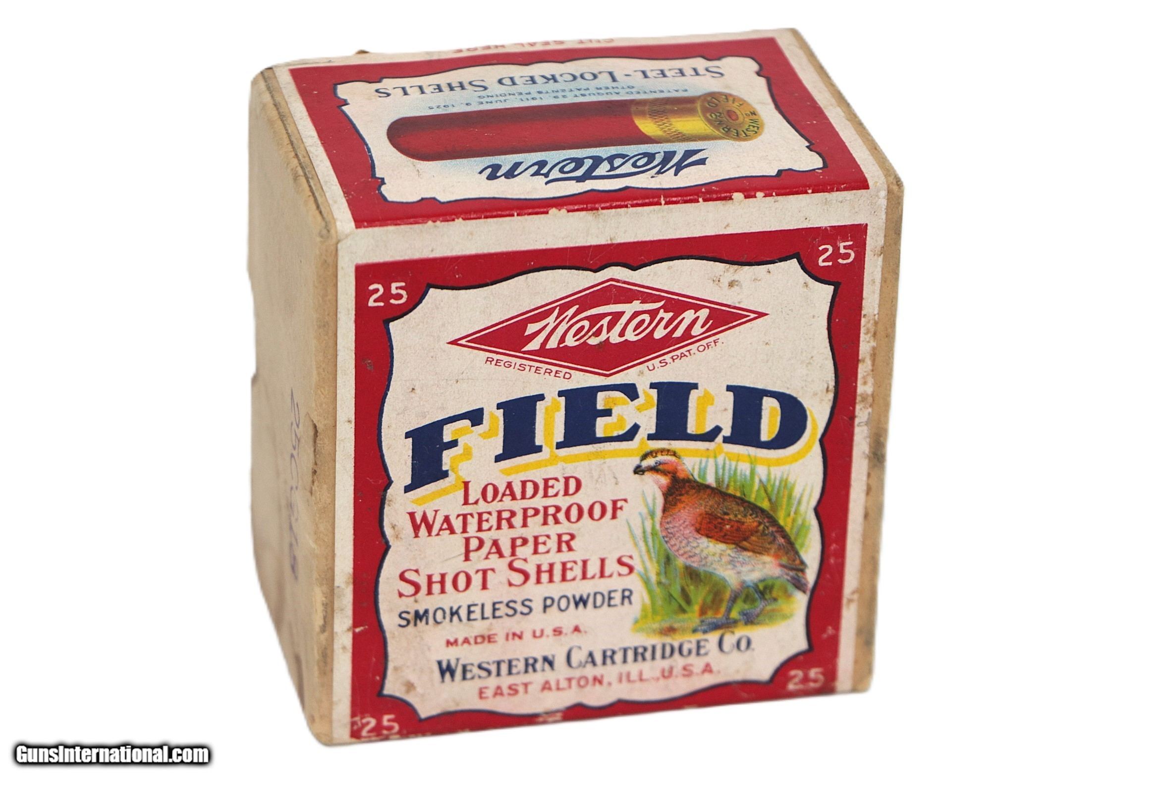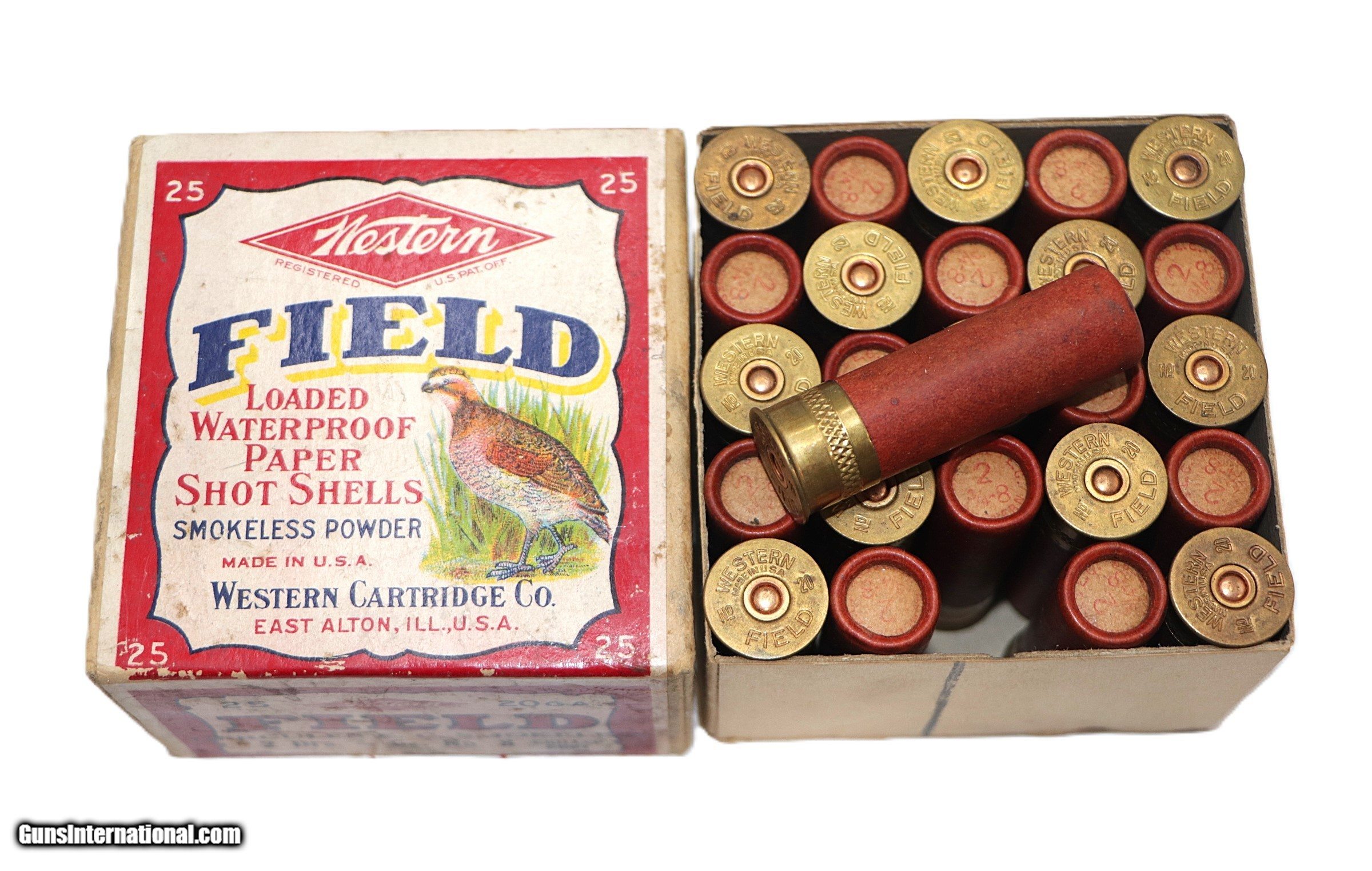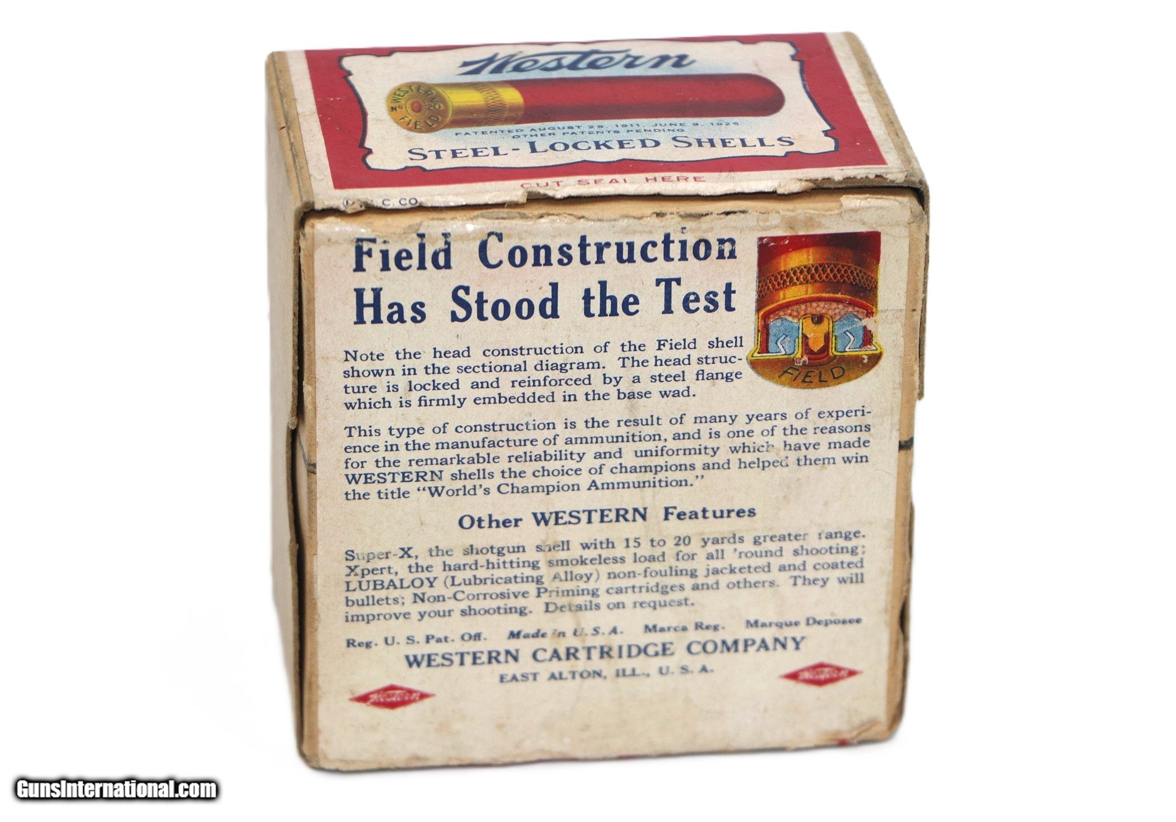 Description: Western, Field, 20 Gauge, Shot Size 8, 3/4 oz., 2 Drs, 25 Factory Rounds. Box is VG+ - Exc with a few scuffs at seal break and and some age staining. Side of top half of box has a couple small water stains. Ammo is Exc++. Add $14 for Shipping SOLD Shotgun Gauge: 20 Gauge |