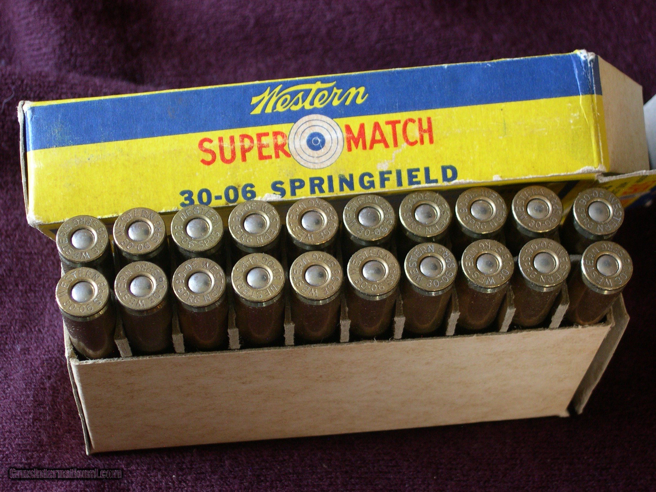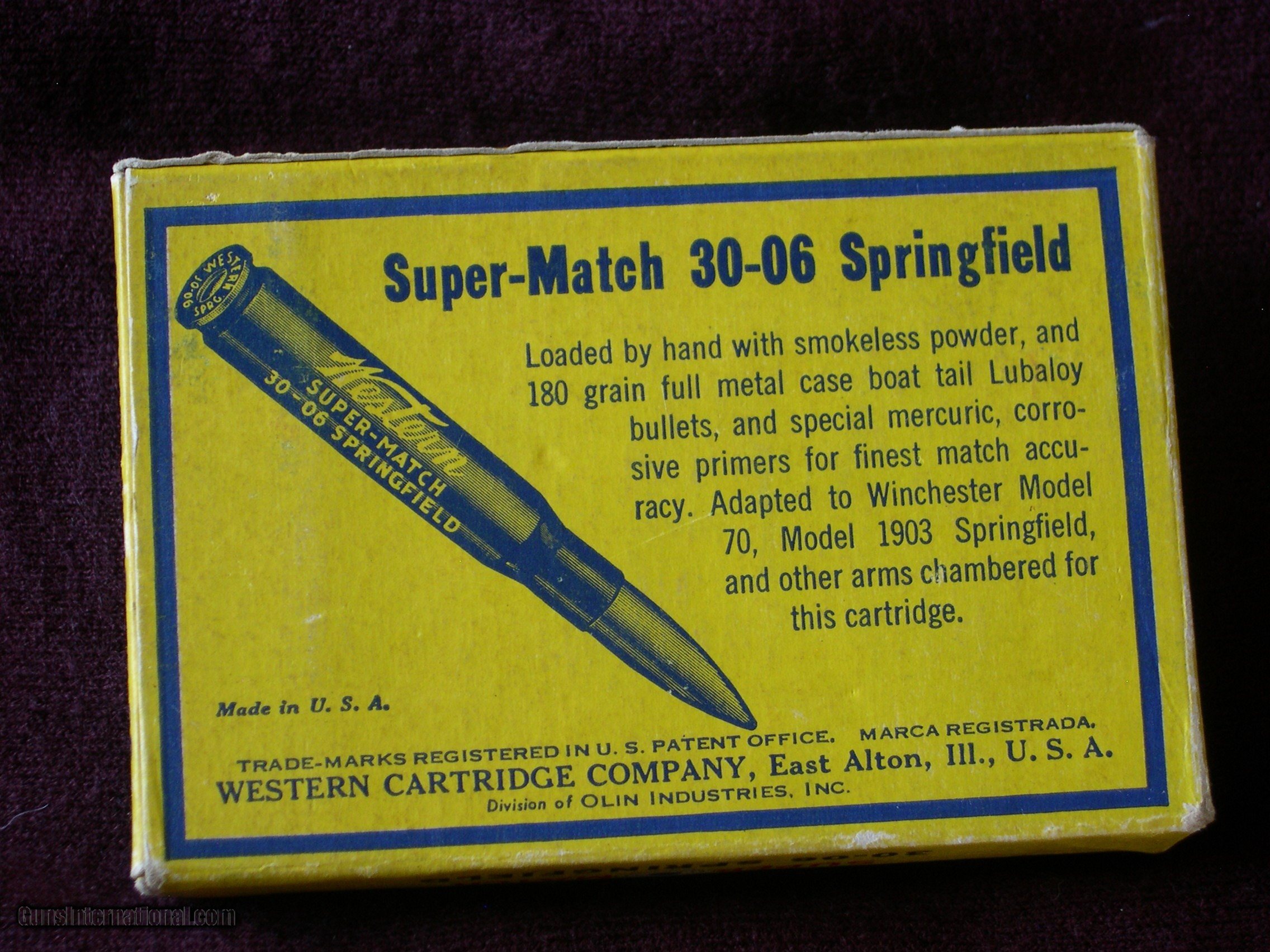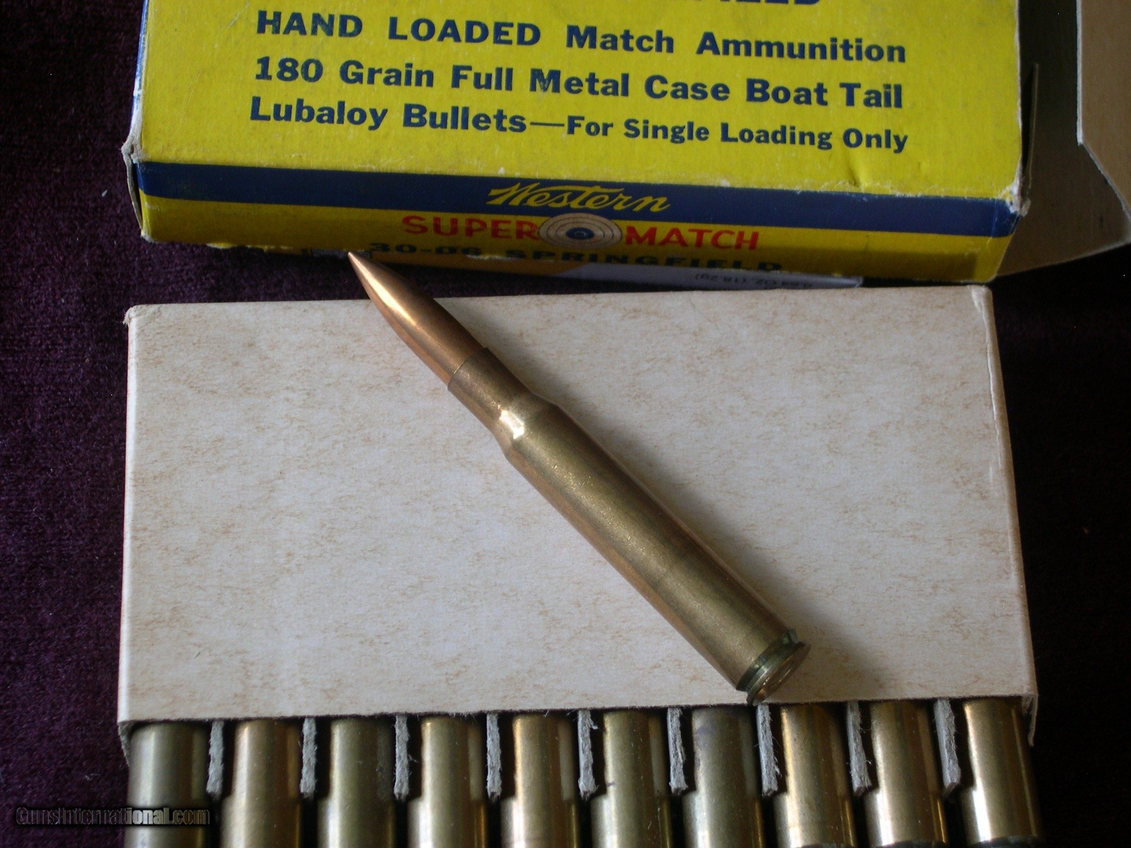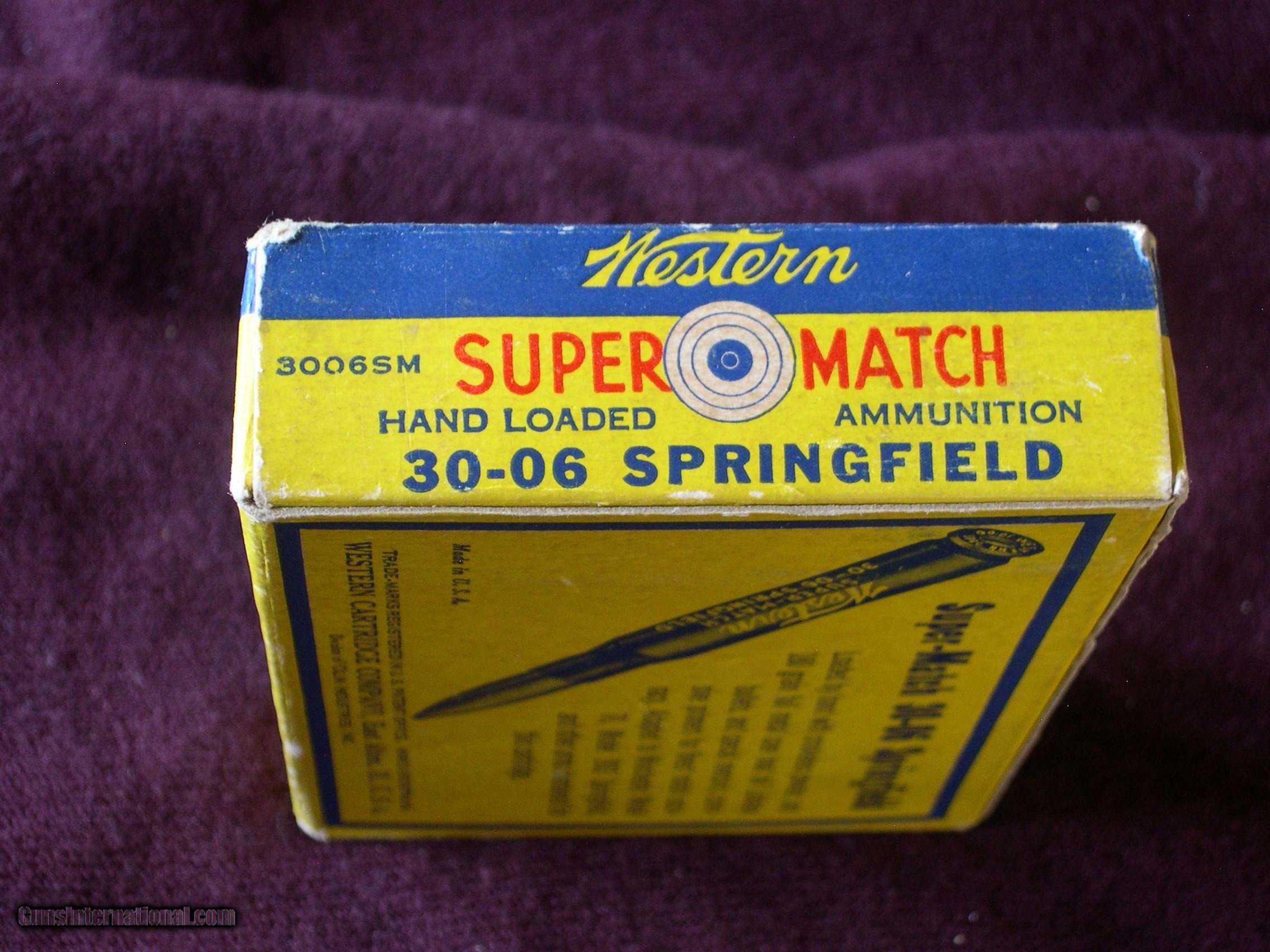 Description: I never saw a box like this before, perfect condition and full, 20 count in mint condition, Hand loaded by the Factroy, with 180 gr boat tail bullets, read the label, pretty impressive details !! Great display box for Springfiled Target rifle & M-1 Garand !! Notice that they use corrosive mercuric primers for better accuracy, on the label?? SOLD |