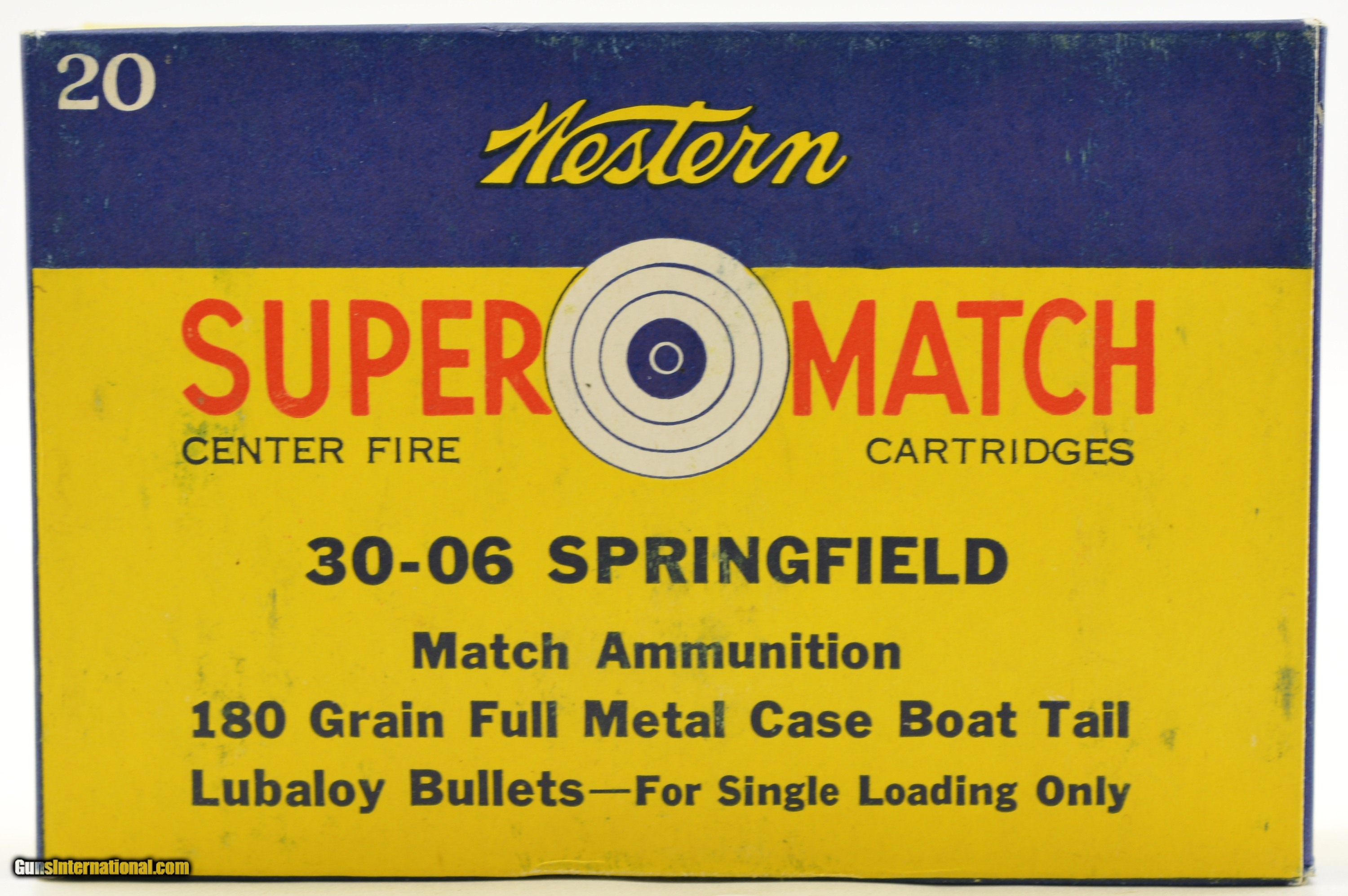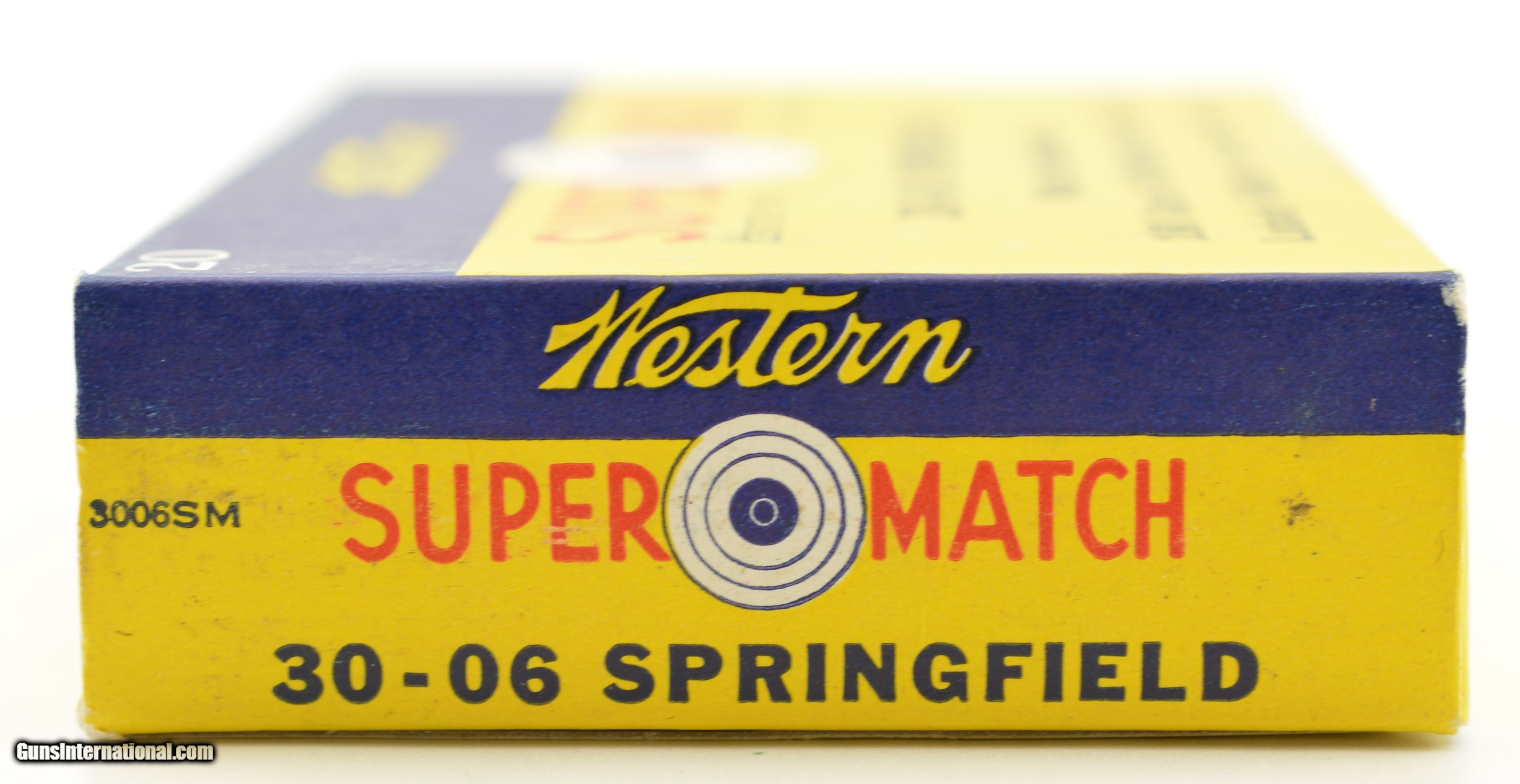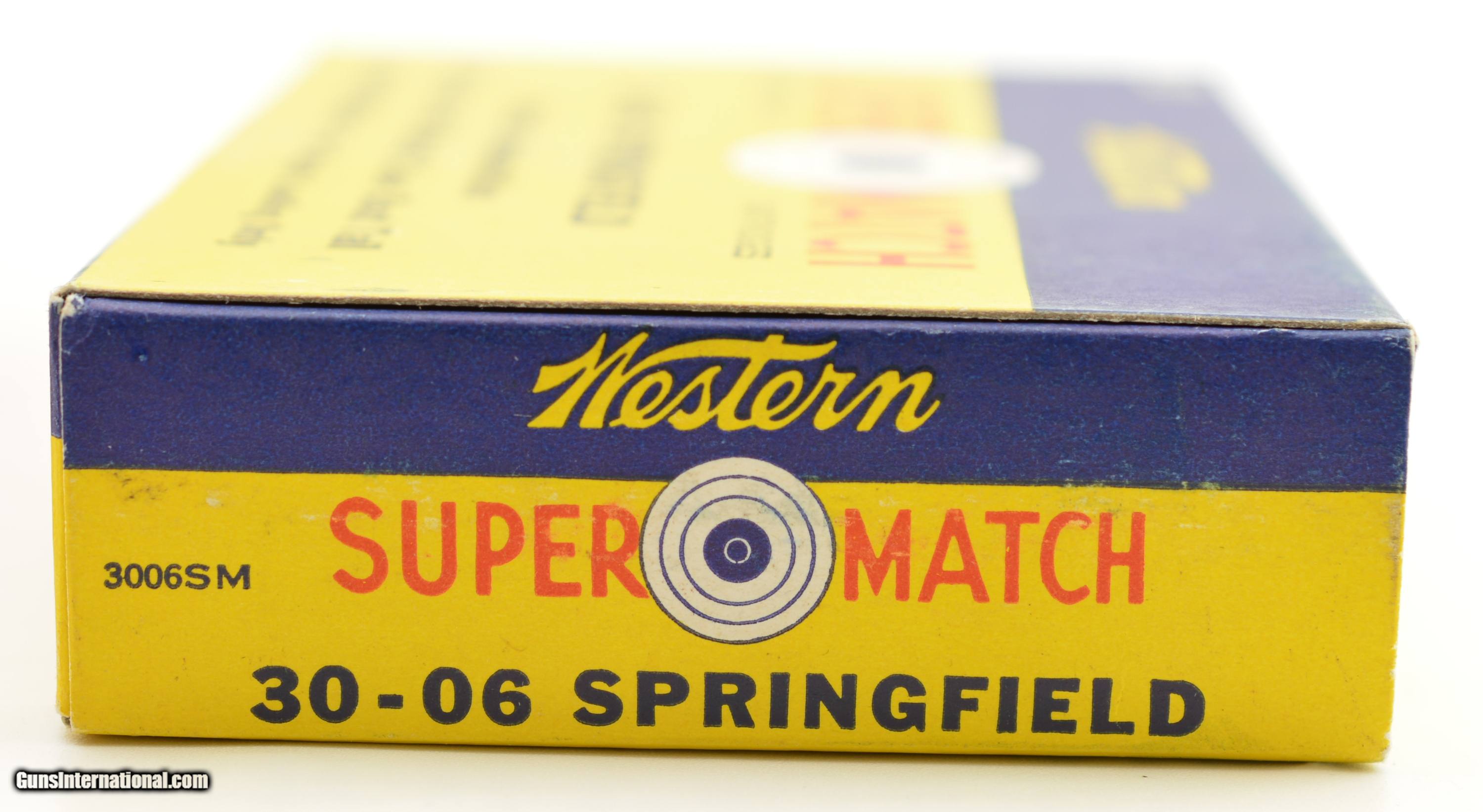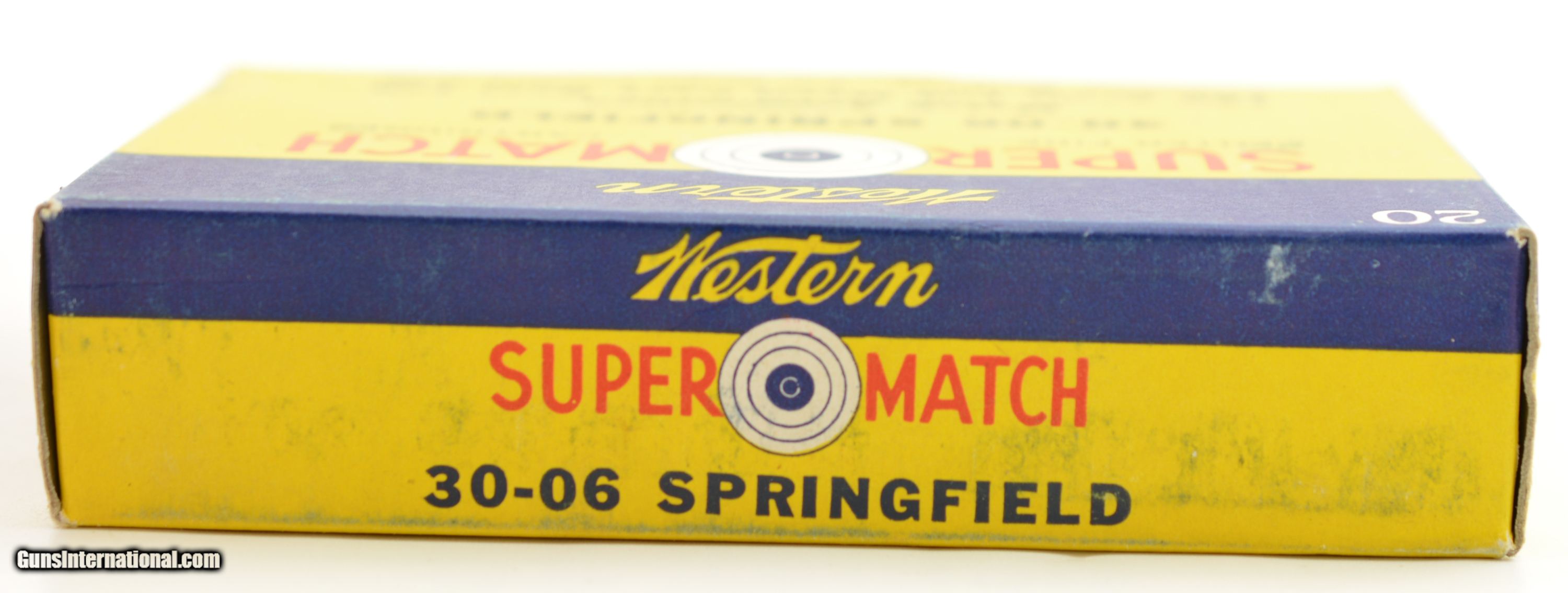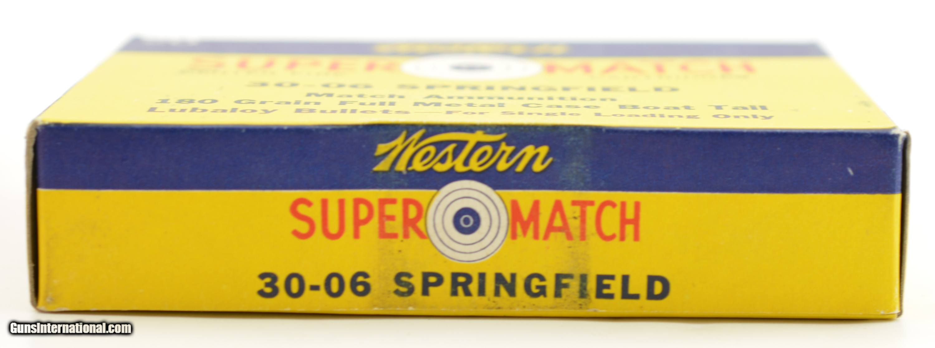 Description: This is a full box, 20 original rounds, of Western .30-06 Super Match ammunition with 180 grain full metal case boat tail Lubaloy bullets. The one piece yellow, blue and red box is in excellent plus condition appearing fresh with bright colors and only rub wear from other boxes in the original case and writing on the underside and subtle indent on the bottom. The cartridges are in excellent condition. An excellent box for display. SOLD Manufacturer: Western Caliber Info: .30-06 Gauge Info: .30-06 |