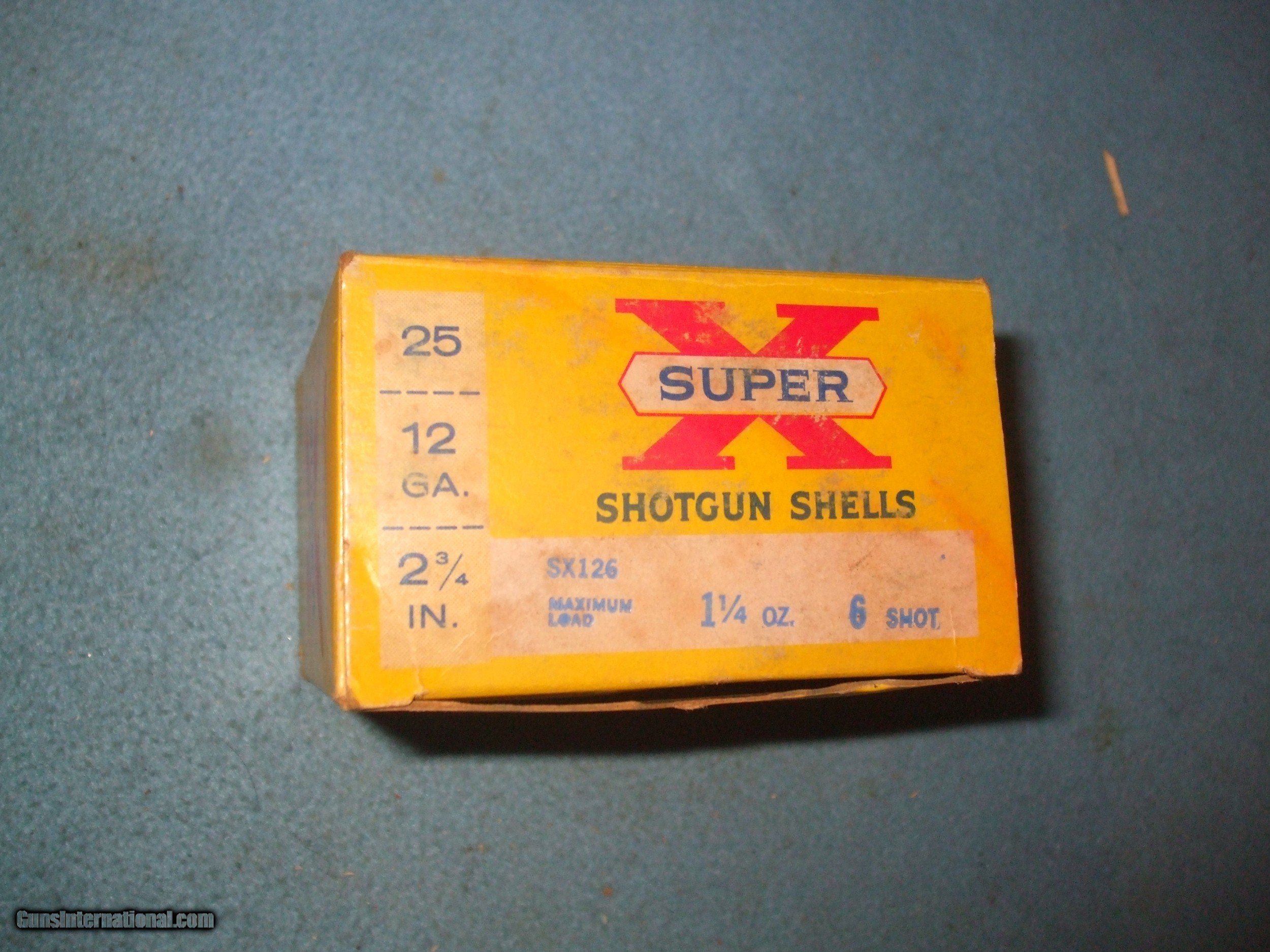 Description: Western Super X 12ga 1 1/4oz #6. Code SX126. Full box 25rds paper shells pie crimp. Box very good ammo very good. Please note cannot ship to CA, MA, NJ, IL or any other restricted areas. I am located in Delaware and can deliver locally. SOLD Shotgun Gauge: 12 Gauge |