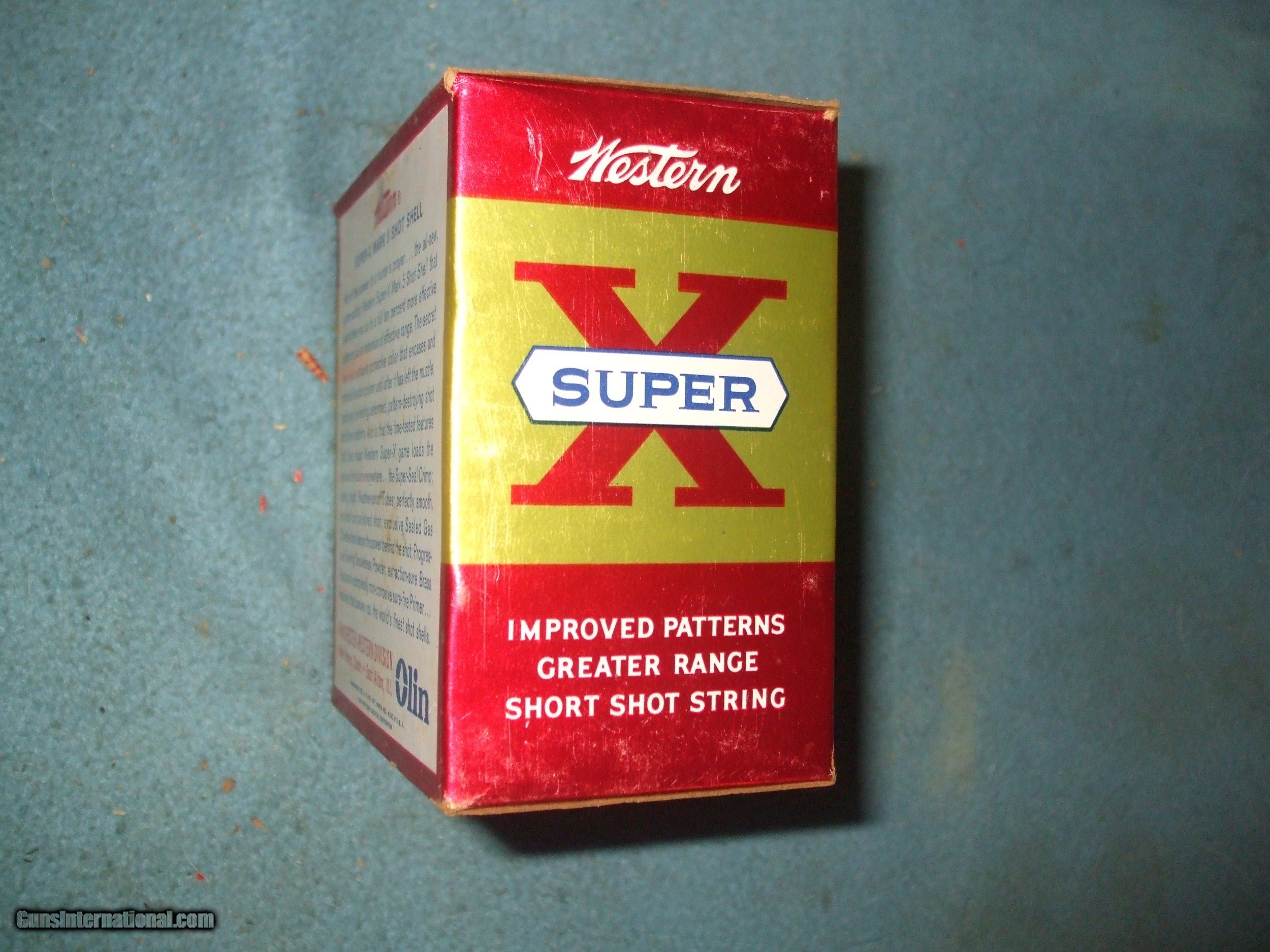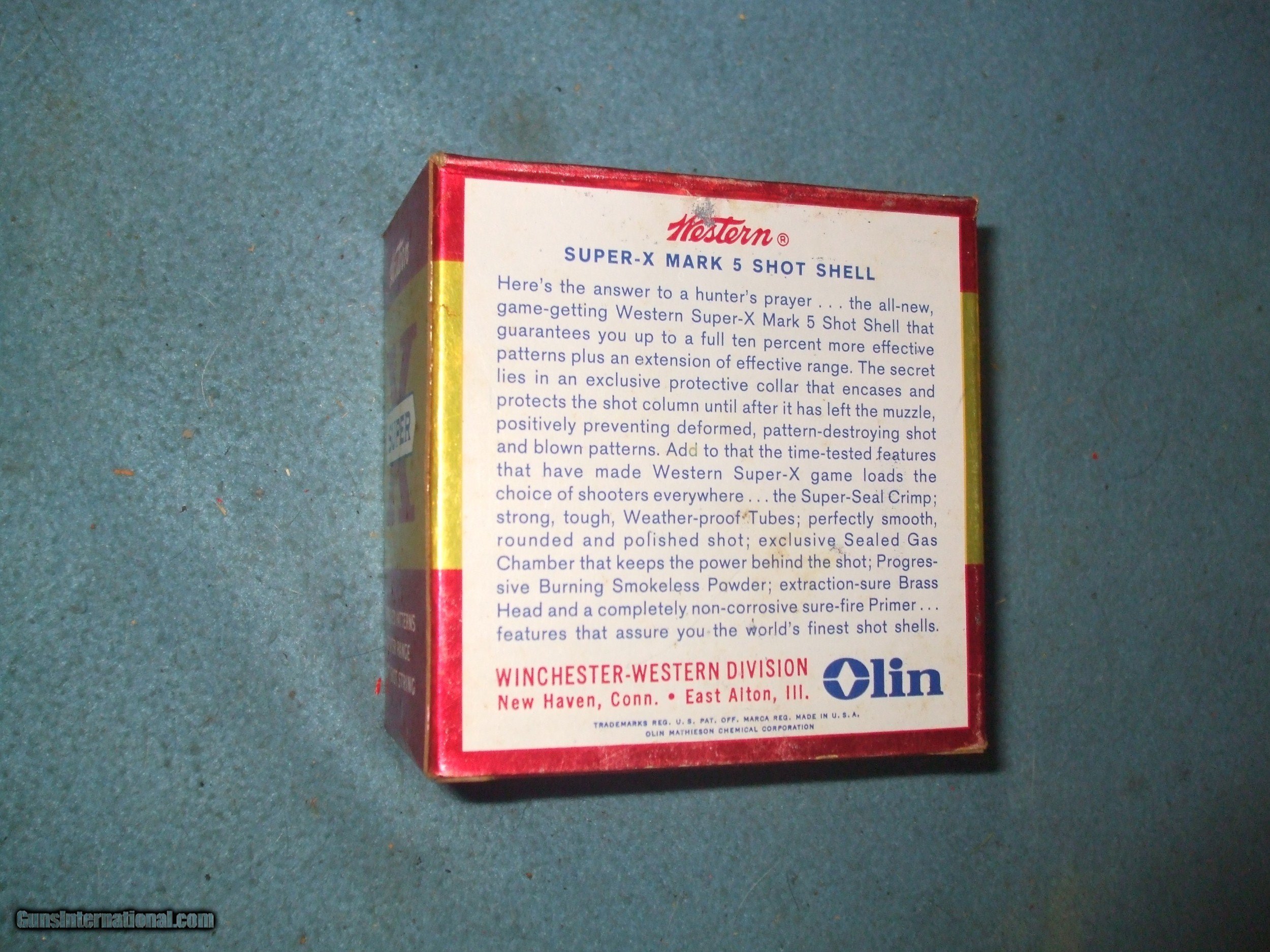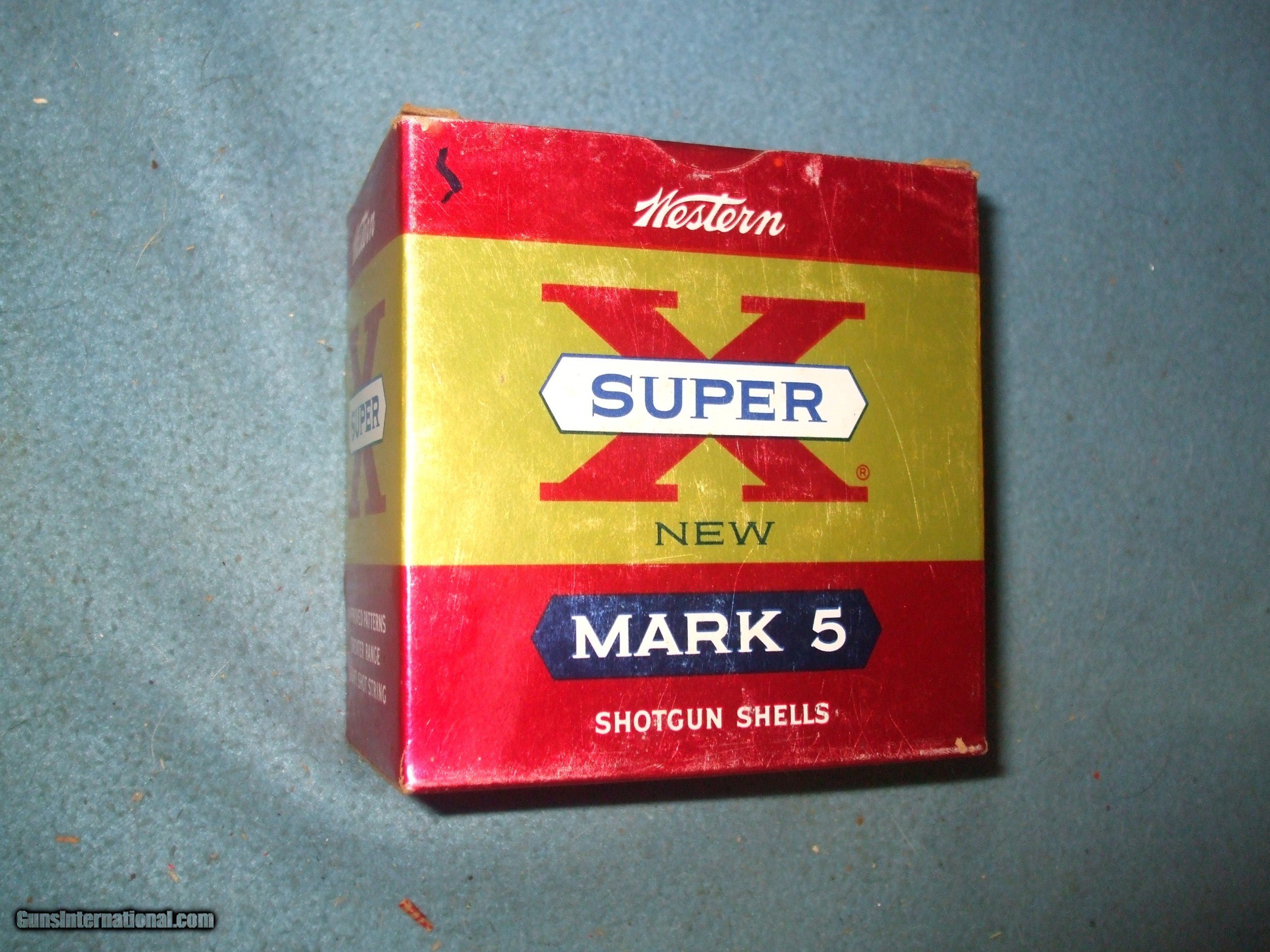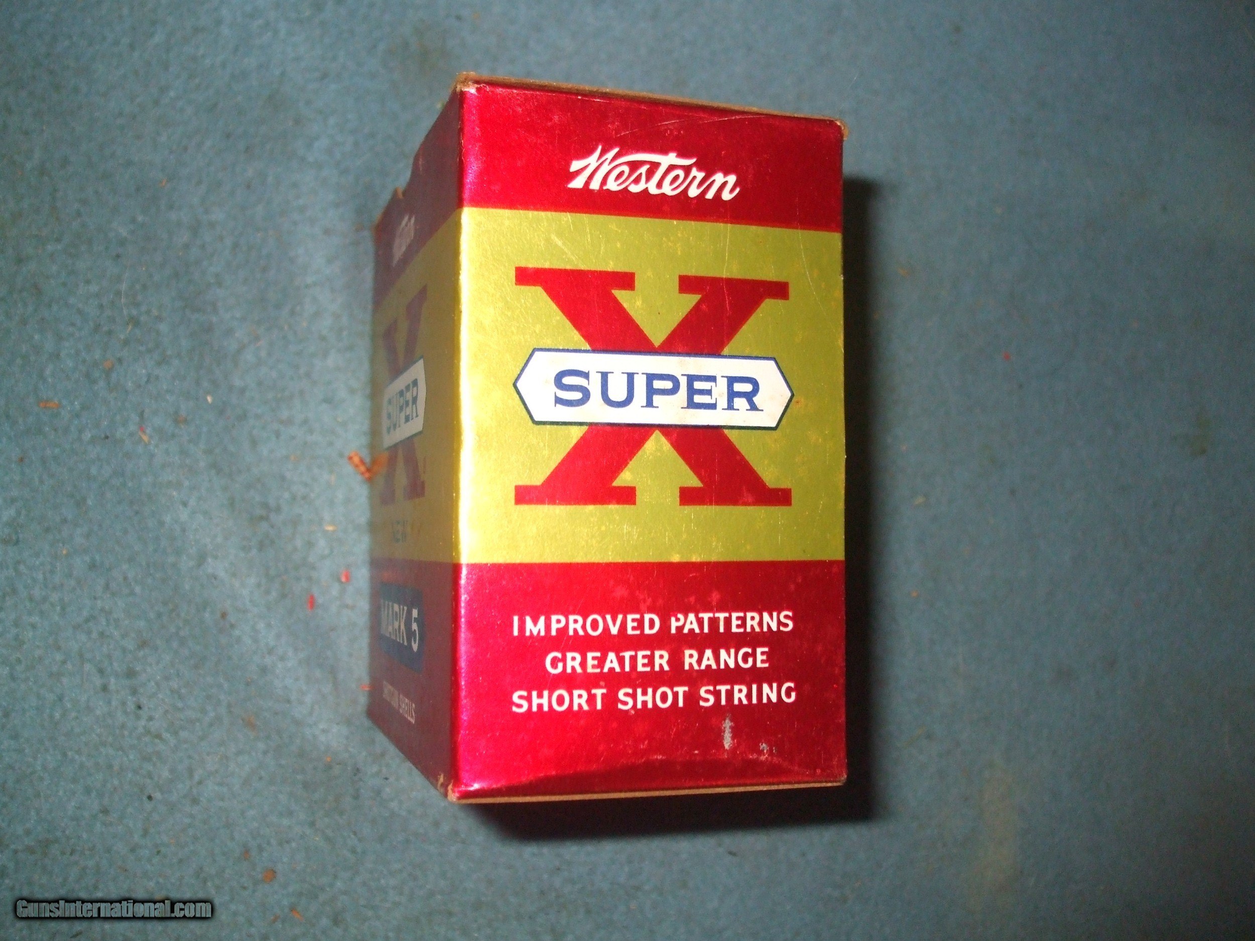Description: Western Super X 12ga 1 1/4oz 7 1/2 shot Mark 5 designation. Full box 25rds. Paper shells pie crimp. First glossy packaging from Western. Box excellent shells excellent. Please note cannot ship to CA, MA, NJ, IL or any other restricted areas. I am located in Delaware and can deliver locally. SOLD Shotgun Gauge: 12 Gauge |