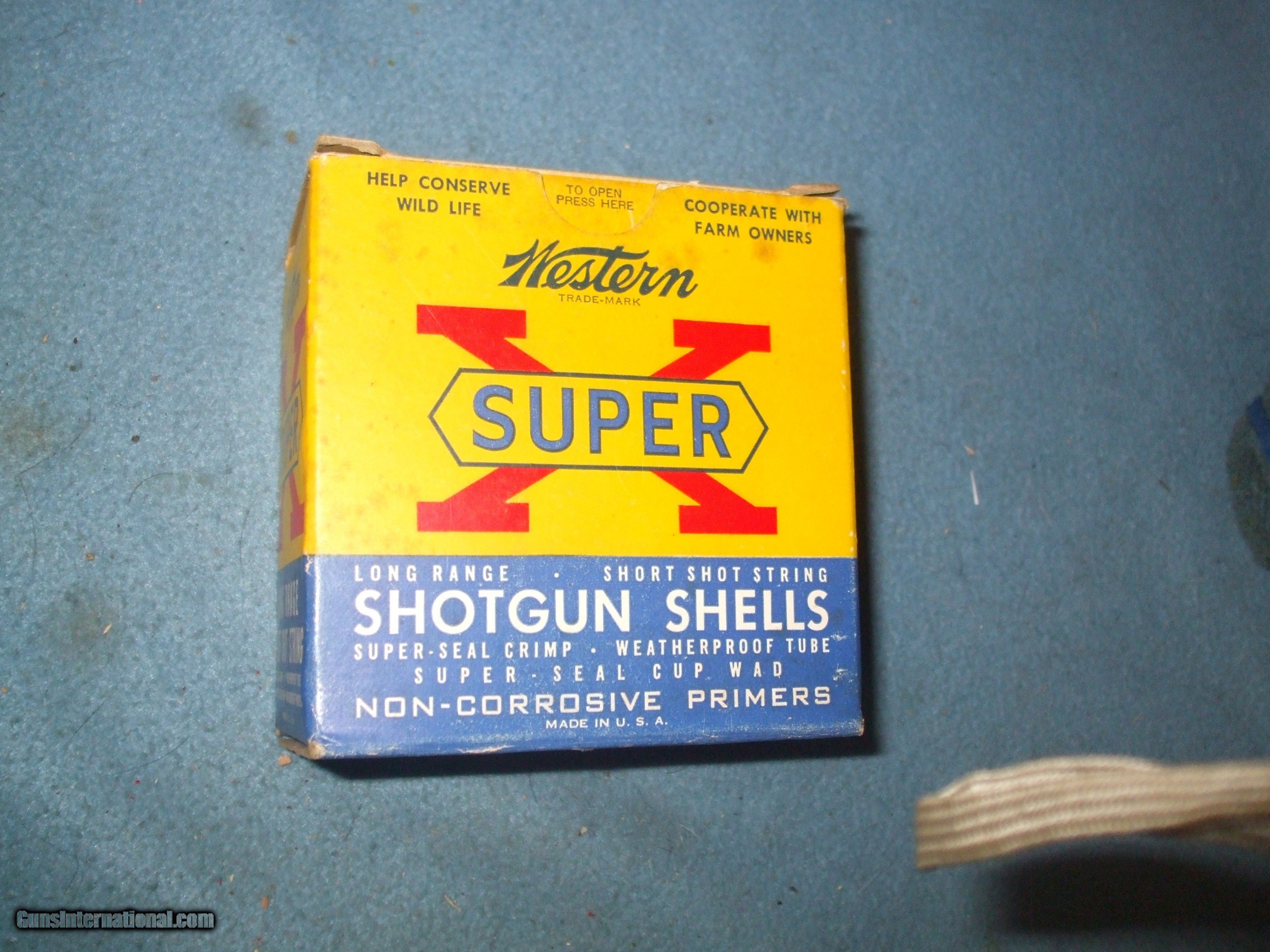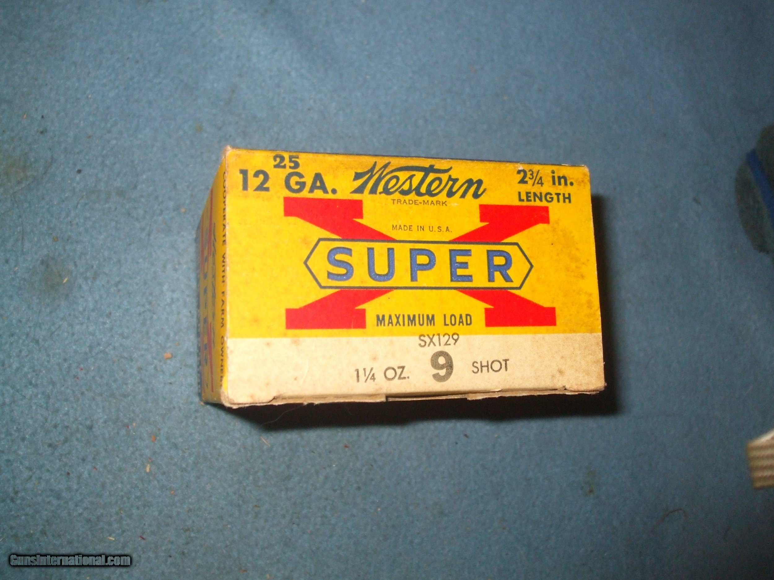 Description: Western Super X 12ga 1 1/4oz #9 shot. Code SX129. Not complete box 21rds. Unusual load in high brass shell. Paper shell pie crimp. Box condition good and shells excellent. Please note cannot ship to CA, MA, NJ, IL and any other restricted areas. SOLD Shotgun Gauge: 12 Gauge |