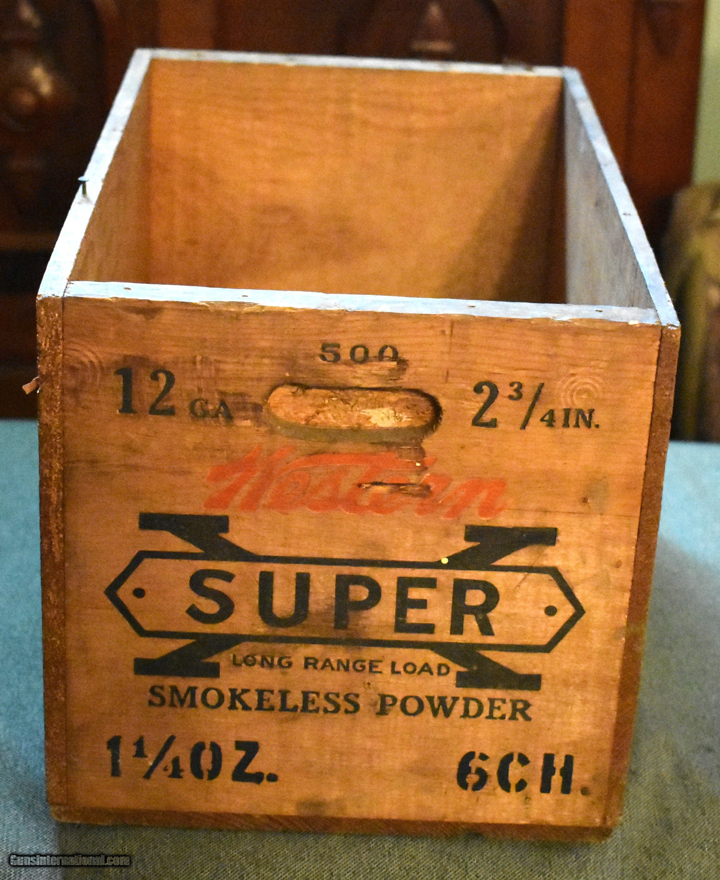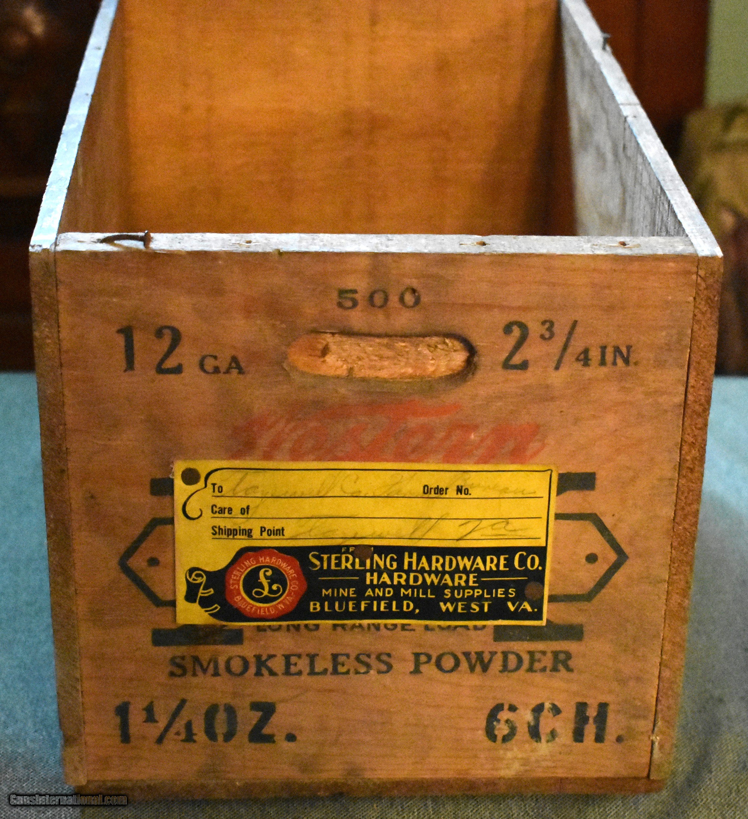 Description: A very nice condition Winchester Super=X 23/4" 12 gauge wooden shotshell box circa 1940s. This box is in excellent condition with bright graphics and sound construction. It still has the original shipping label. It was shipped to Sterling Hardware in Bluefield,West Virginia. An excellent decoratior item for your gun room,den,or hunting club.SALE PENDING SOLD |