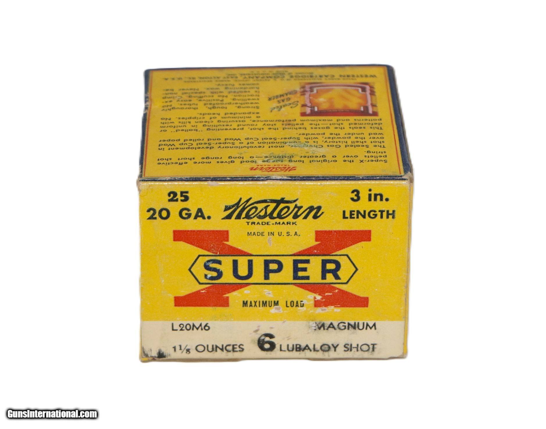 Description: Western, Super-X, 20 Ga. Magnum, 3", Shot Size 6 Lubaloy, 25 Mint Rounds in exc box with a few minor scuffs. Add 16.50 S+H SOLD |