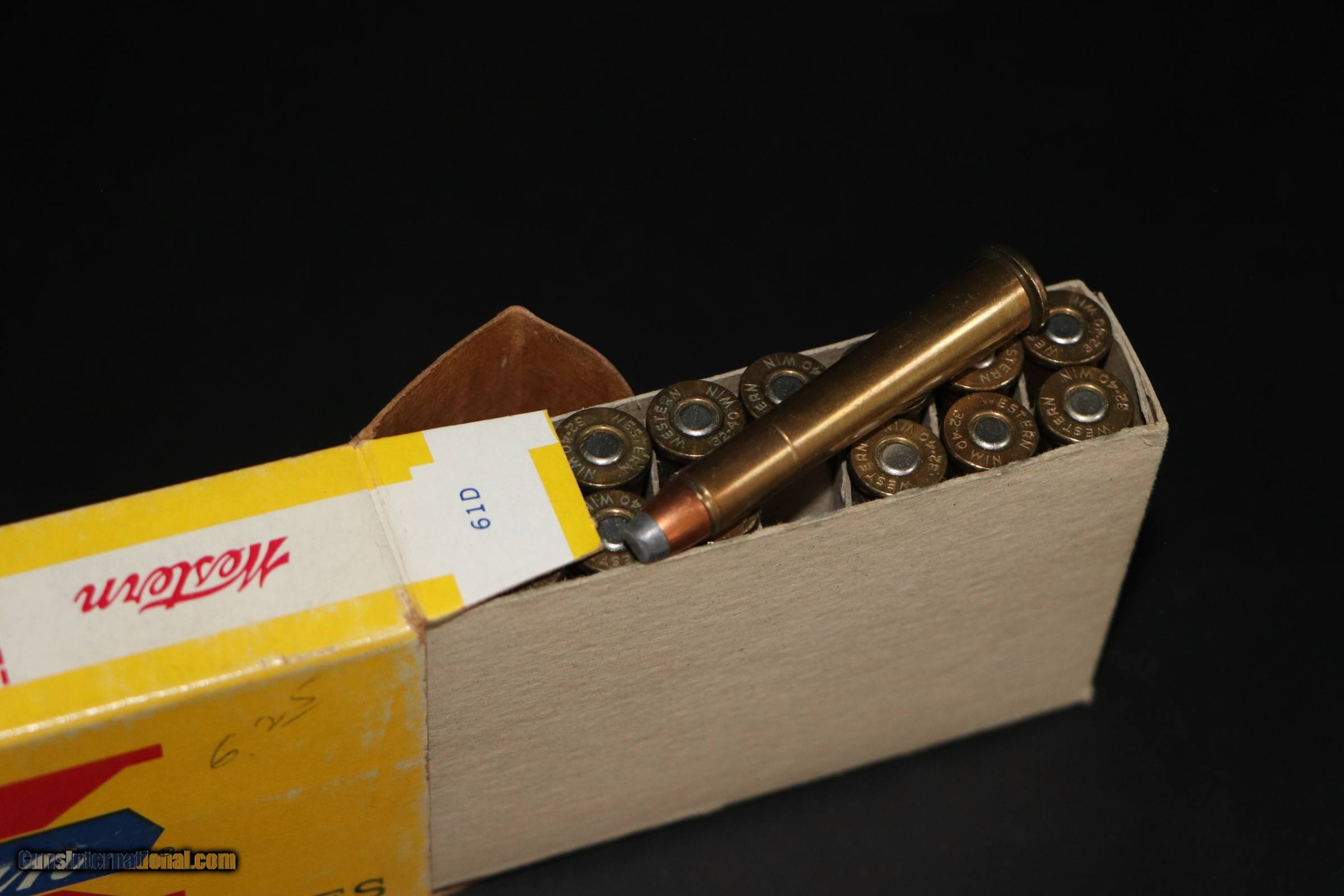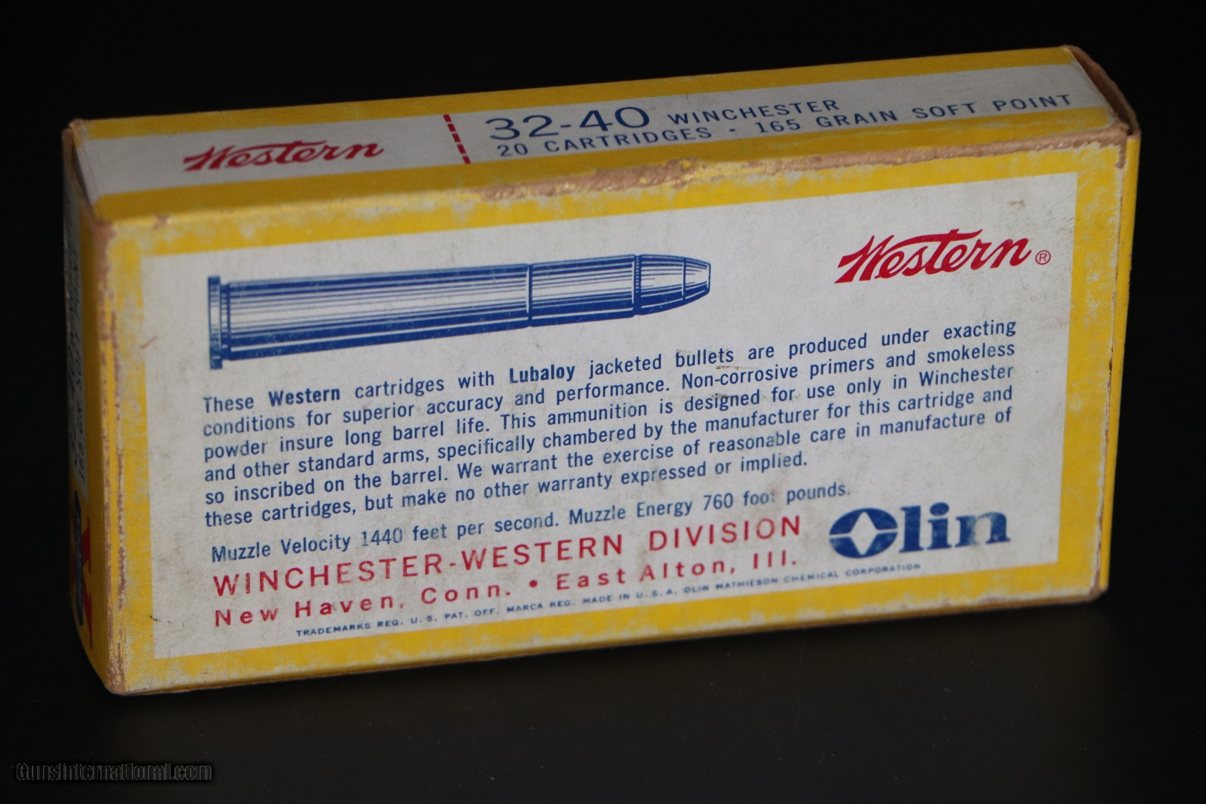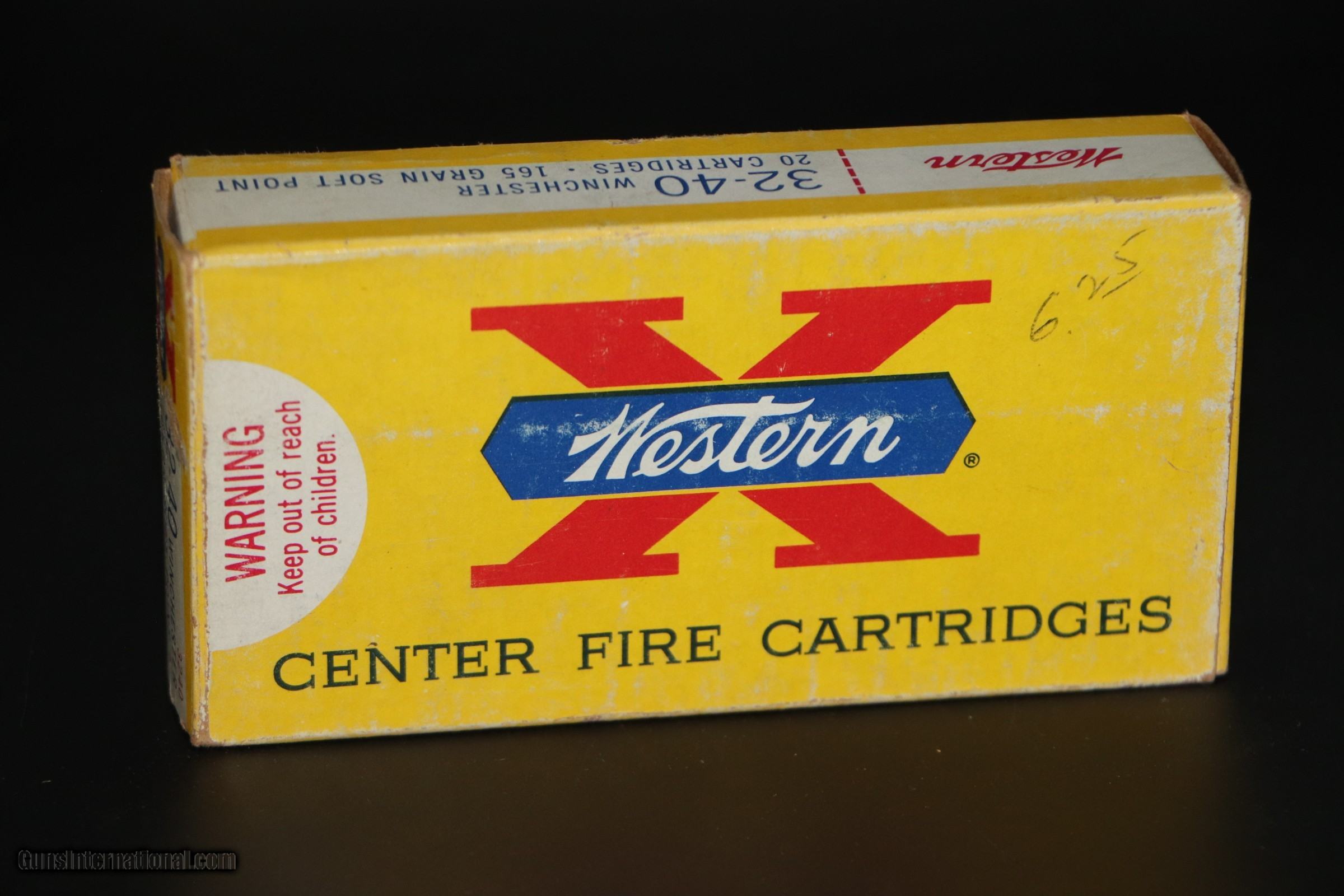 Description: Western Super-X, .32-40 Winchester 165 Gr. Soft Point, Full. Yellow red & blue box. Box solid with very good color and minor edge & corner wear. Top has been written on, end flaps are solid. Ammo is excellent. Add $13.50 S+H SOLD Rifle Caliber: .32-40 Winchester |
