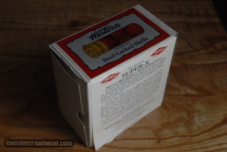 Description: Full unopened box of Western Super X Centennial Shotshells. These came out in 1992 and were made to resemble shells from 1922 vintage. They are paper shells with a disk in the front and roll crimped. Maximum load with 1 1/4 ounces of #6 shot. As you can see from the photos one corner of the box opened up and there is some show through of the dried up adhesive on the back label which is beginning to come loose. Actual UPS shipping costs to your zip code additional. Great display piece. SOLD |