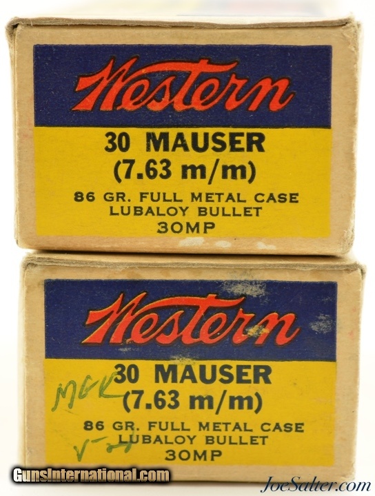 Description: This is a lot of two full boxes, 100 original rounds, of .30 Mauser (7.63 mm) ammunition manufactured by Western with 86 grain full metal case Lubaloy bullets. One box is in excellent condition with crisp grapics and light rub and edge wear and the other having a repairable separated side flap and both have writing on one edge flap. The cartridges are in excellent, as new, condition. A great shooter and collector lot.; SOLD |