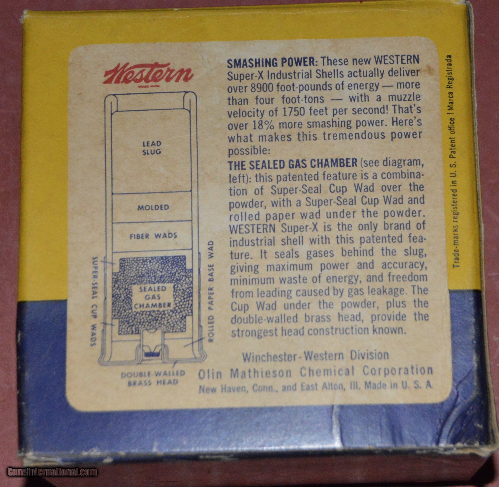 Description: A full box of Winchester 8 gauge industrial shotshells.Designed to knock scale out of industrial boilers and kilns,these shells are loaded with 3 oz.lead slugs.This box is in outstanding condition with bright graphics and the box showing almost no wear.I can't imagine what it sounded like when you fired one of these monsters into a kiln or boiler.A great unusual item for the Winchester collector. SOLD |