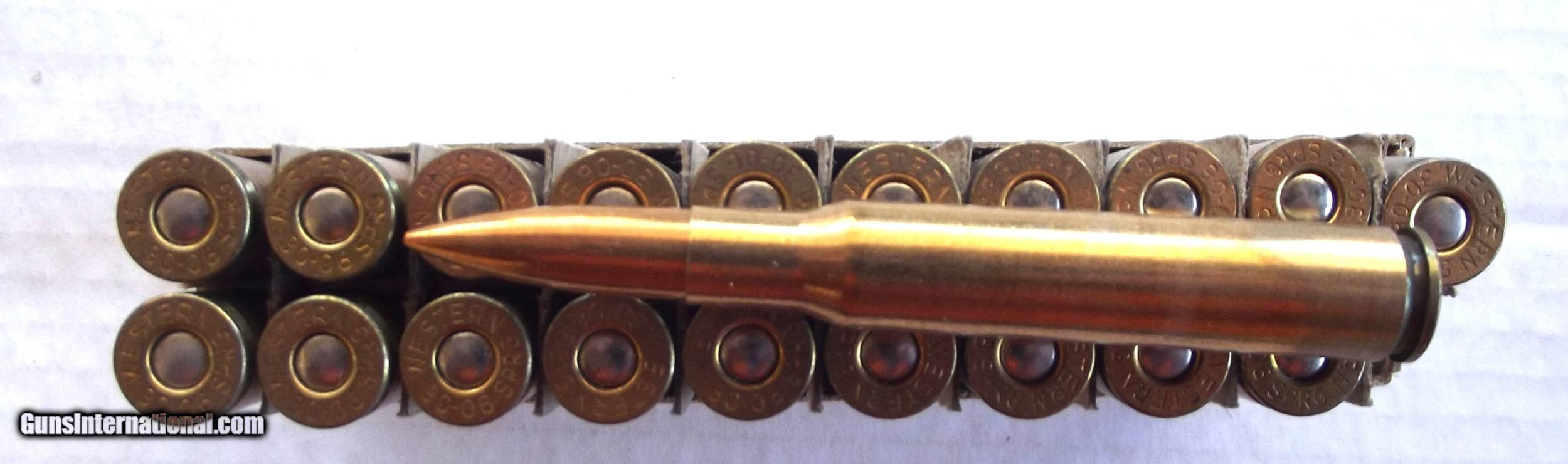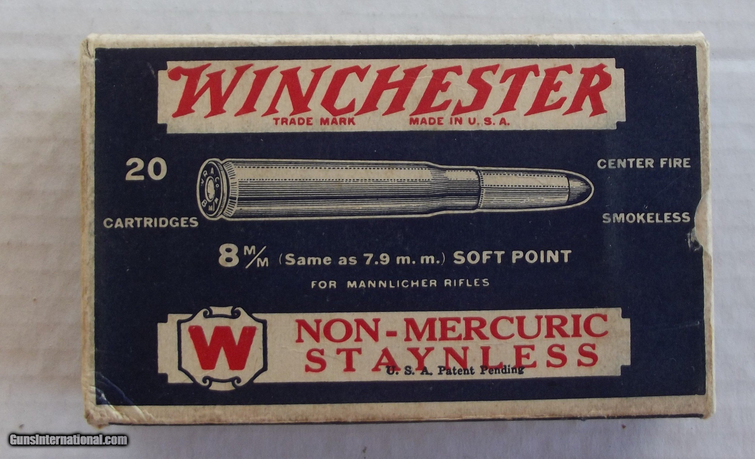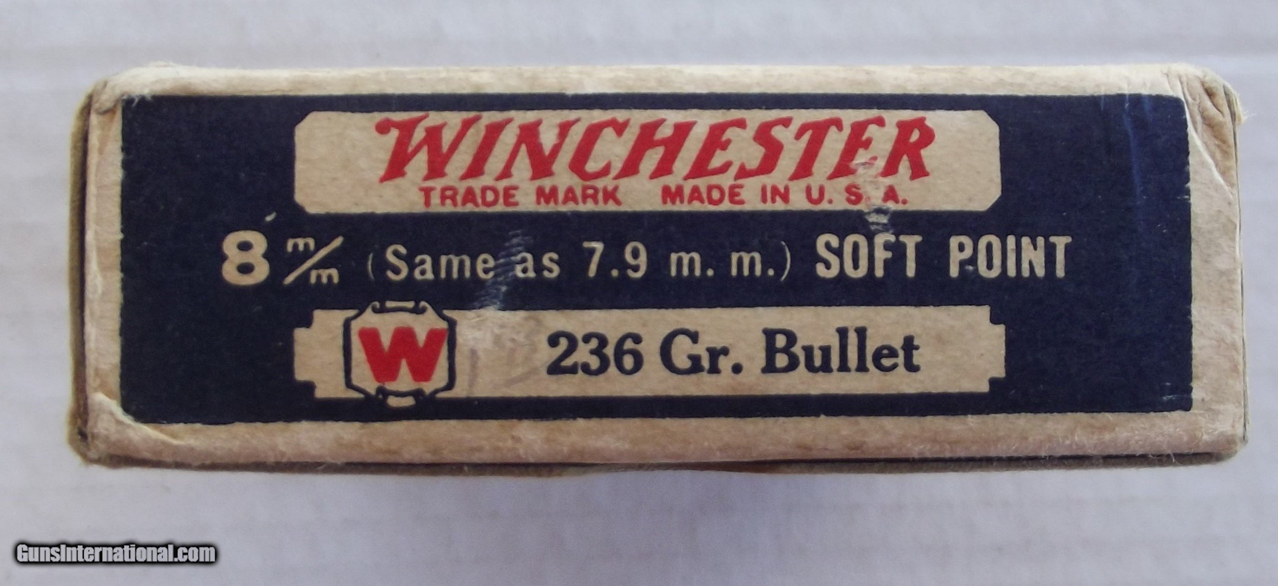 Description: Winchester 1928 Style Blue and White box, these were WInchester's first one piece rifle boxes that came out in 1928. This one is 1931 with the Non-Mercuric Staynless U S A Patent Pending. Box is full and correct. 8 mm (Same as 7.9 mm ) 236 Grain Soft Point Bullets for the Mannlicher Rifles, odd bullet weight. These have the "W.R.A. CO.", the last ones before they went to just WRA. $60.00 Western "Bullseye" 7 mm Mauser, 175 Grain Lubaloy Soft Point Boat Tail Bullets. Box is from the mid 1930's, full and correct. $45.00 Western "Super Match" 30-06 Springfield Match Ammunition, 180 Grain Full Metal Case Boat Tail Lubaloy Bullets, for Single Loading Only, full and correct. $45.00 The above sold as collectible ammunition, not shooting ammo. You must be legally able to possess and have me ship this to you. Should you have any questions please email me. UPS charges will be added, I do combine UPS costs should you purchase more than one item. Thanks SOLD Rifle Caliber: .30-06 Springfield |
