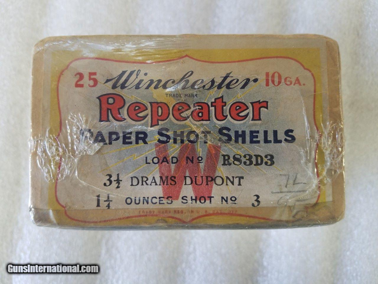 Description: Full box of 25, still sealed. !0 ga Repeater Paper shot shells. Yellow "lightning" label in very good cond. Only minor handling wear on the corners. Sealed in shrink wrap. From the estate of a very reputable Winchestor collector. Call with any questions. No Ca. sales. Please contact me with any offers. Thanks for looking. Free postage. SOLD |